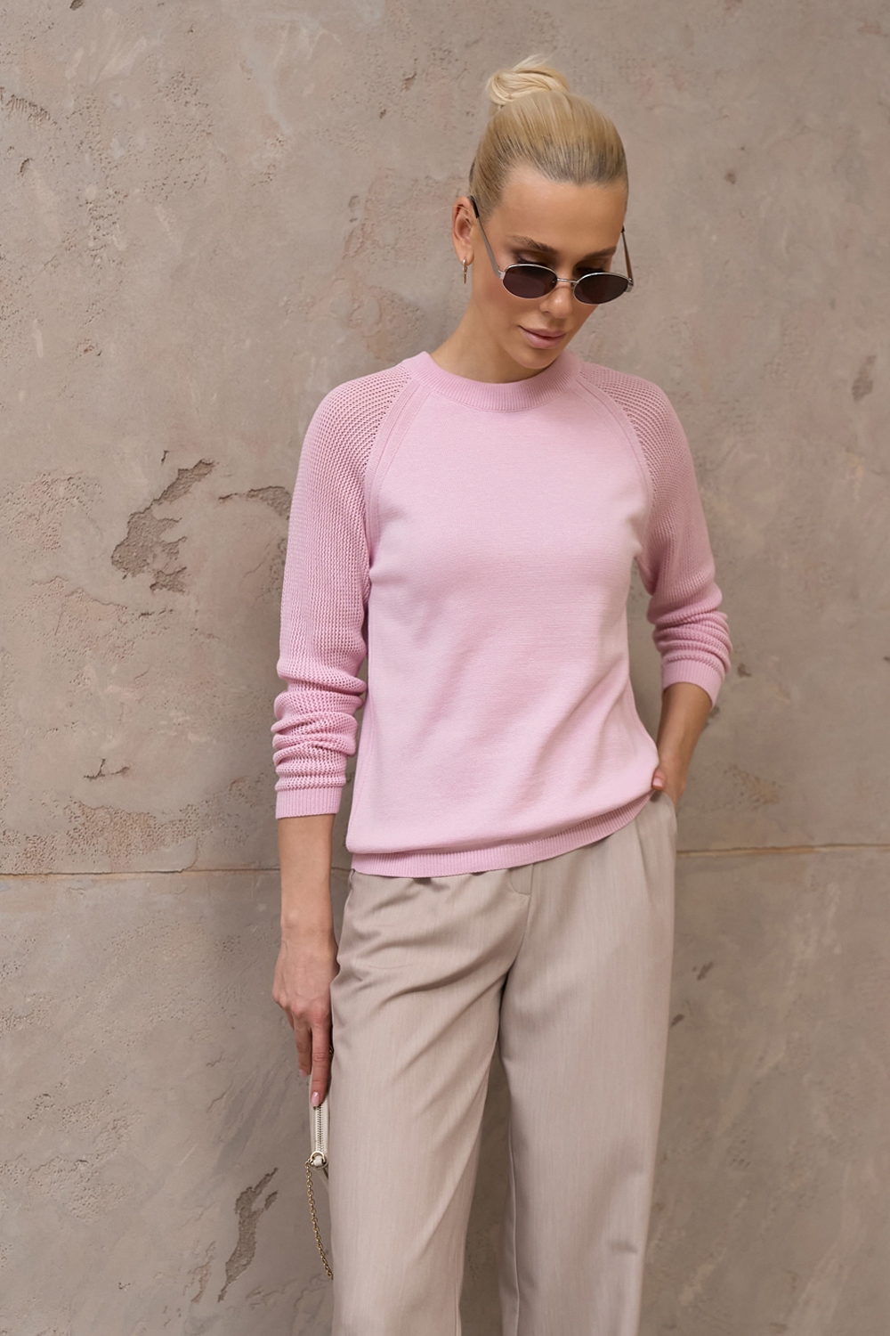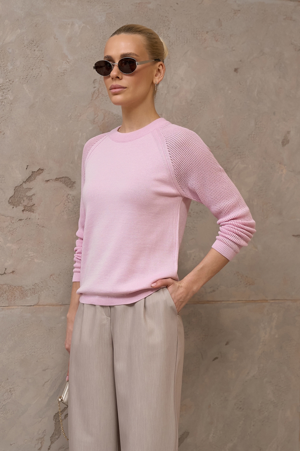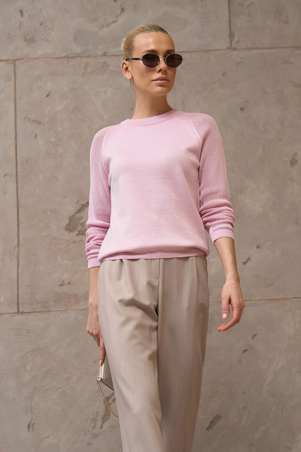 Витончений джемпер з акцентними ажурними рукавами. Модель виготовлена з бавовняної пряжі з додаванням віскози. Перед та спинка джемпера виконані в'язкою середньої щільності. Зручний рукав реглан.