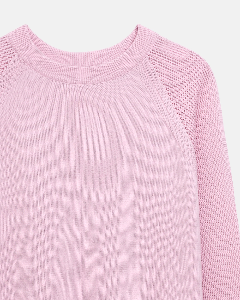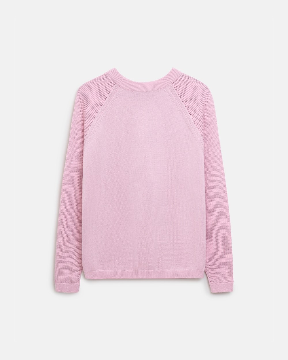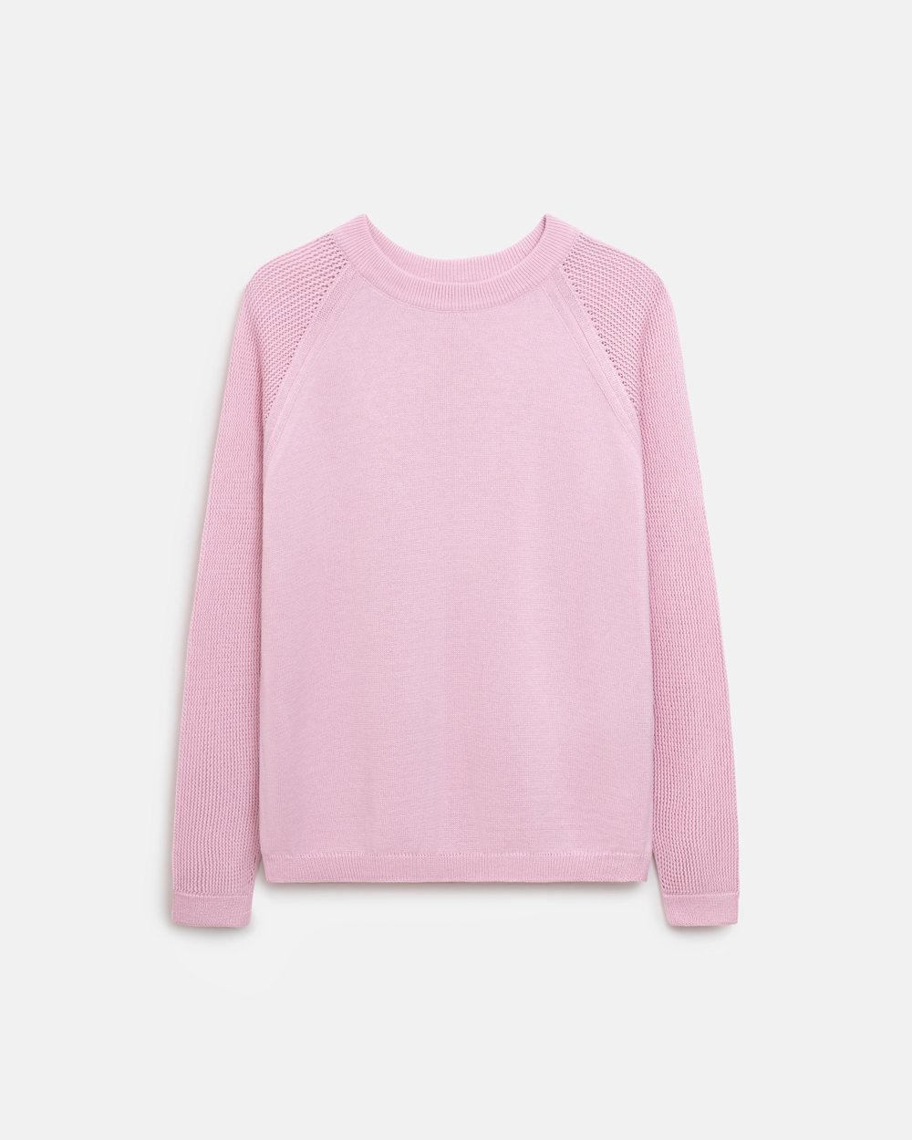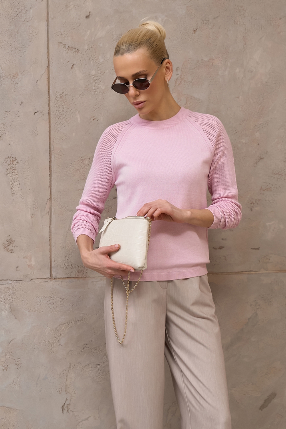 Витончений джемпер з акцентними ажурними рукавами. Модель виготовлена з бавовняної пряжі з додаванням віскози. Перед та спинка джемпера виконані в'язкою середньої щільності. Зручний рукав реглан.