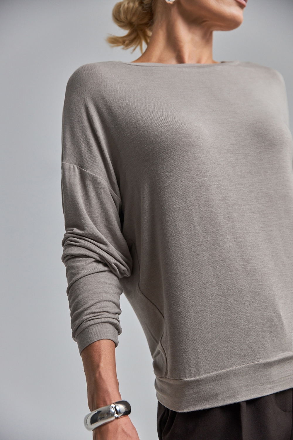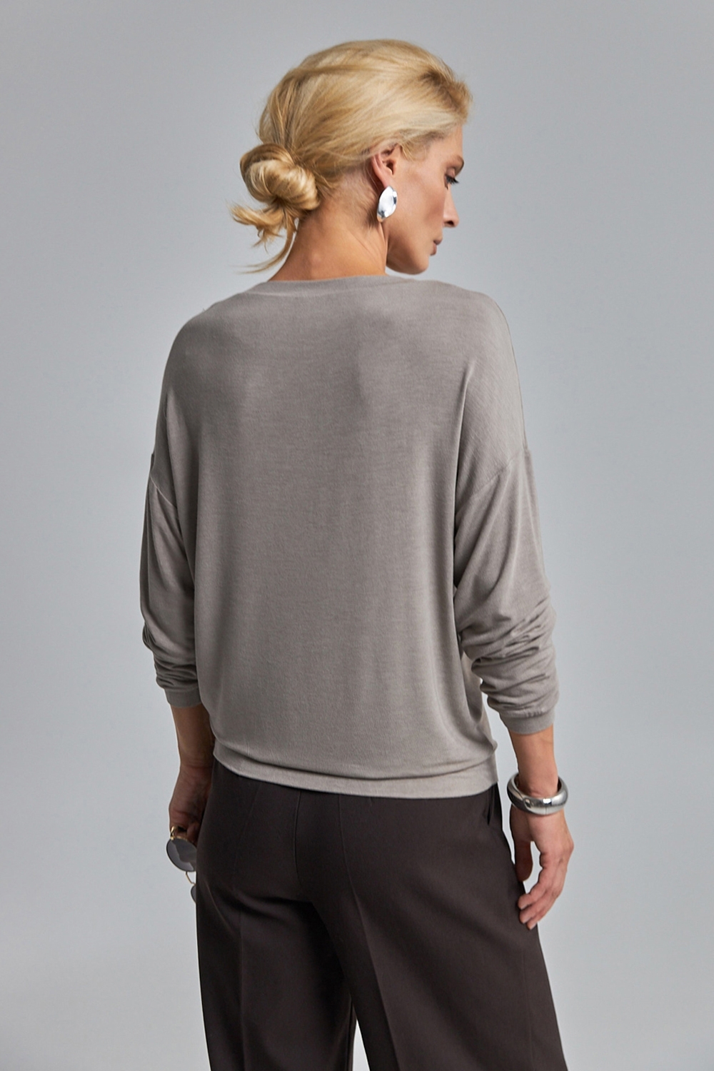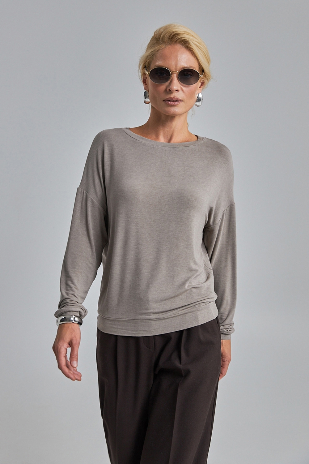 Лаконічний джемпер вільного силуету із м’якого, приємного на дотик трикотажу, що добре тягнеться та красиво драпірується.