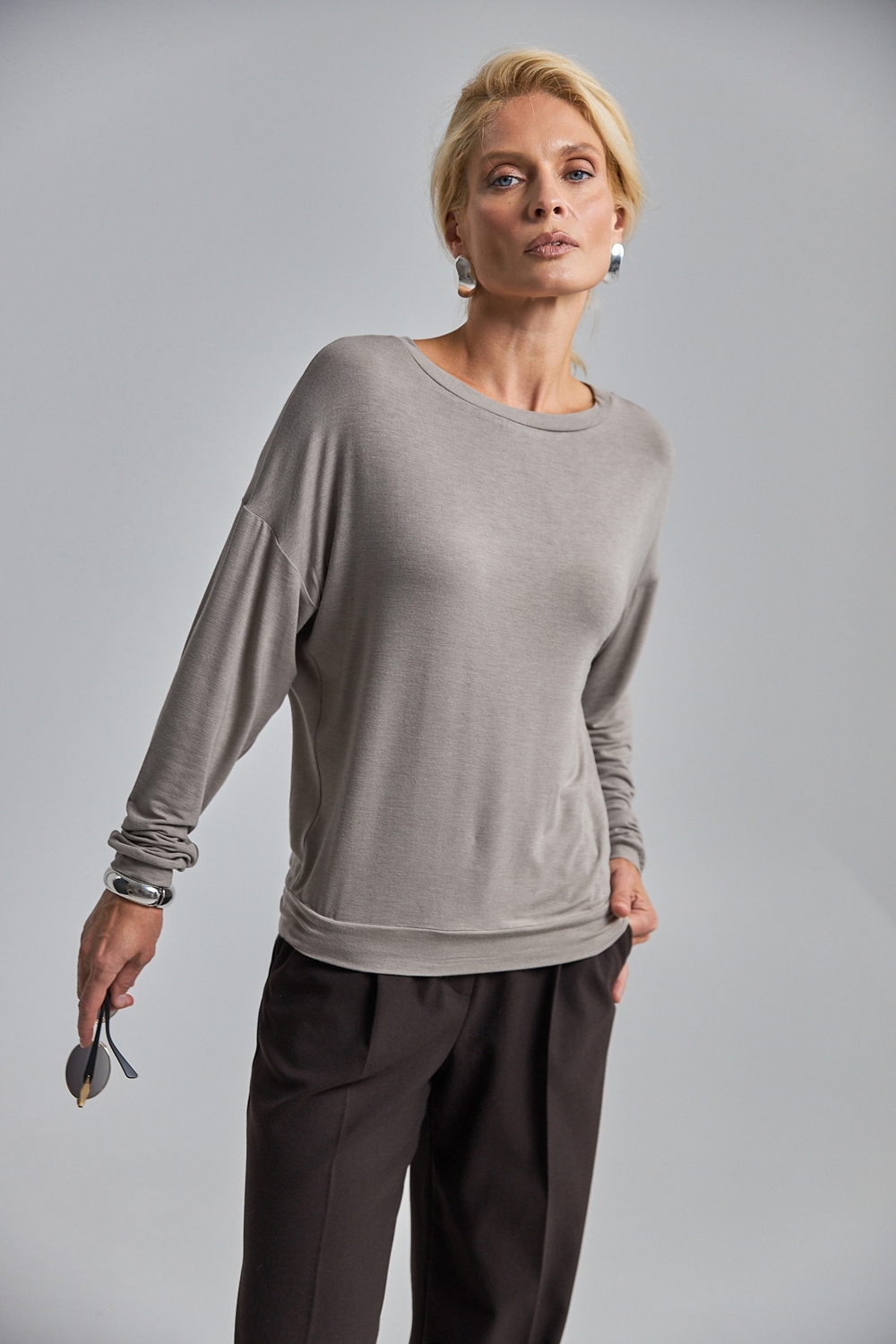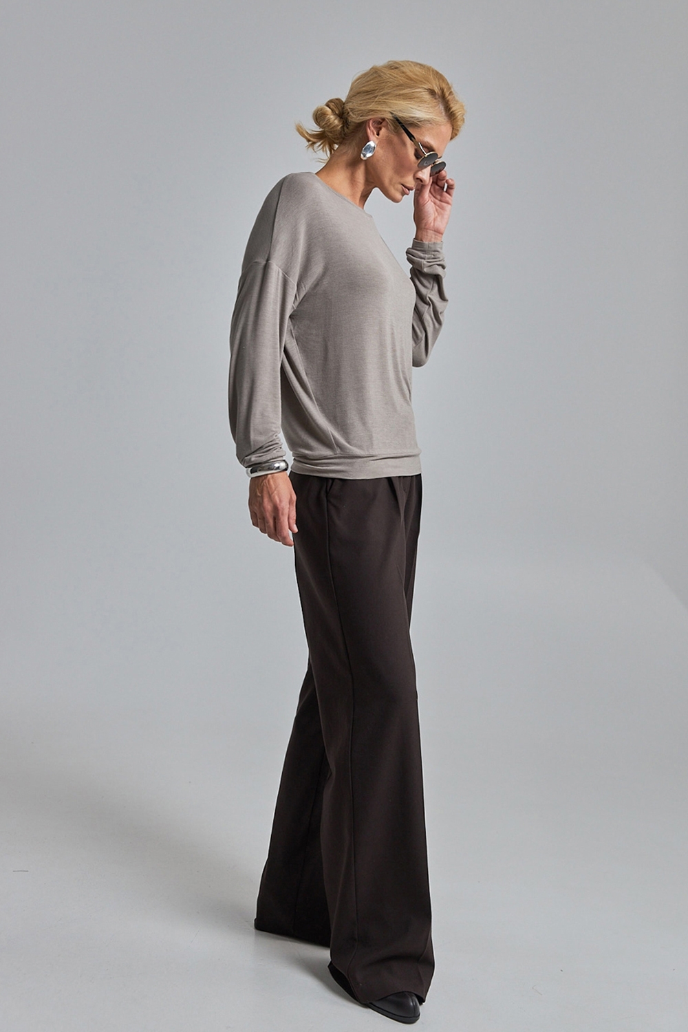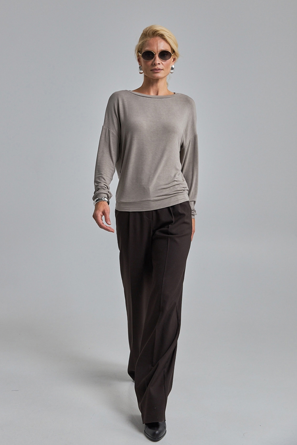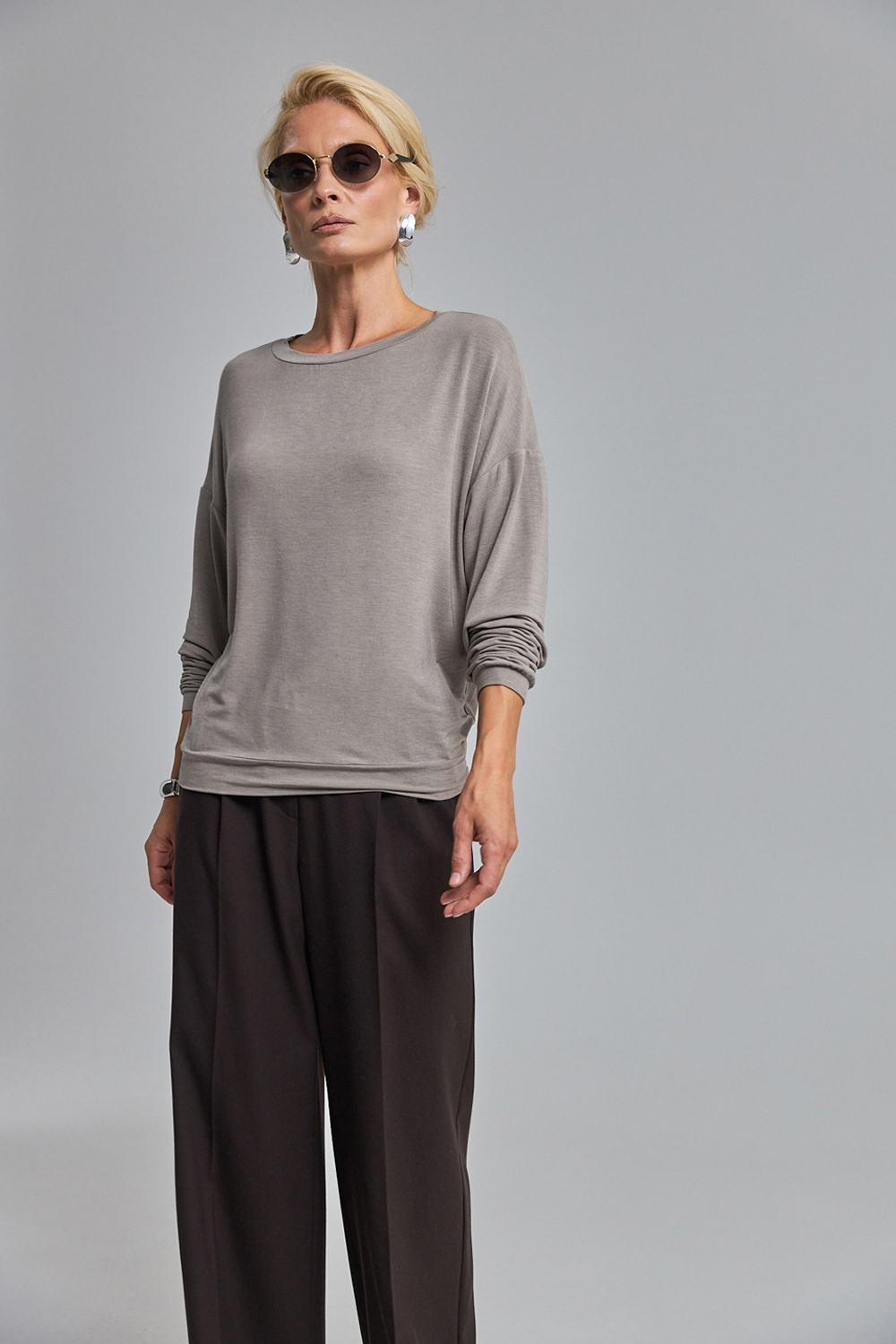 Лаконічний джемпер вільного силуету із м’якого, приємного на дотик трикотажу, що добре тягнеться та красиво драпірується.