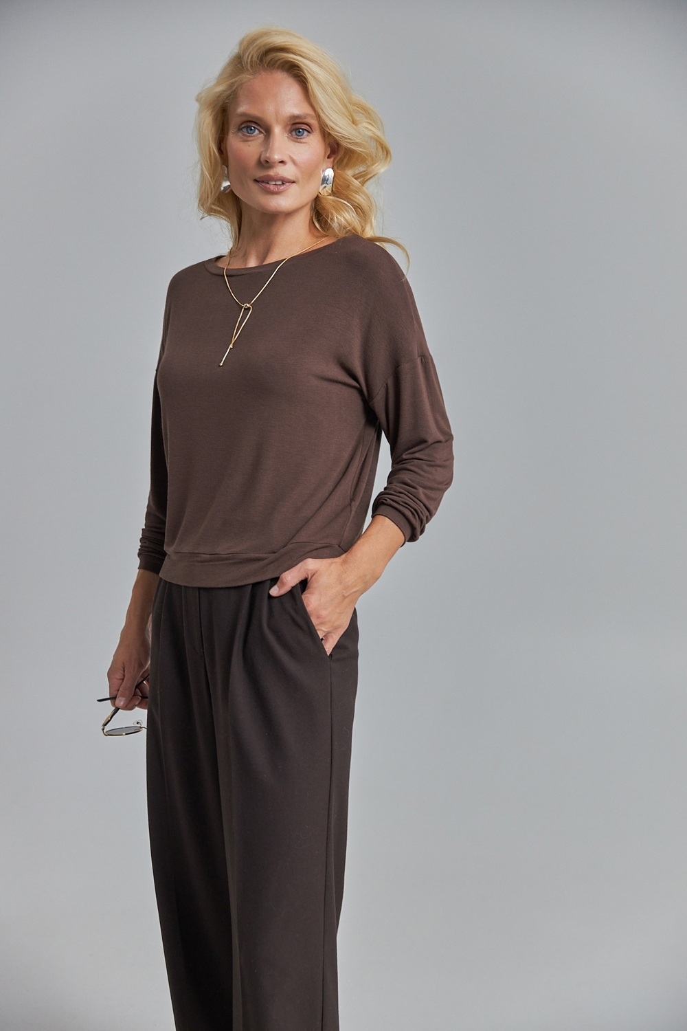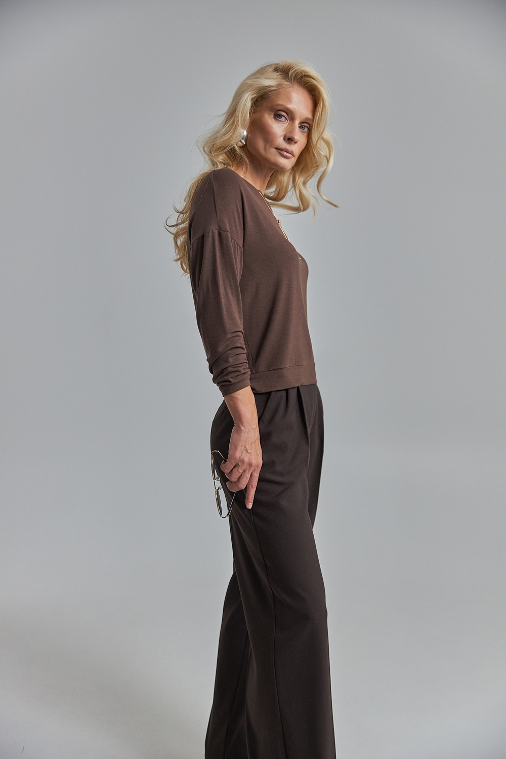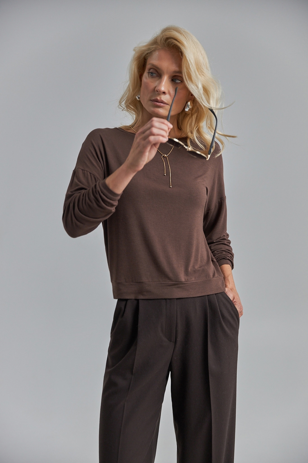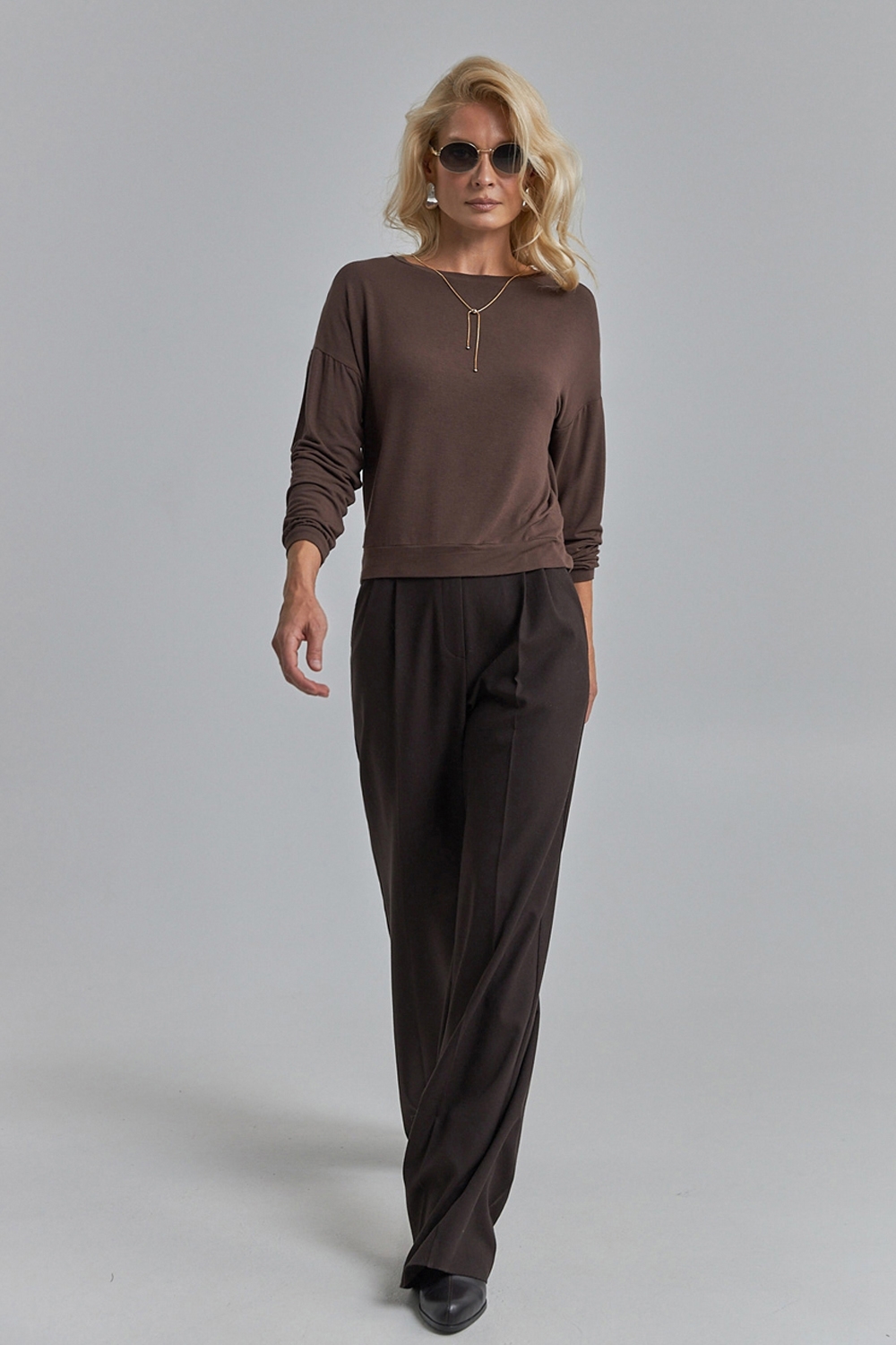 Лаконічний джемпер вільного силуету із м’якого, приємного на дотик трикотажу, що добре тягнеться та красиво драпірується.