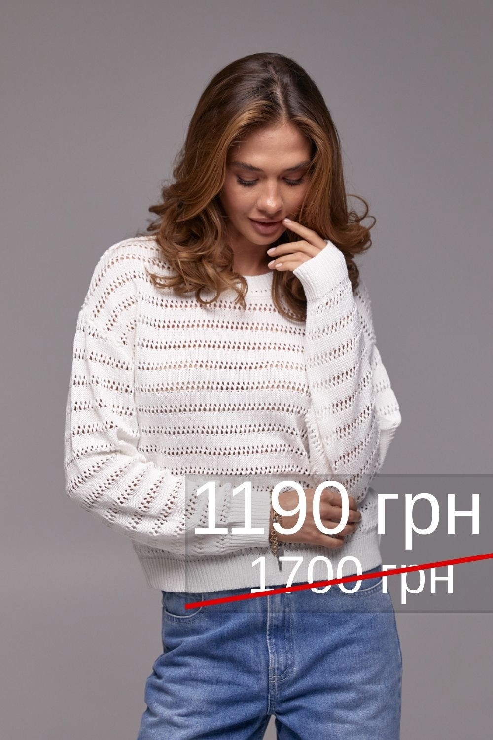 Ніжний джемпер з бавовняної пряжі оздоблений ажурними горизонтальними лініями. Легкий оверсайз, зручні резинки на манжетах, поясі та горловині.