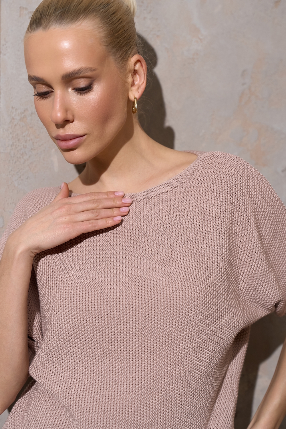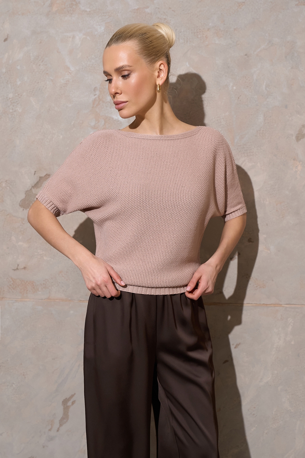Бавовняний джемпер із лаконічною горловиною човник. Виконаний фактурною в'язкою середньої щільності, м'який та приємний до тіла. Комфортний рукав "летюча миша". По низу виробу фіксуючий манжет-резинка.