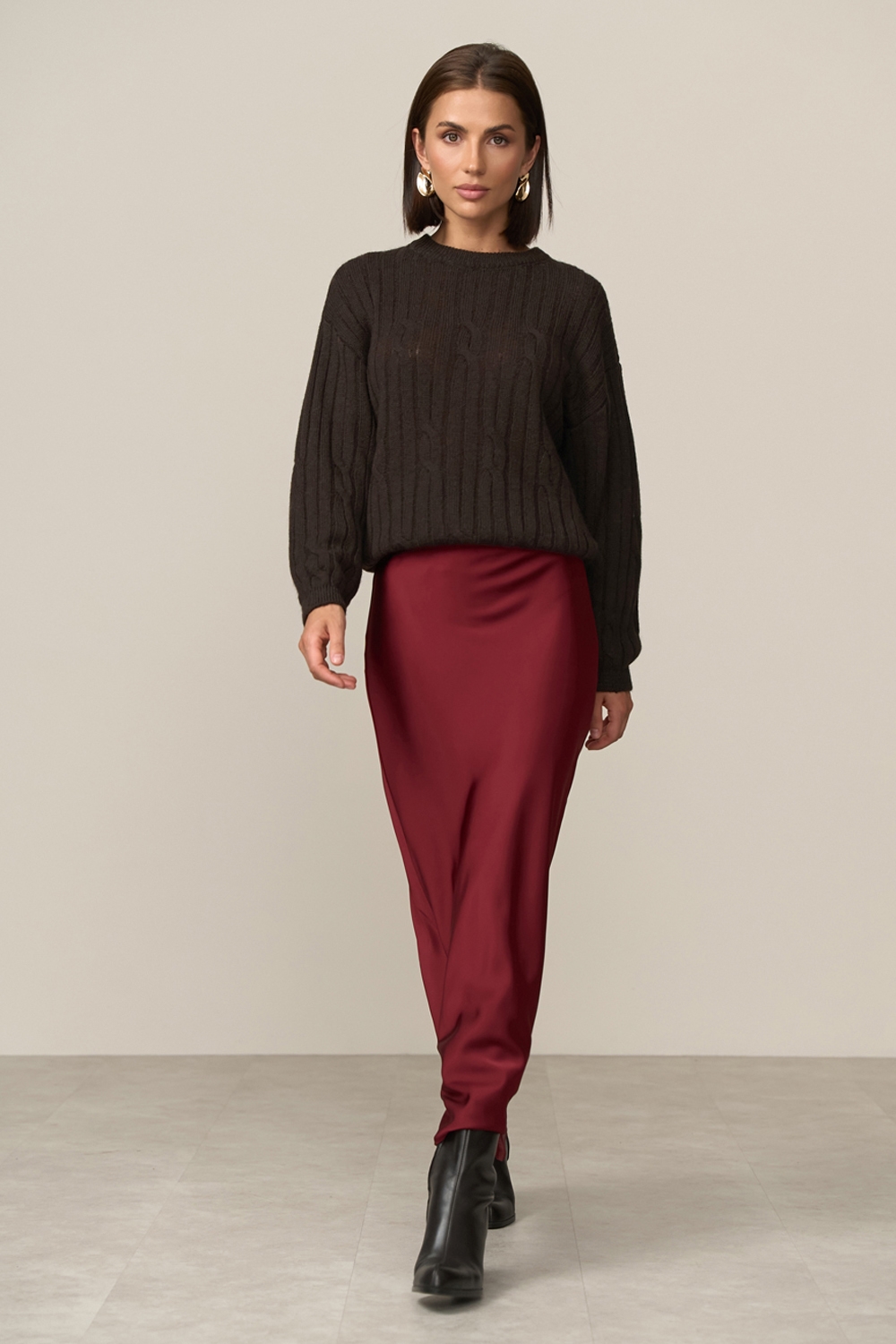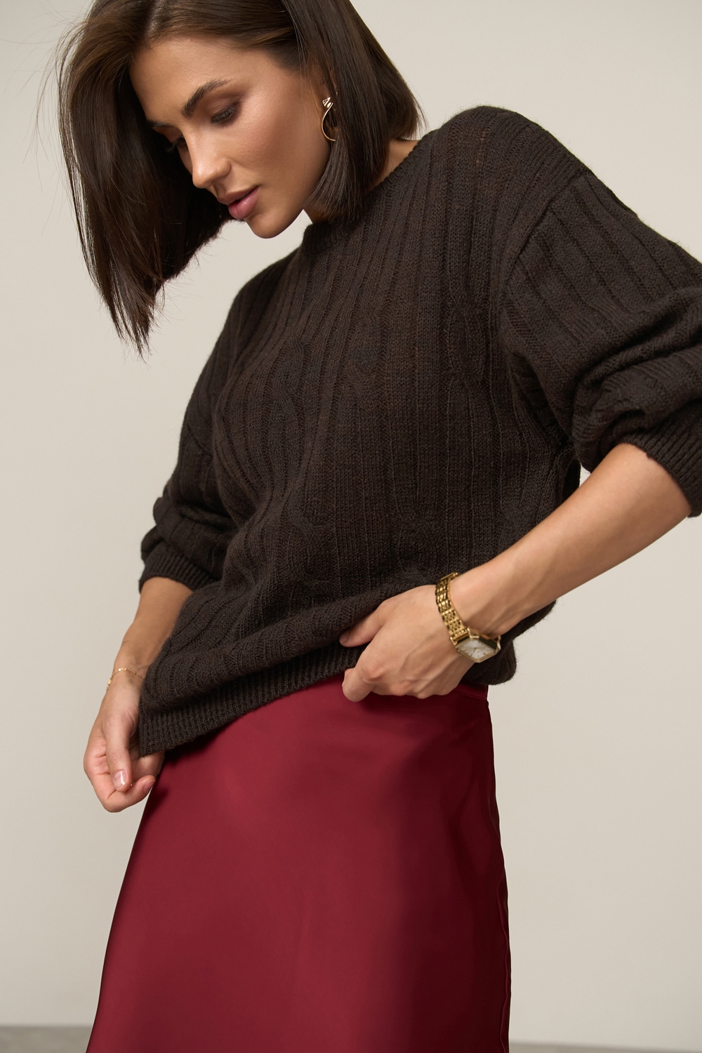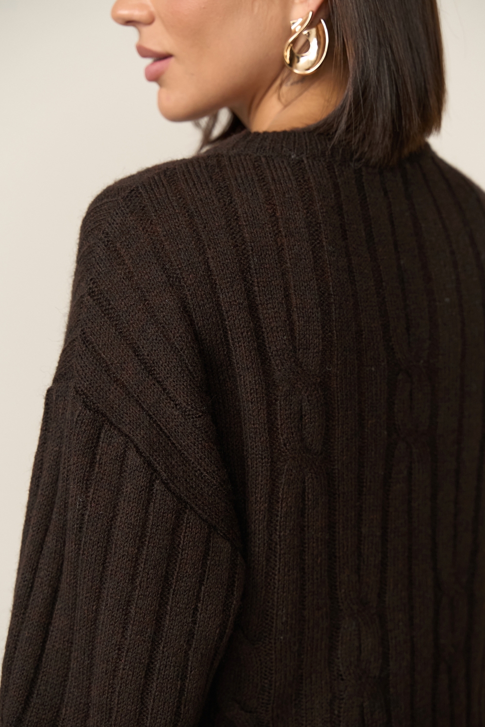 Стильний об’ємний джемпер із преміальної вовни. Напівпрозора, тонка, фактурна в’язка з елегантним візерунком «коси». Спущена лінія плеча створює невимушений силует. Манжети рукавів і низ виробу оформлені фіксуючою резинкою.