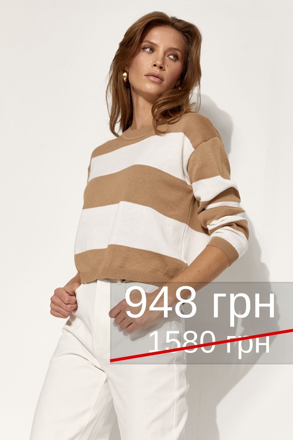 Базовий джемпер у смужку з натуральної пряжі з включенням бавовни та віскози. Виріб вільного силуету зі спущеною лінією плеча.