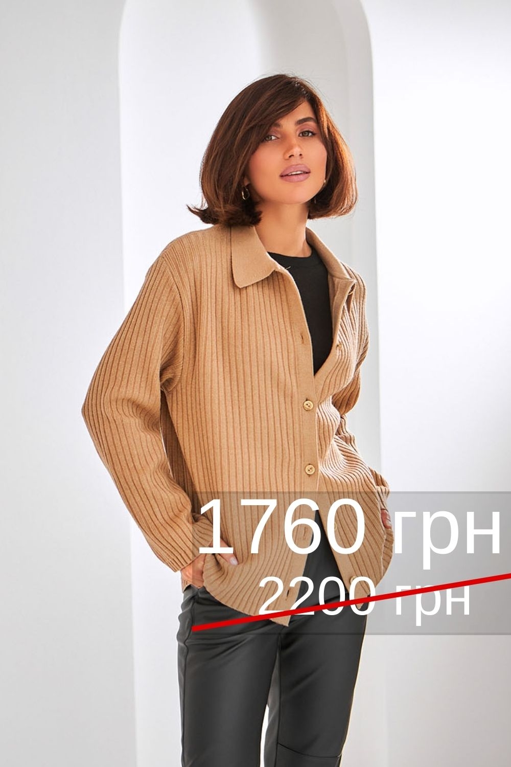 Трендова модель року - в'язаний кардиган-сорочка в рубчик з натуральної, ніжної, приємної до тіла пряжі з еластаном. Сорочка-кардиган має вертикальну застібку на гудзики в тон. В'язана сорочка може одягатися самостійно або виконувати роль жакета в багатошаровому комплекті.