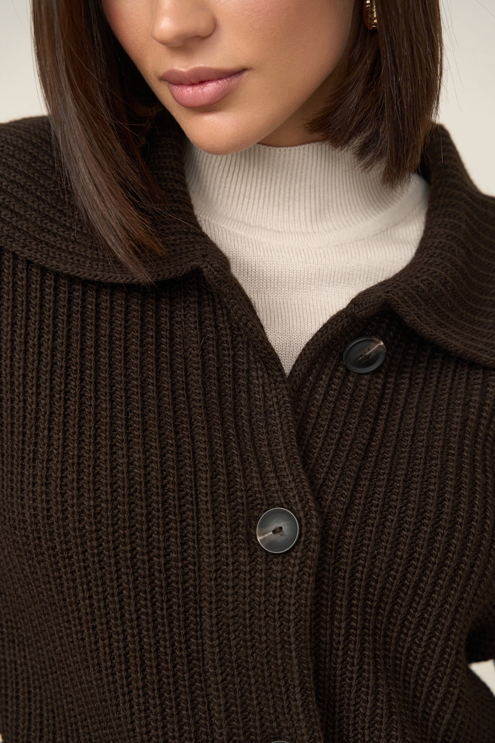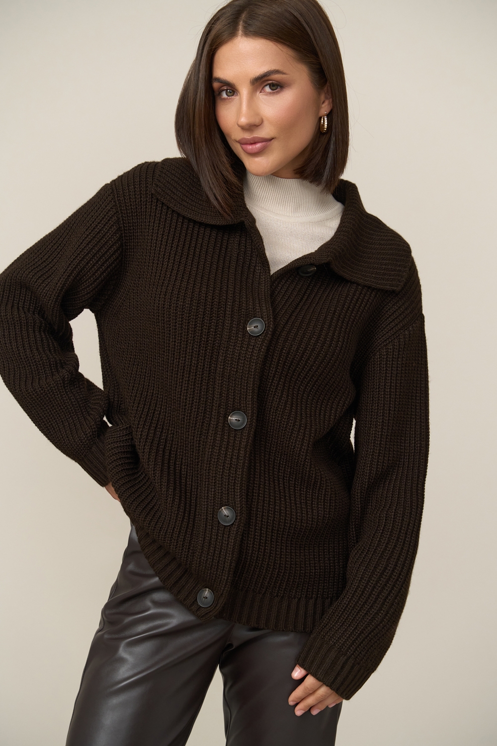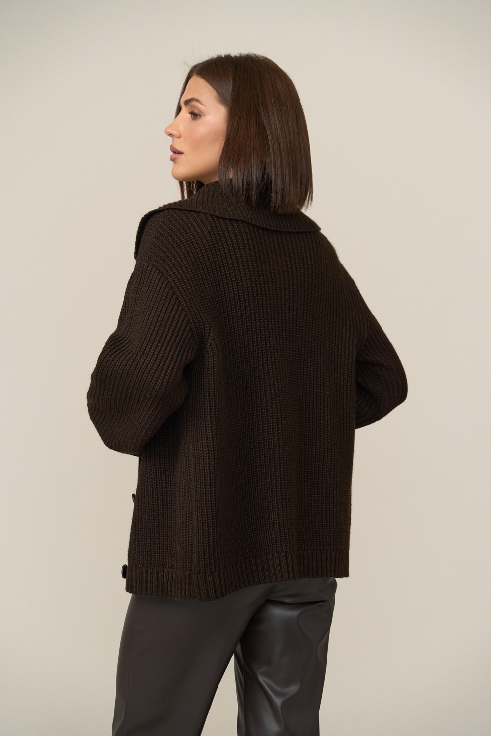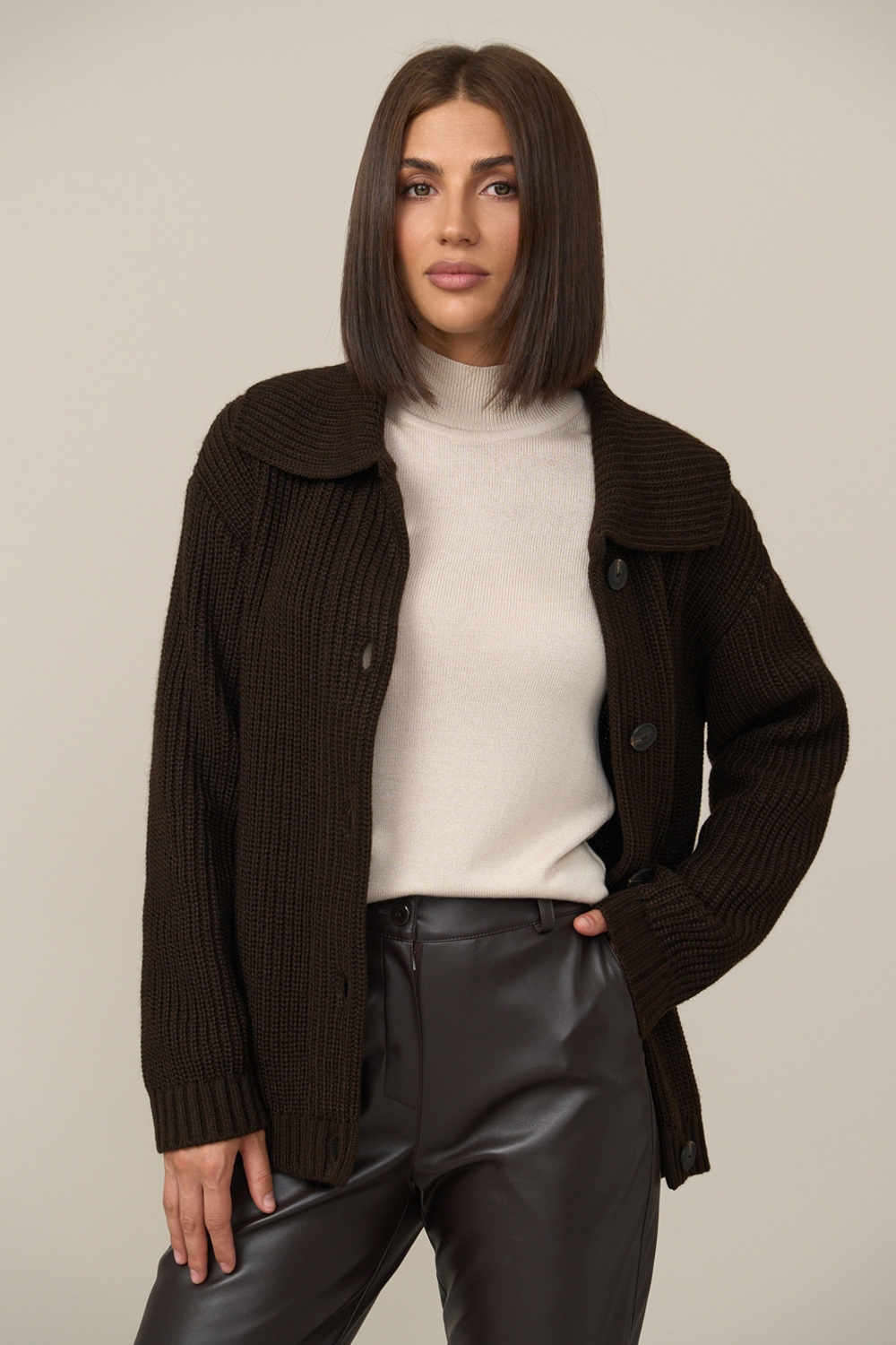 Актуальний кардиган із м'якої напіввовняної пряжі виконаний щільної, стабільною в'язкою. Модель комфортного вільного силуету.