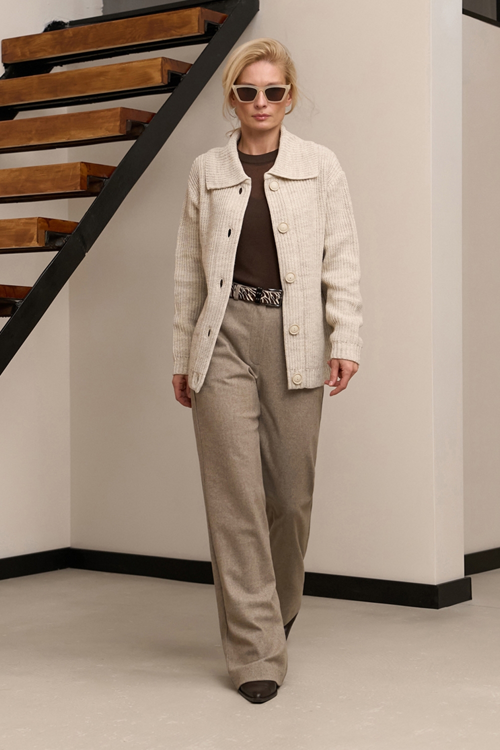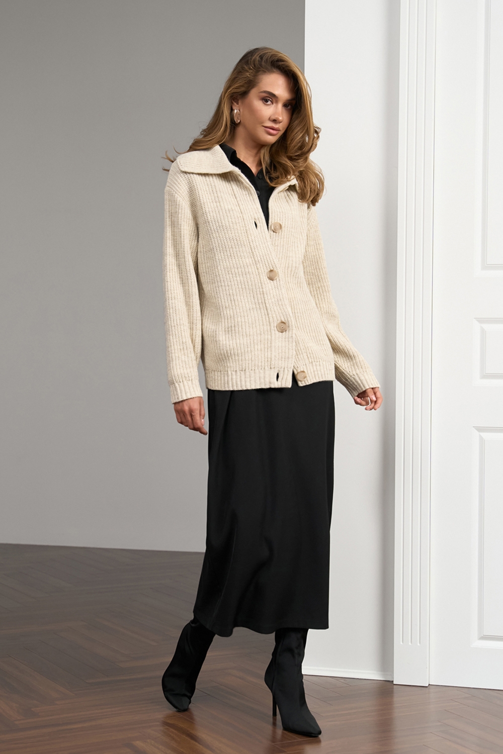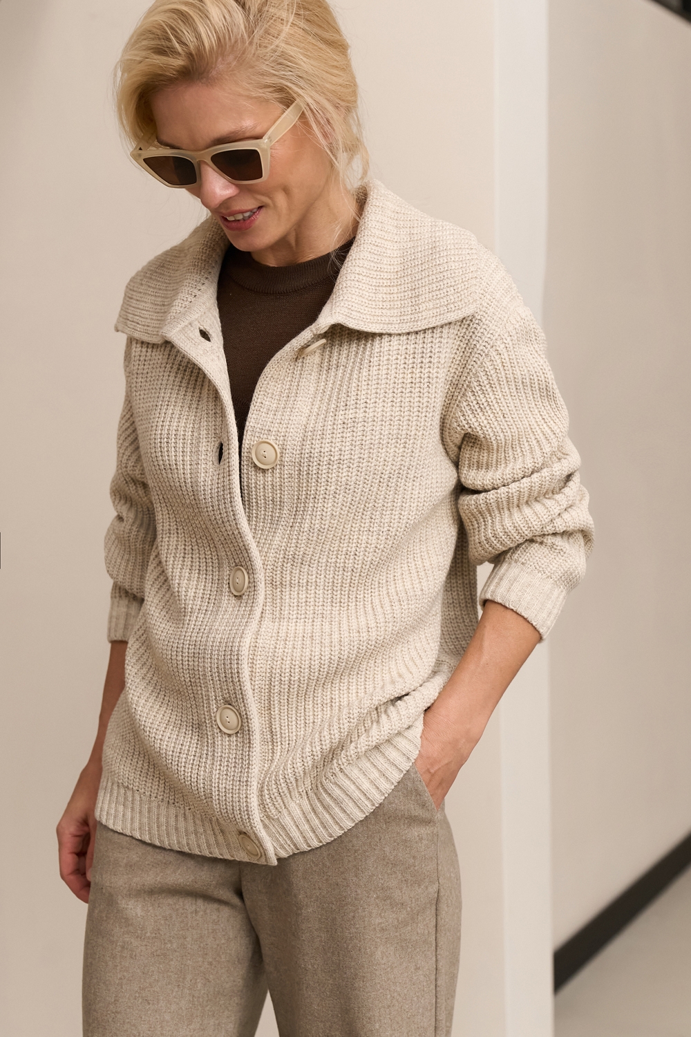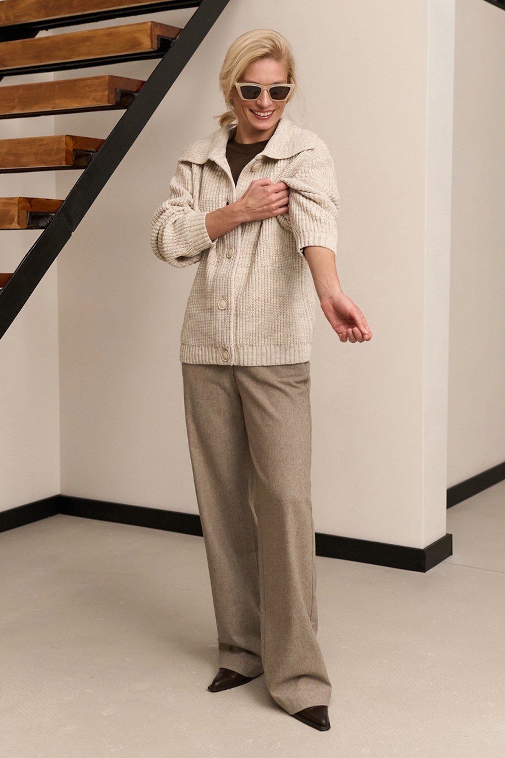 Актуальний кардиган із м'якої напіввовняної пряжі виконаний щільної, стабільною в'язкою. Модель комфортного вільного силуету.