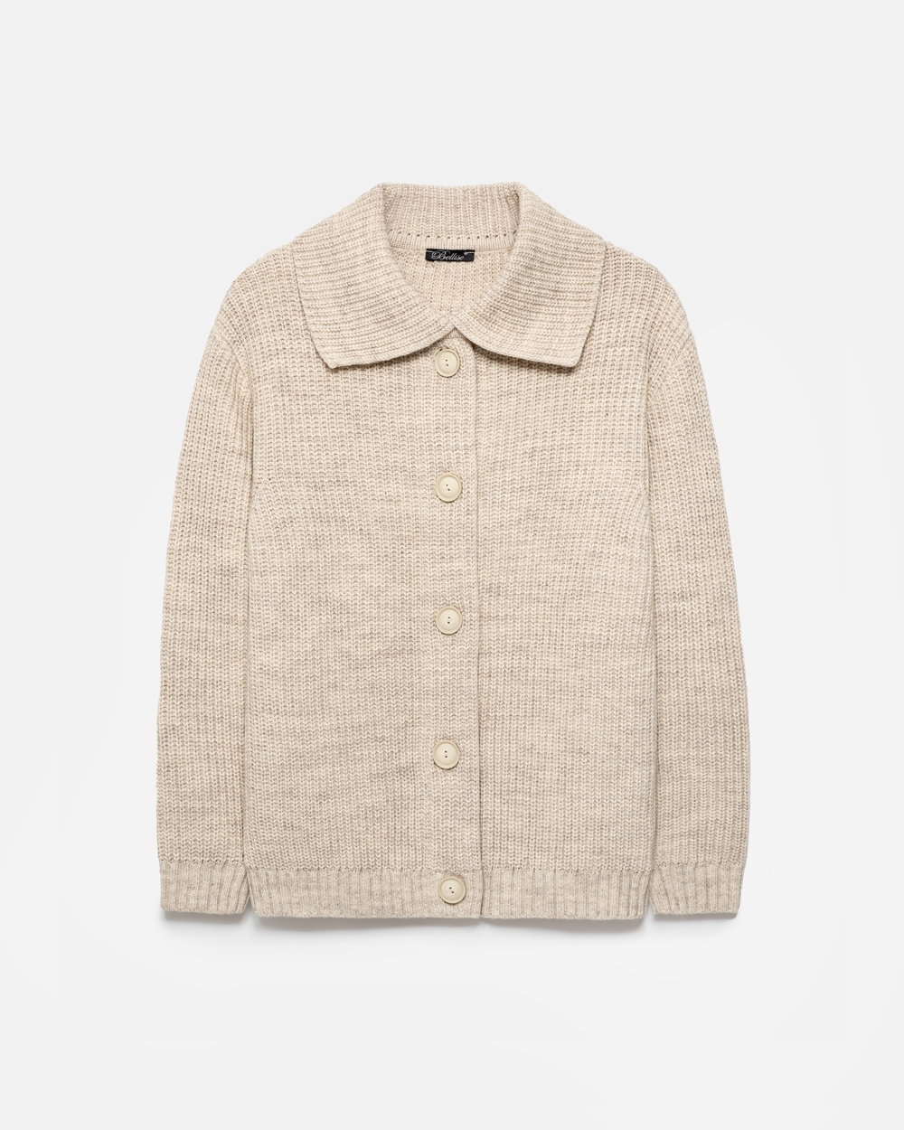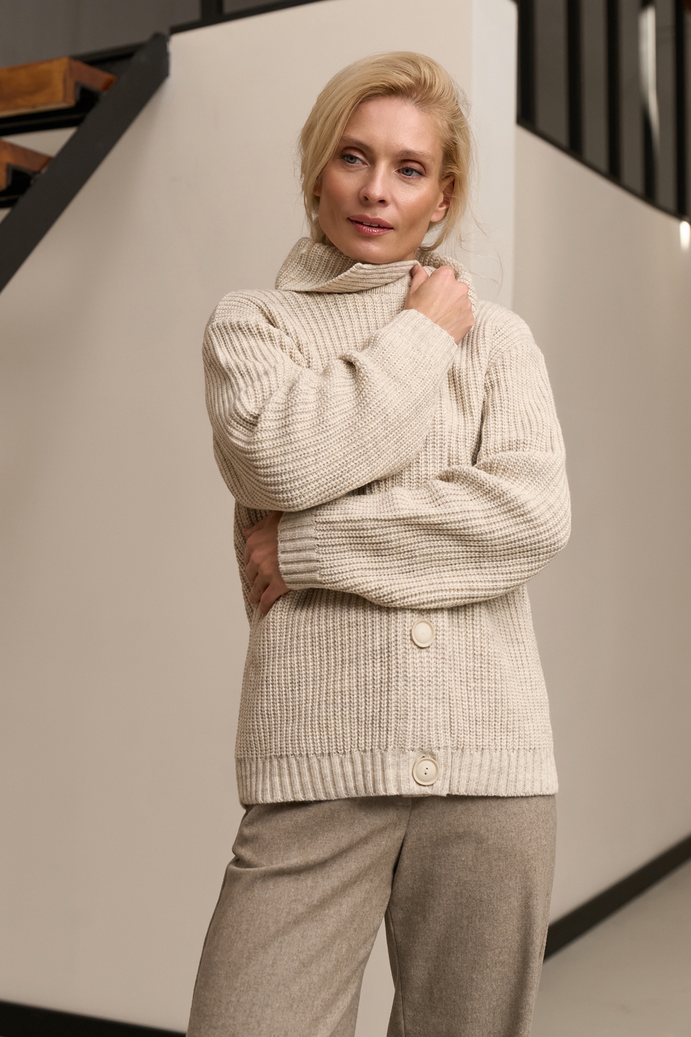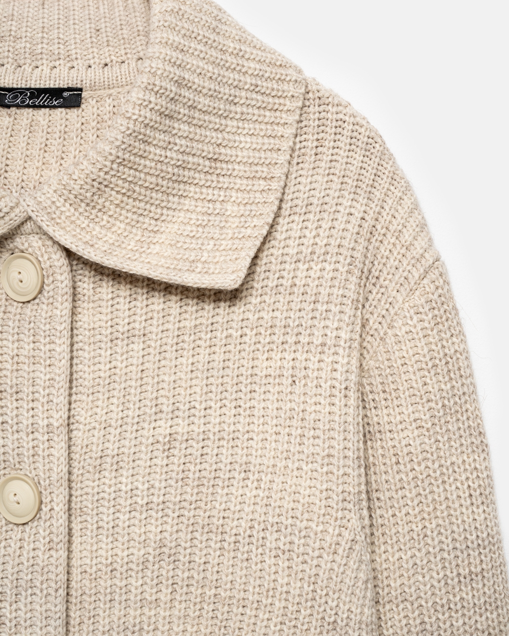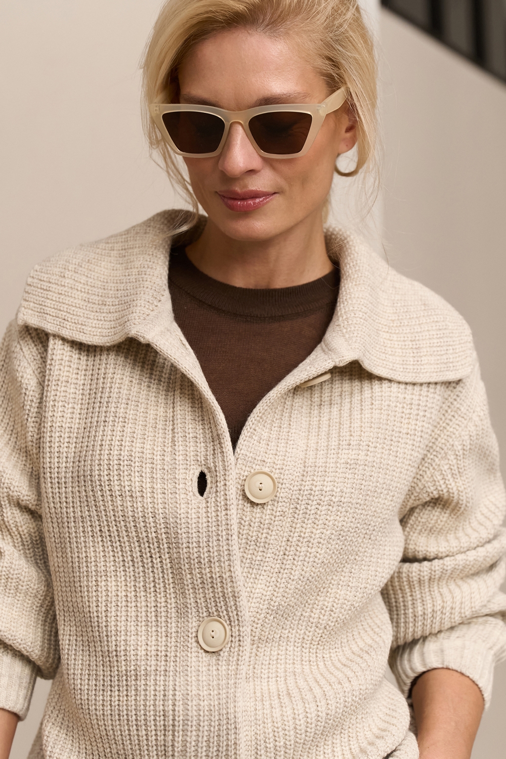 Актуальний кардиган із м'якої напіввовняної пряжі виконаний щільної, стабільною в'язкою. Модель комфортного вільного силуету.