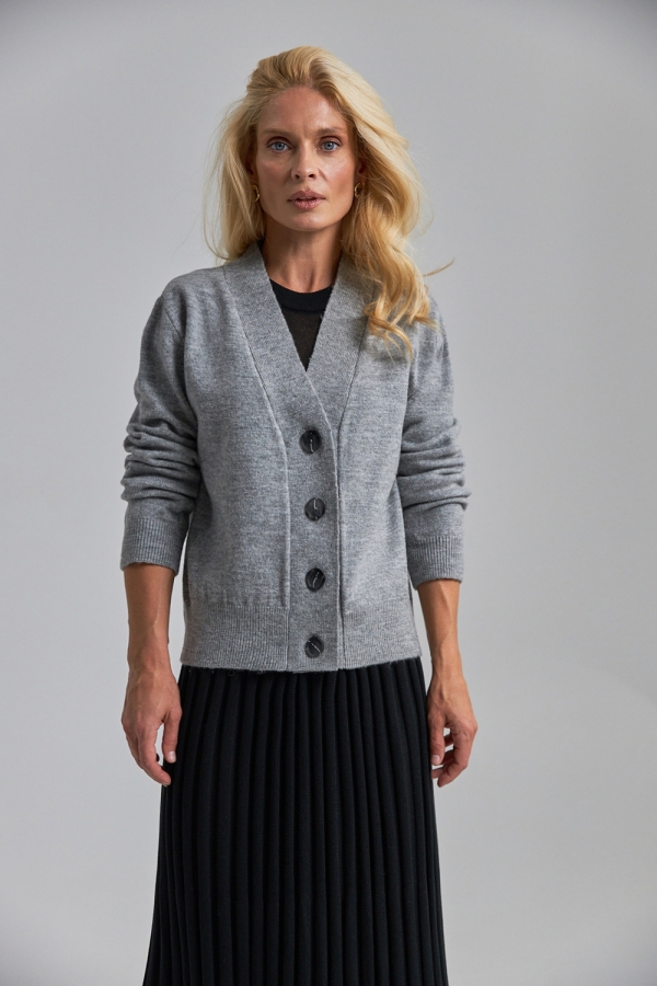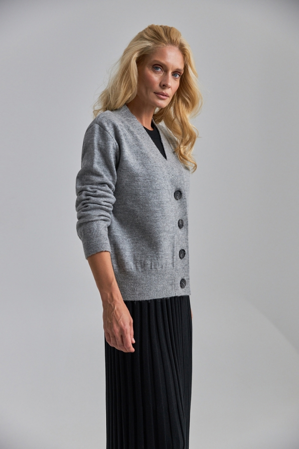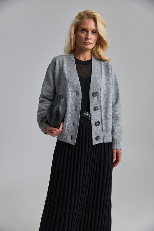 Вишуканий кардиган виготовлений із преміальної пряжі із високим вмістом вовни мериноса та мохеру Виріб виконаний стабільним плетінням середньої щільності та має чудову еластичність. Зручний об'ємний силует. Горловина та низ кардигана оформлені широким манжетом.