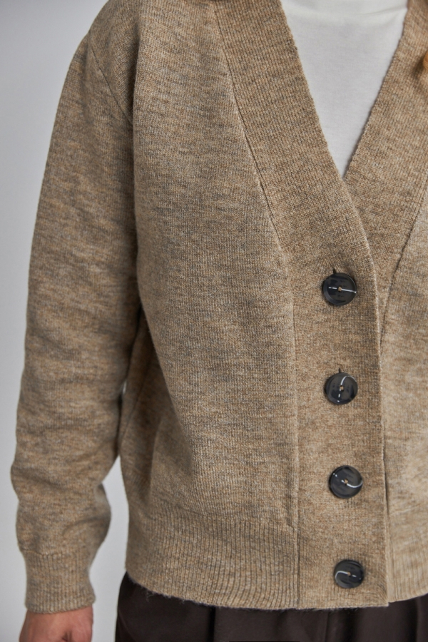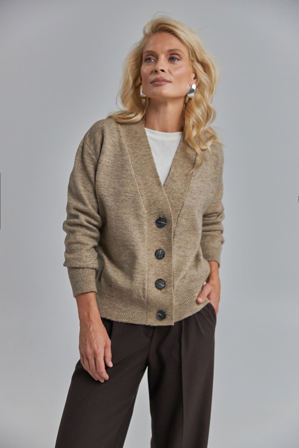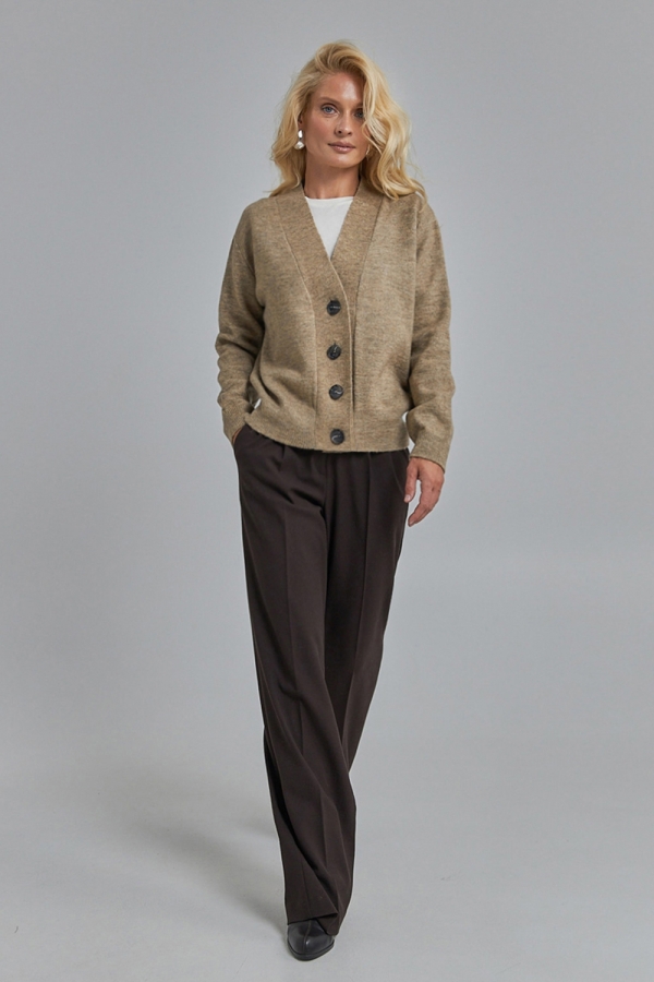 Вишуканий кардиган виготовлений із преміальної пряжі із високим вмістом вовни мериноса та мохеру Виріб виконаний стабільним плетінням середньої щільності та має чудову еластичність. Зручний об'ємний силует. Горловина та низ кардигана оформлені широким манжетом.