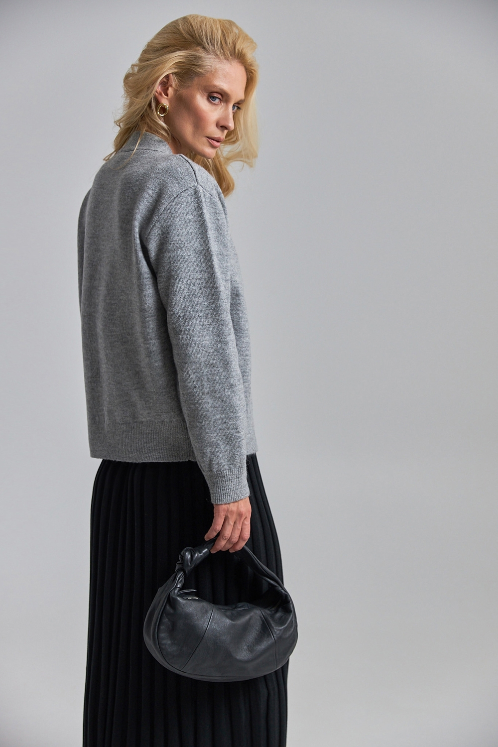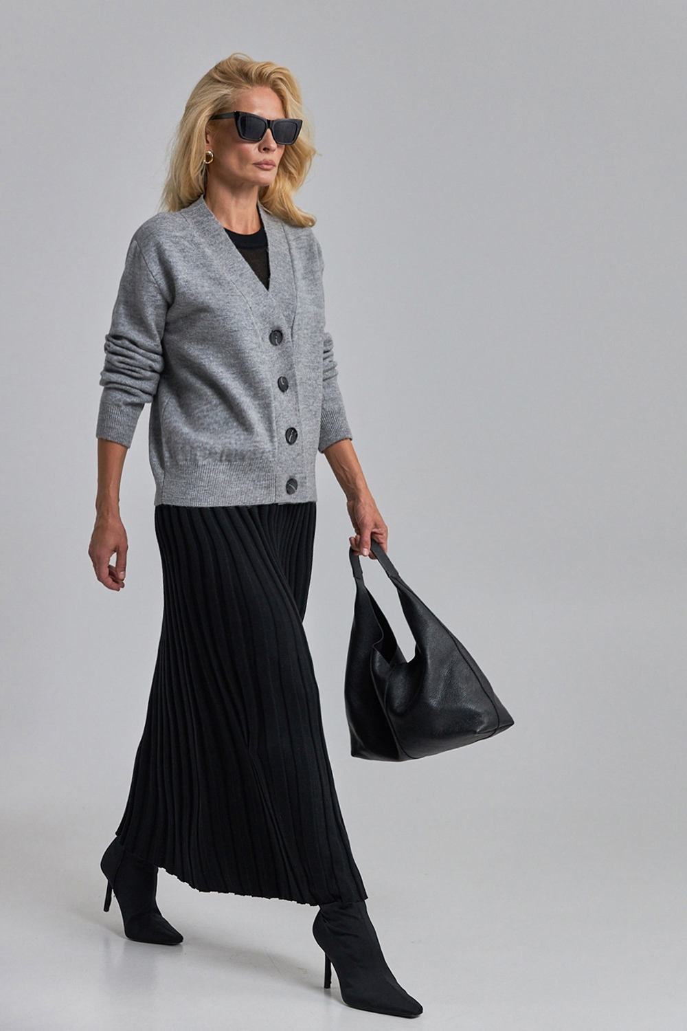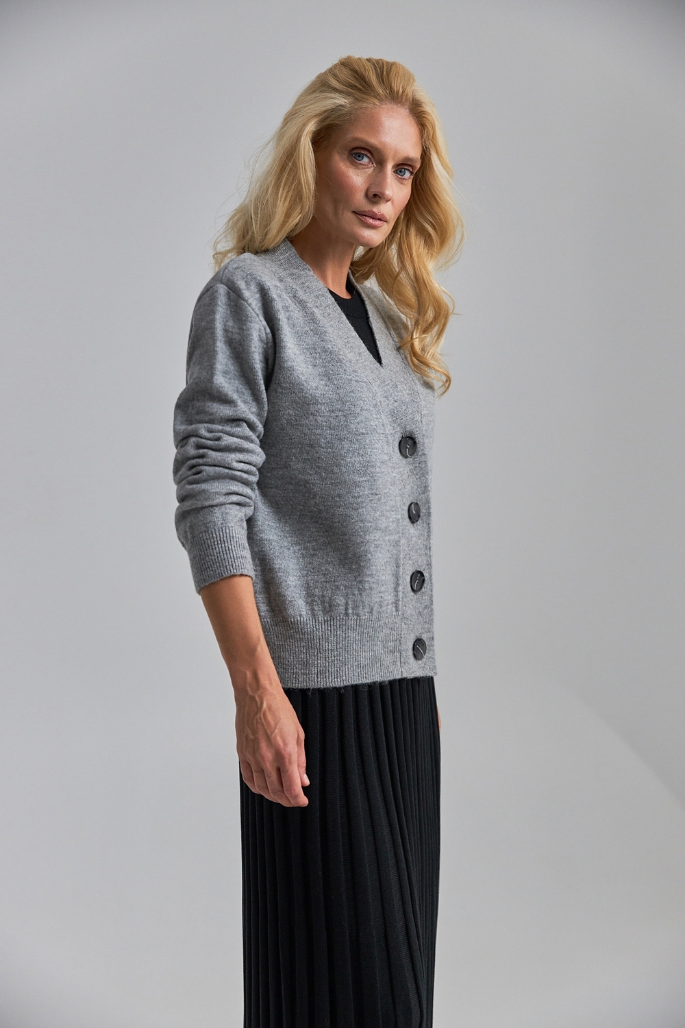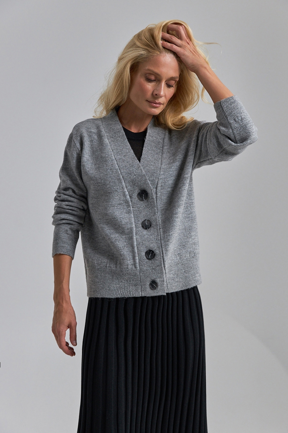 Вишуканий кардиган виготовлений із преміальної пряжі із високим вмістом вовни мериноса та мохеру Виріб виконаний стабільним плетінням середньої щільності та має чудову еластичність. Зручний об'ємний силует. Горловина та низ кардигана оформлені широким манжетом.