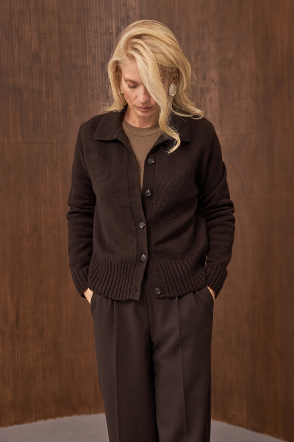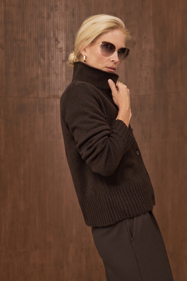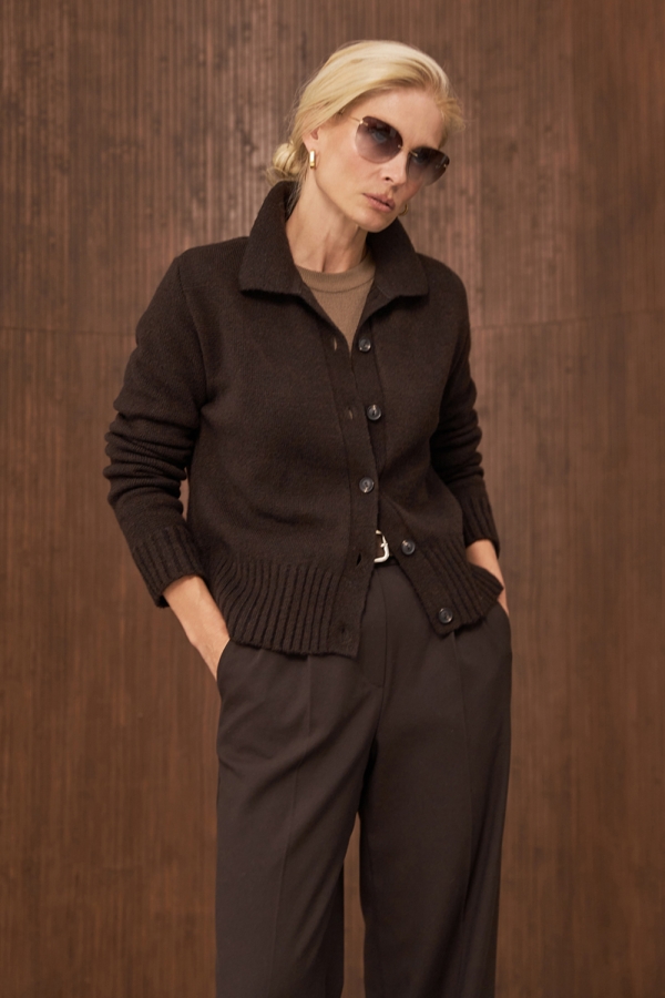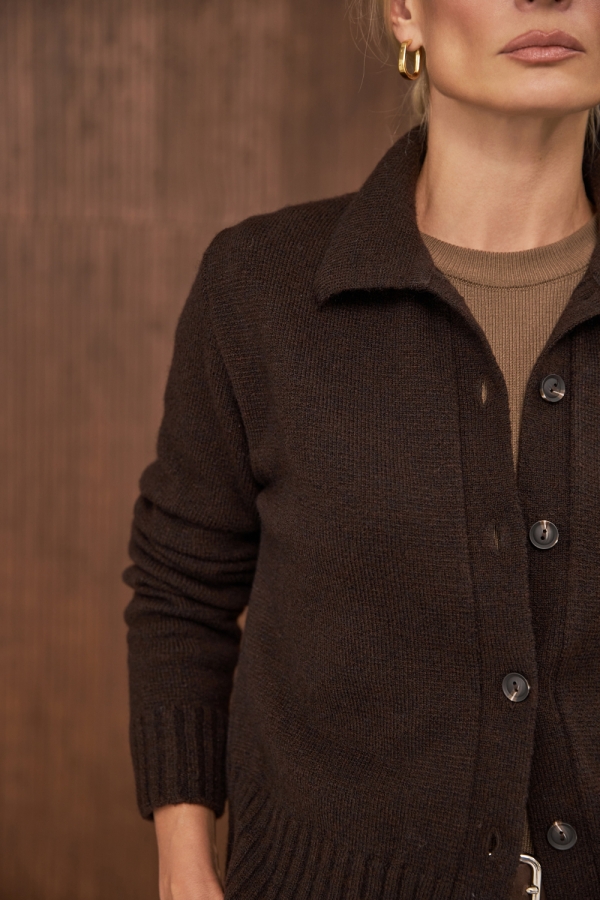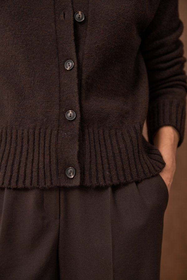 Класичний кардиган прямого силуету виконанний щільним плетінням із преміальної пряжі з високим вмістом вовни та мохеру. Виріб чудово тягнеться, м'який та приємний до тіла. Низ виробу та манжети оформленні широкою в'язкою-резинкою.