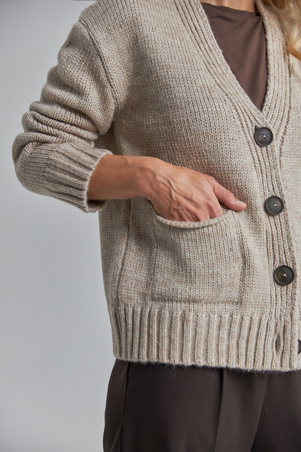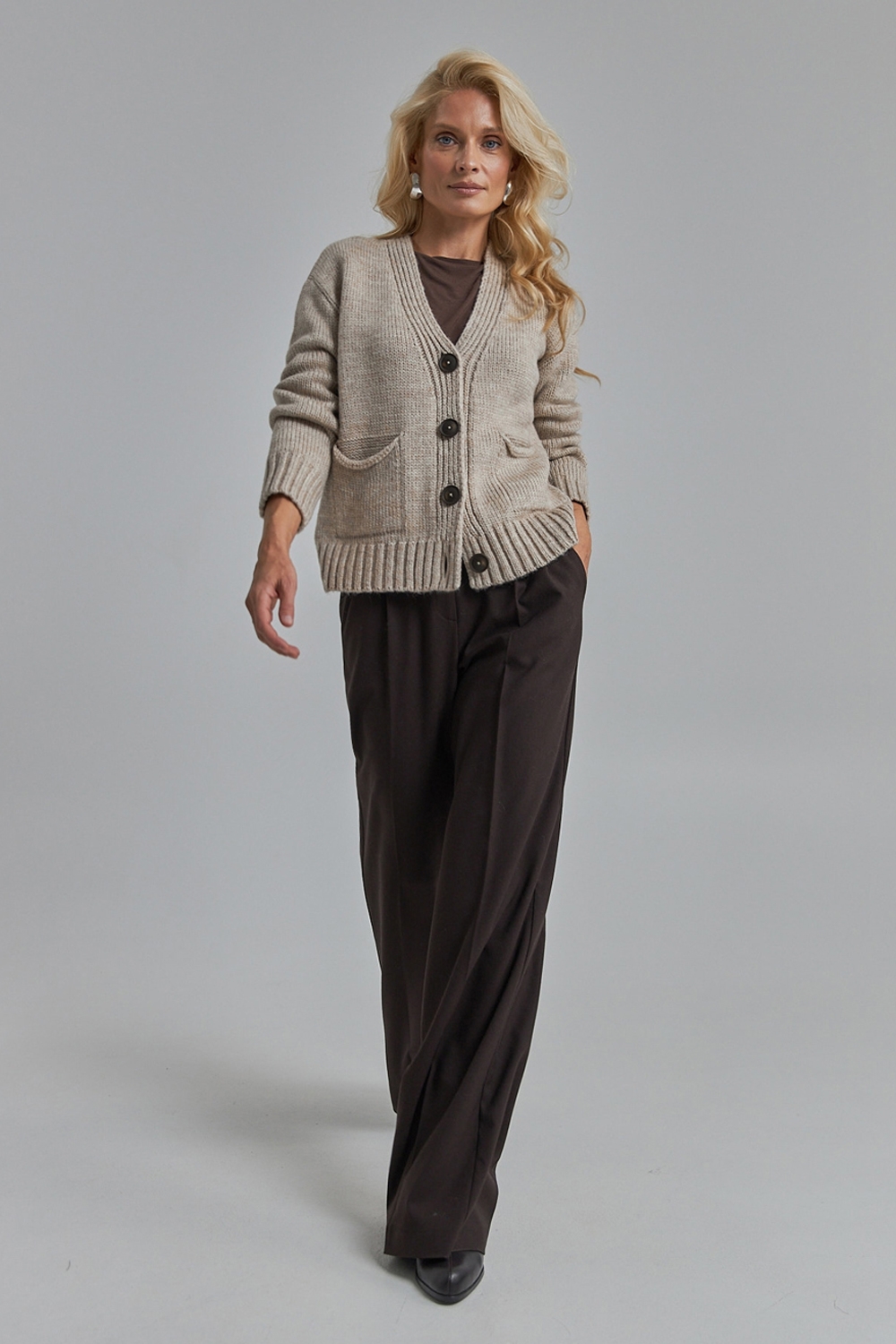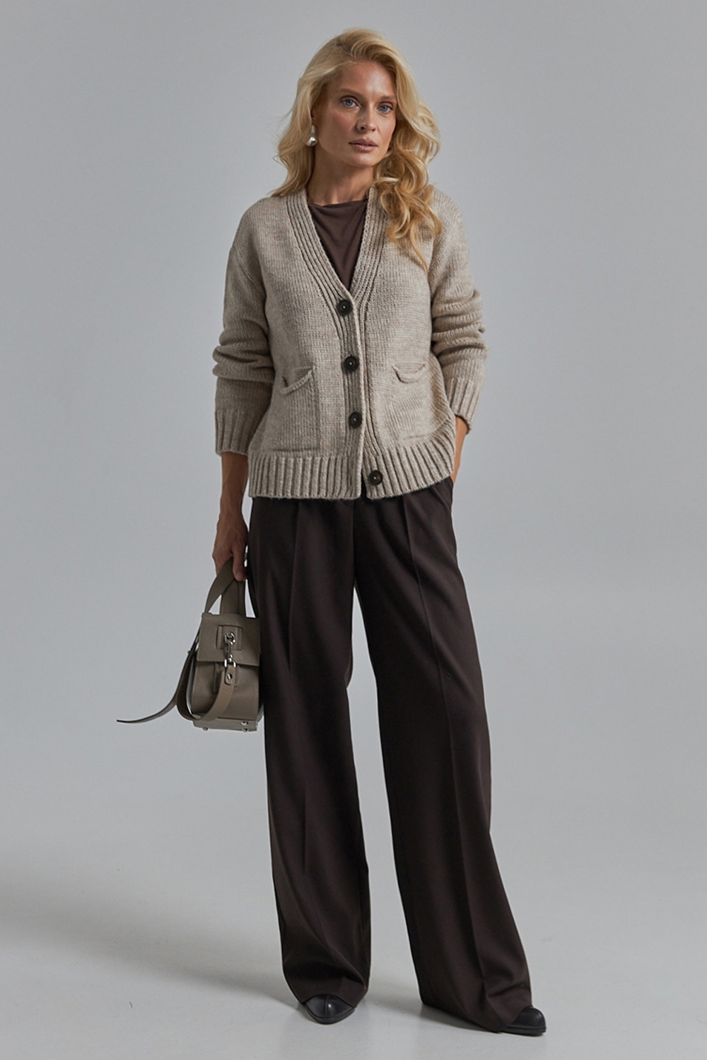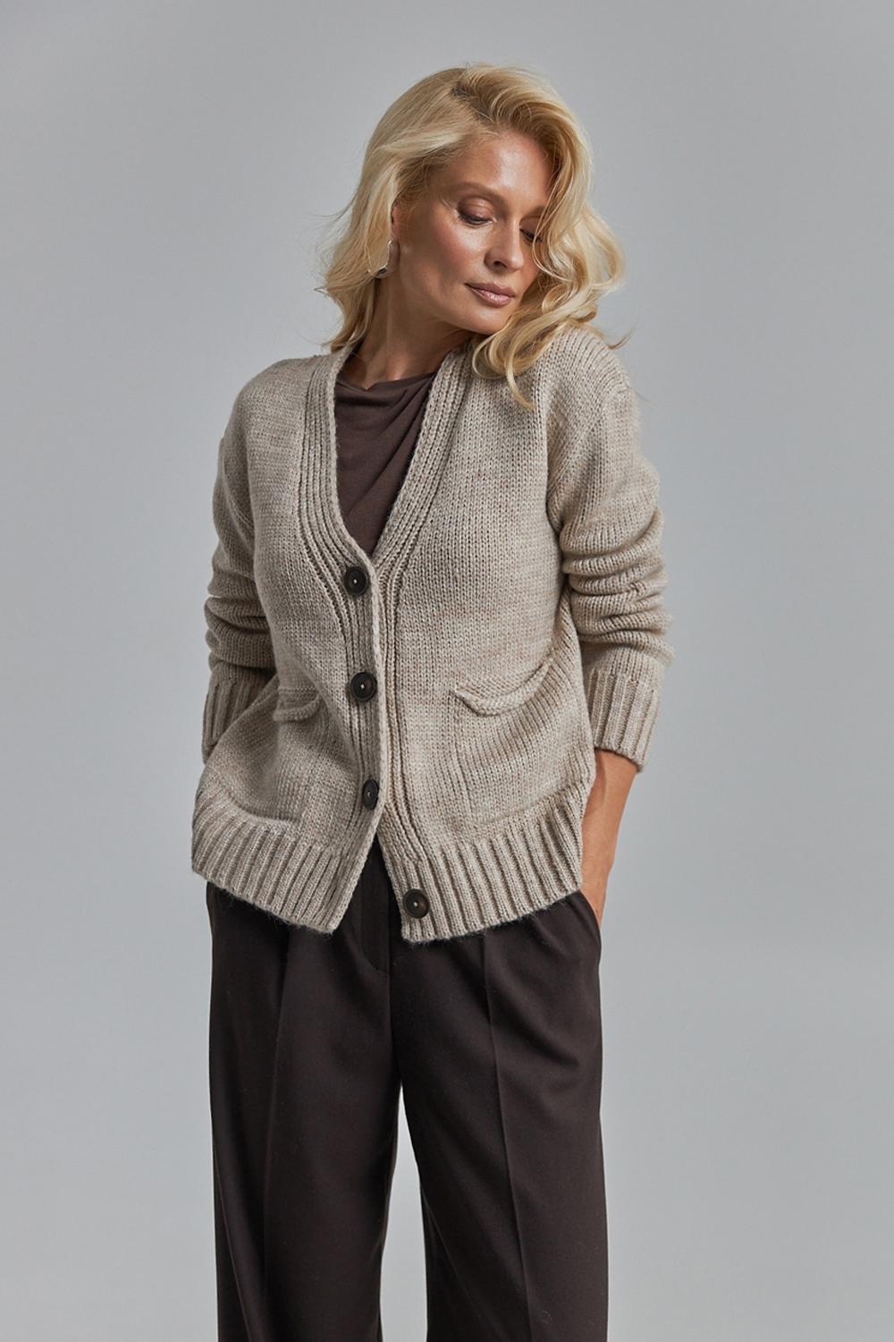 Напіввовняний кардиган вільного крою з опущеною лінією плеча. Виріб виконаний щільною стабільною в'язкою. Низ кардигана та рукави оформленні резинкою. Виріб декорований накладними кишенями та акцентними гудзиками.
