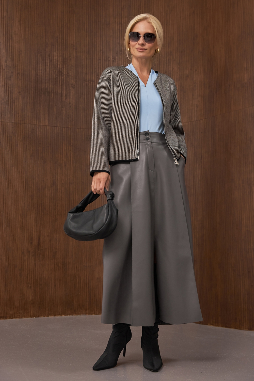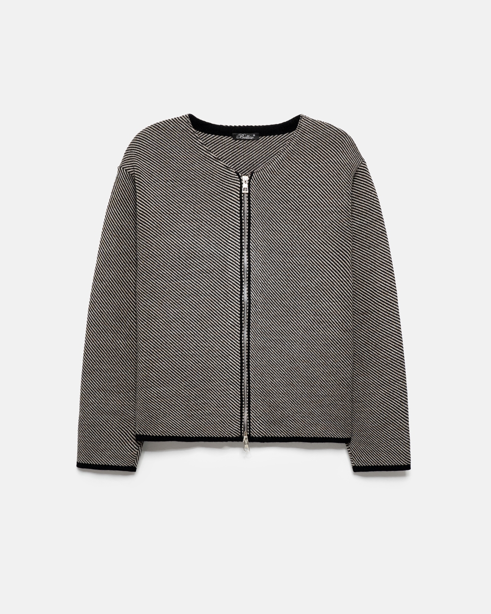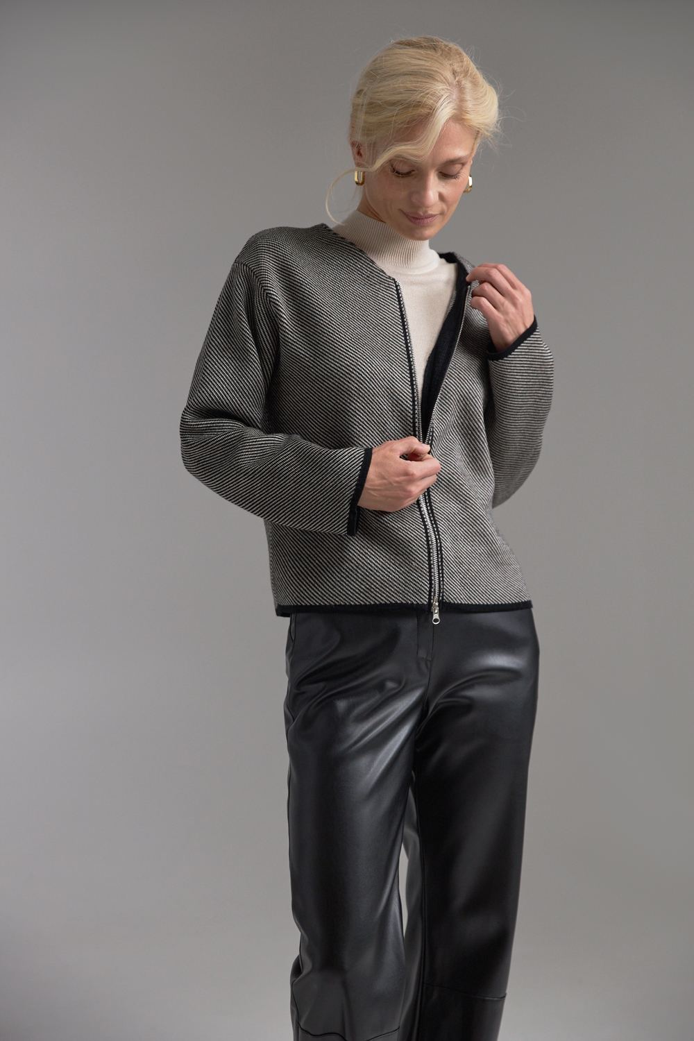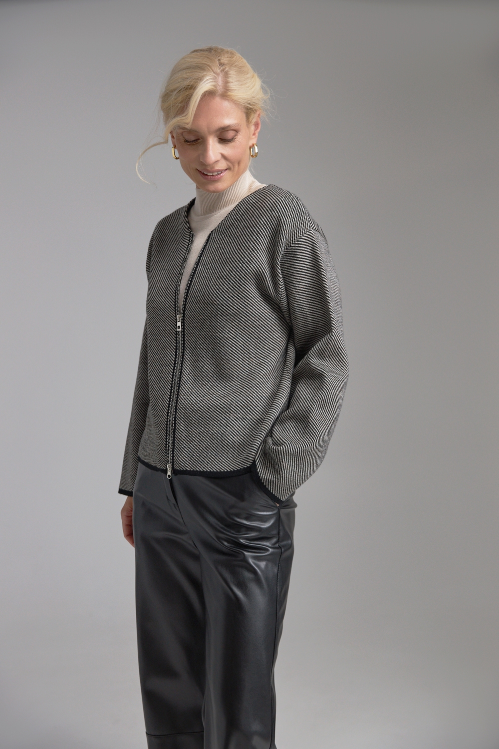 Напіввовняний кардиган із V-подібним вирізом. Модель вільного силуету виконана щільною, стабільною в’язкою, що тримає форму. Зручна застібка-блискавка на всю довжину.