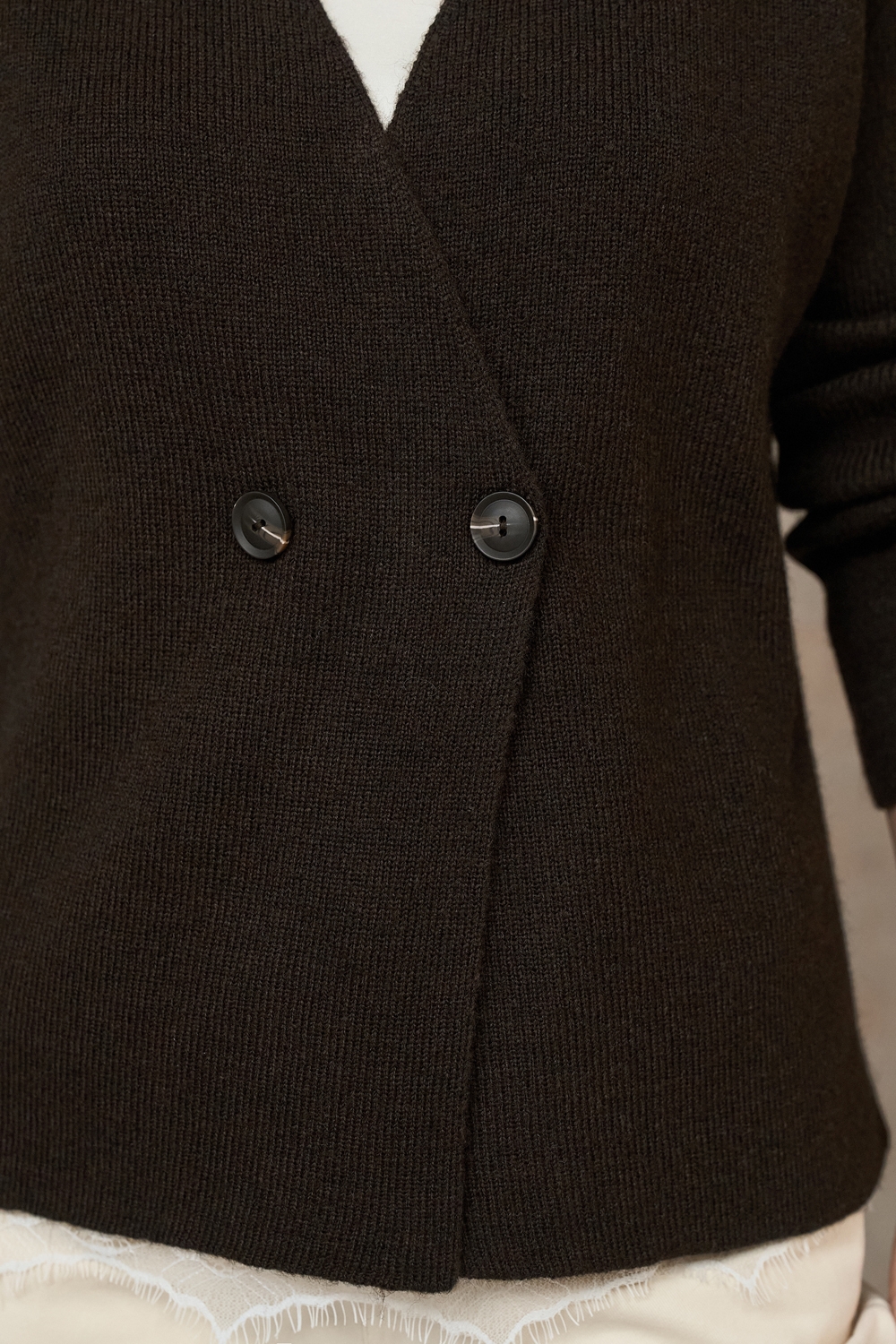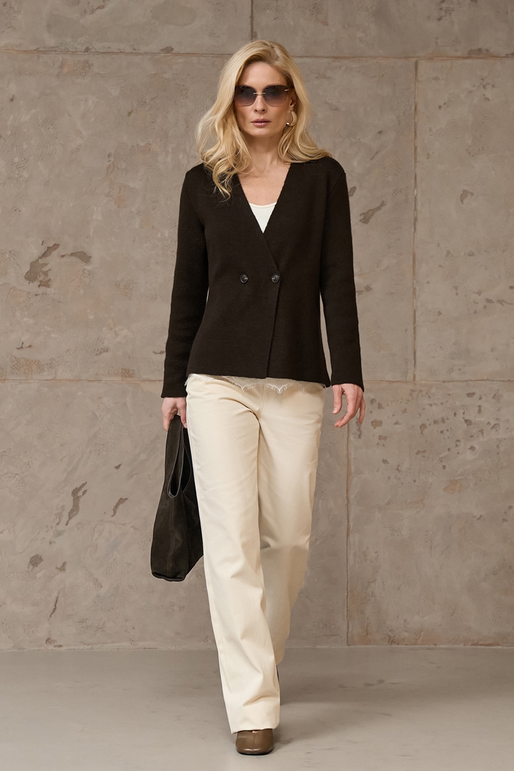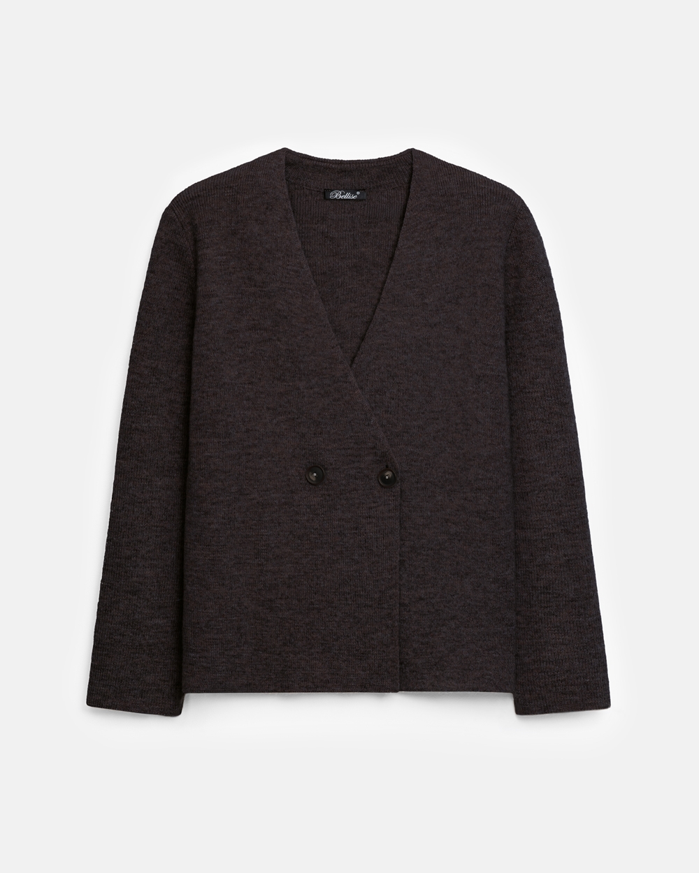 Затишний кардиган виконаний щільною в’язкою, що тримає форму, з м’якої пряжі вовни мериноса, альпаки та мохеру. Модель із V-подібним вирізом, вільним силуетом та спущеною лінією плеча.