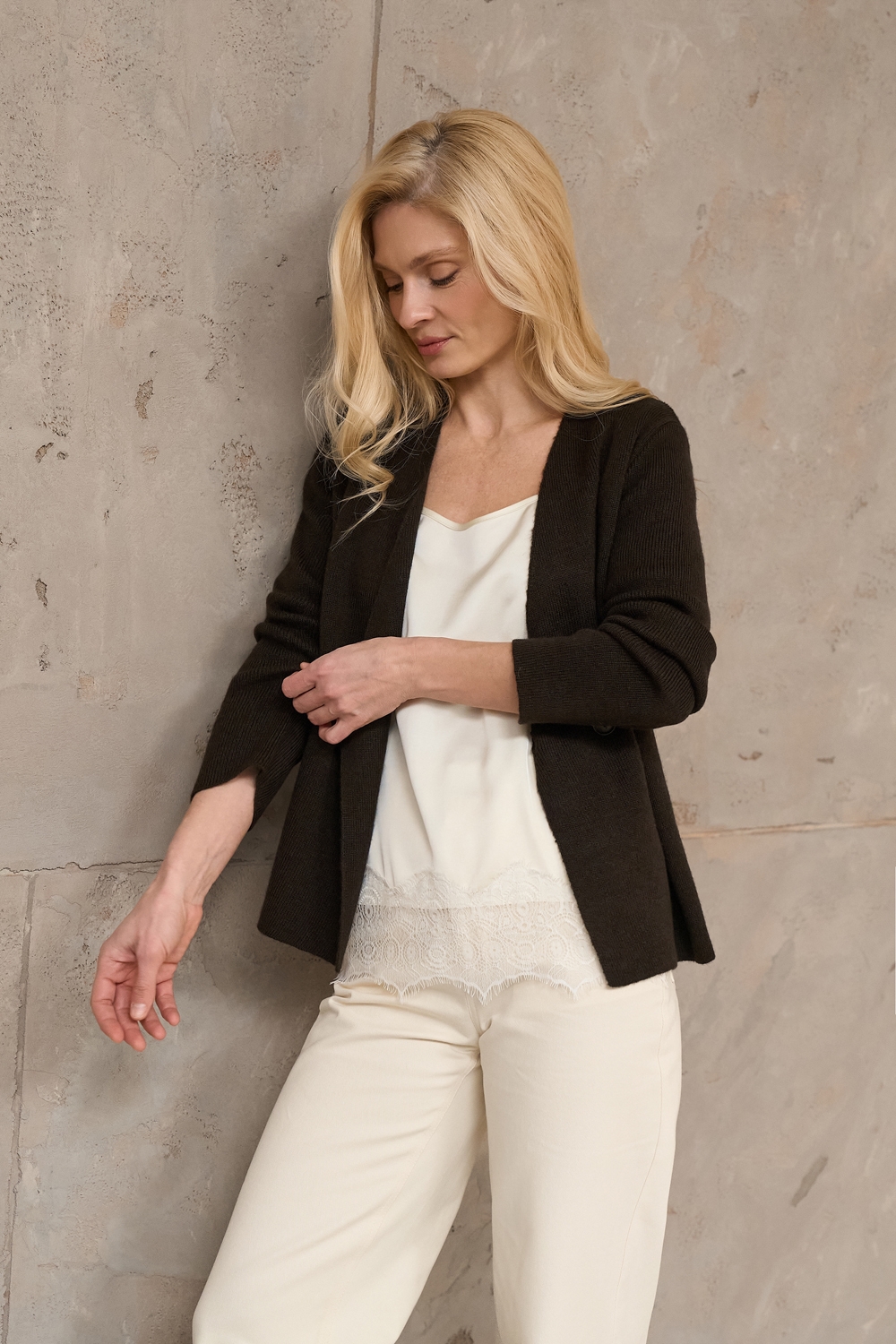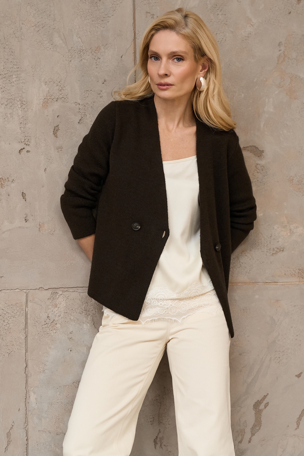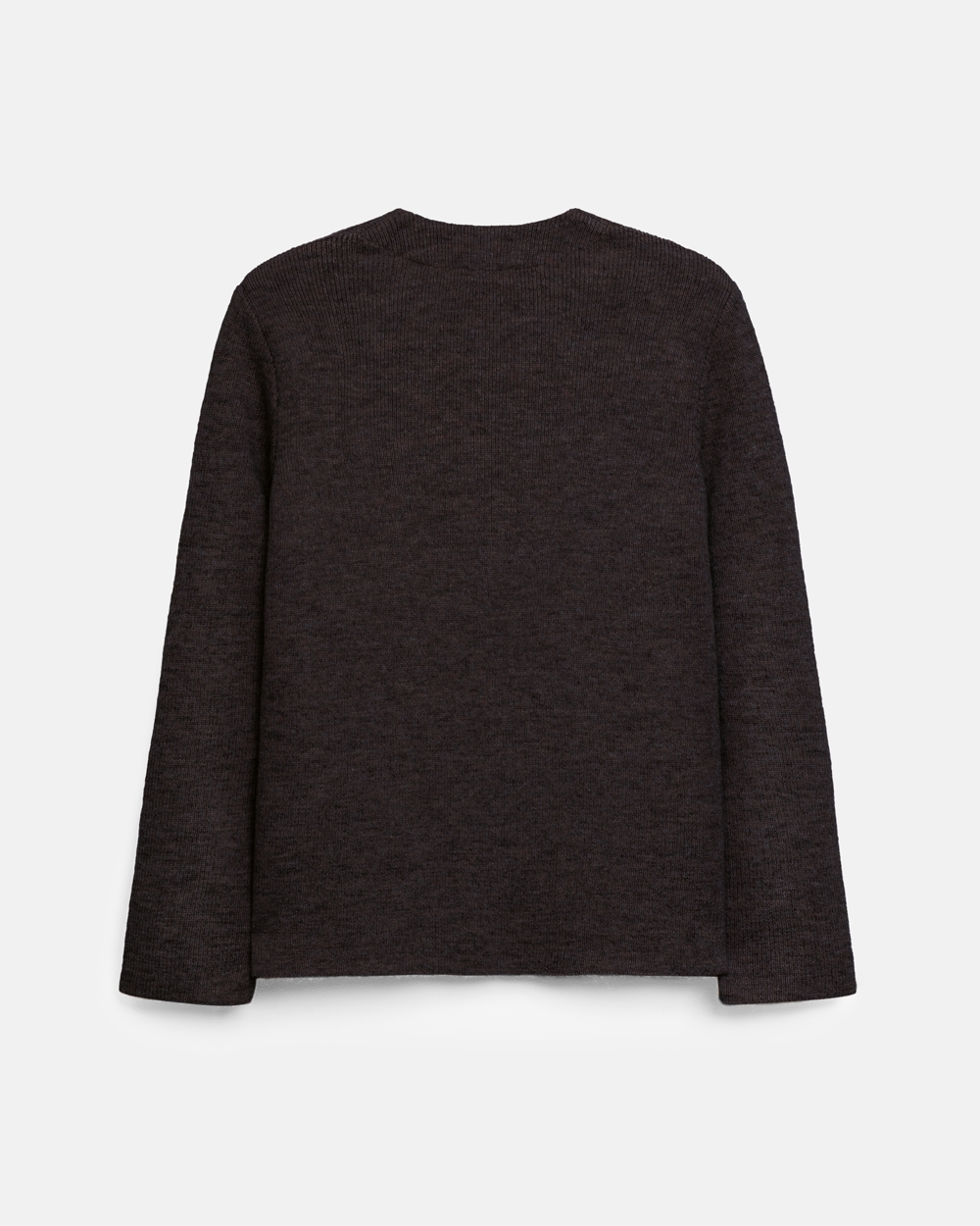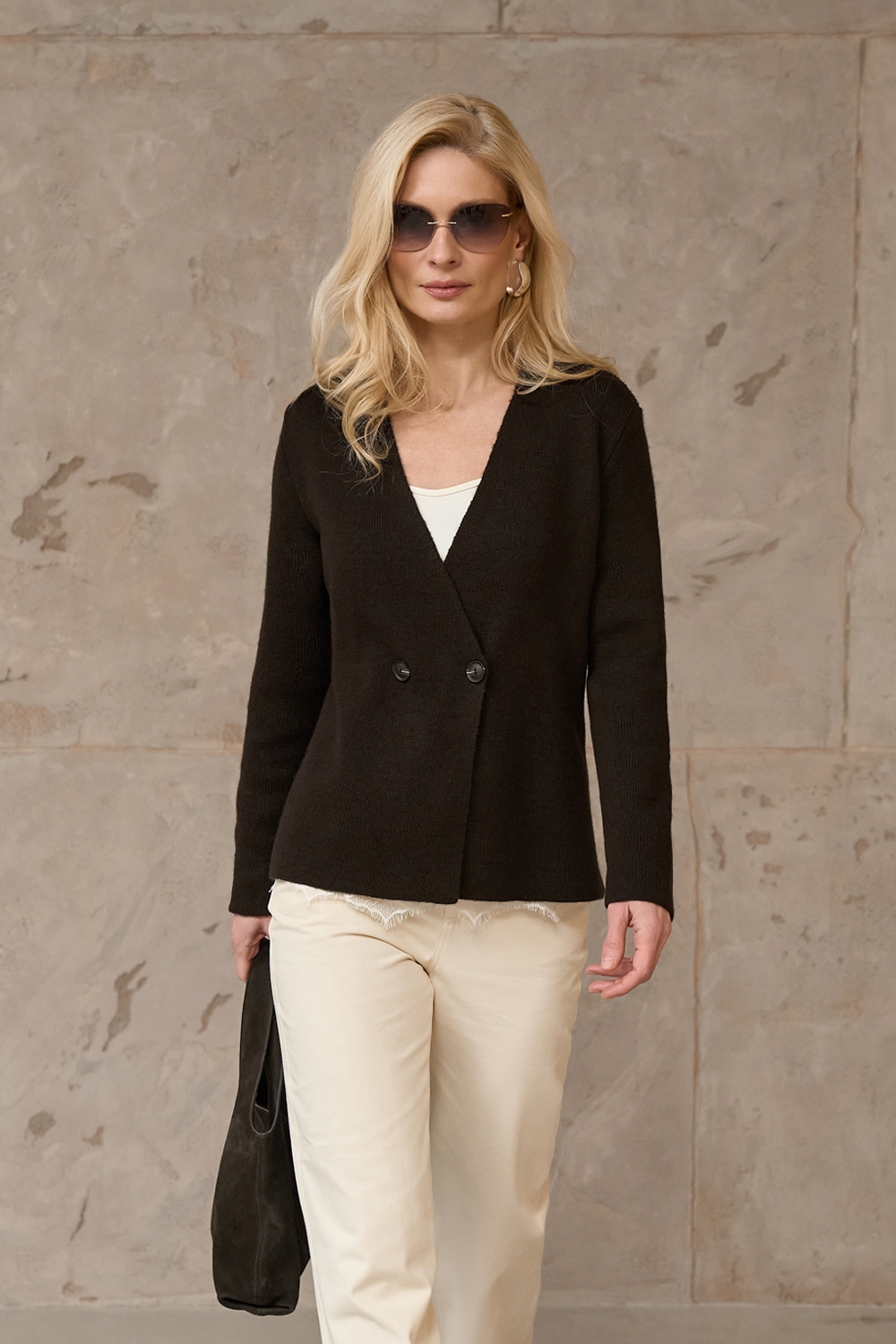 Затишний кардиган виконаний щільною в’язкою, що тримає форму, з м’якої пряжі вовни мериноса, альпаки та мохеру. Модель із V-подібним вирізом, вільним силуетом та спущеною лінією плеча.