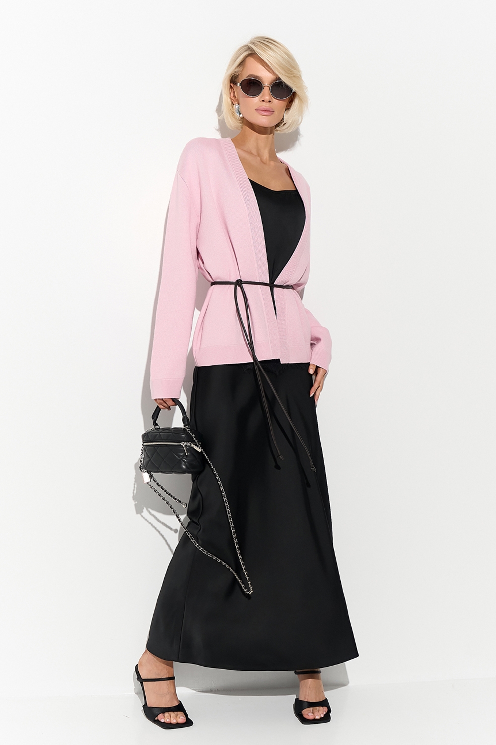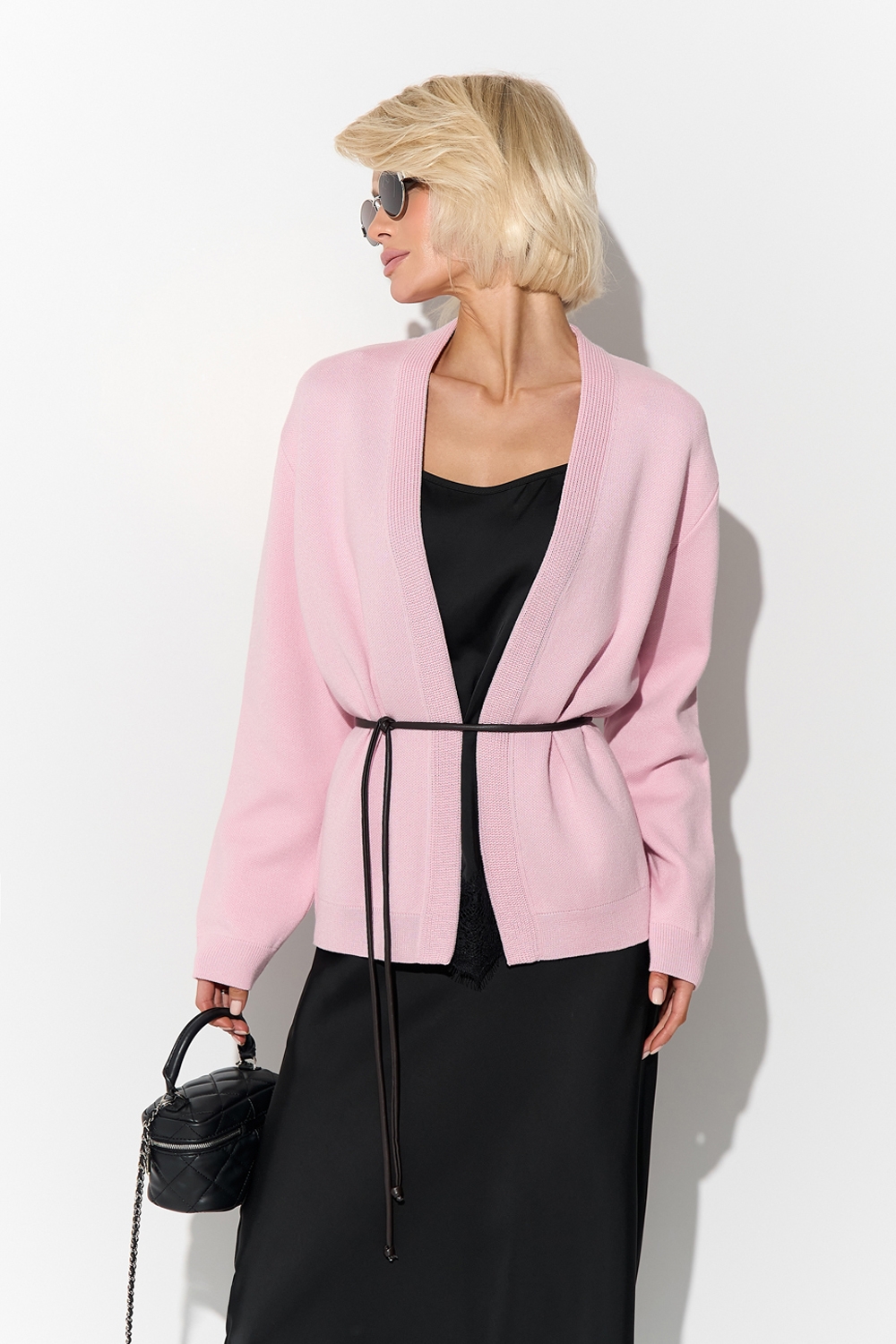 Стильний кардиган вільного силуету виготовлений щільною в'язкою з бавовняної пряжі з додаванням віскози. Лаконічний дизайн доповнено поясом із еко шкіри.