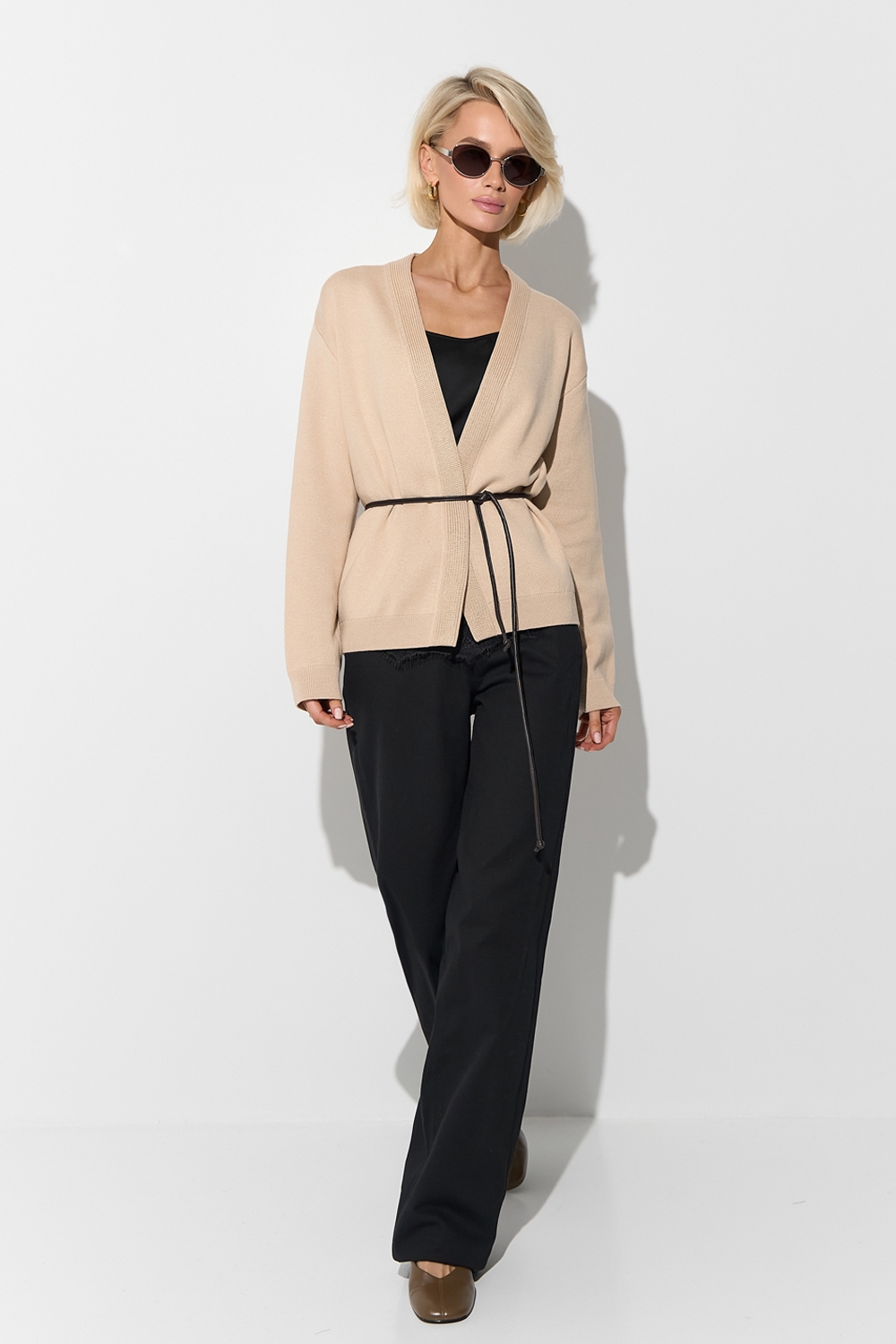 Стильний кардиган вільного силуету виготовлений щільною в'язкою з бавовняної пряжі з додаванням віскози. Лаконічний дизайн доповнено поясом із еко шкіри.