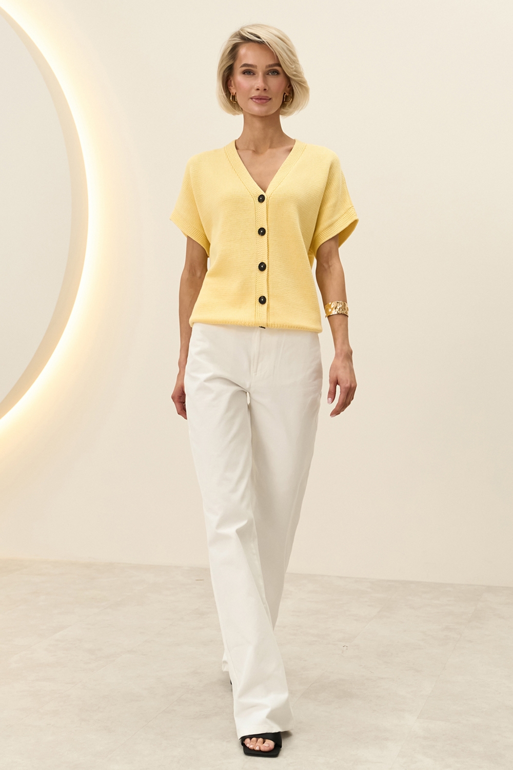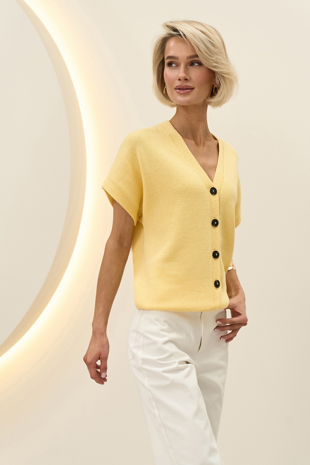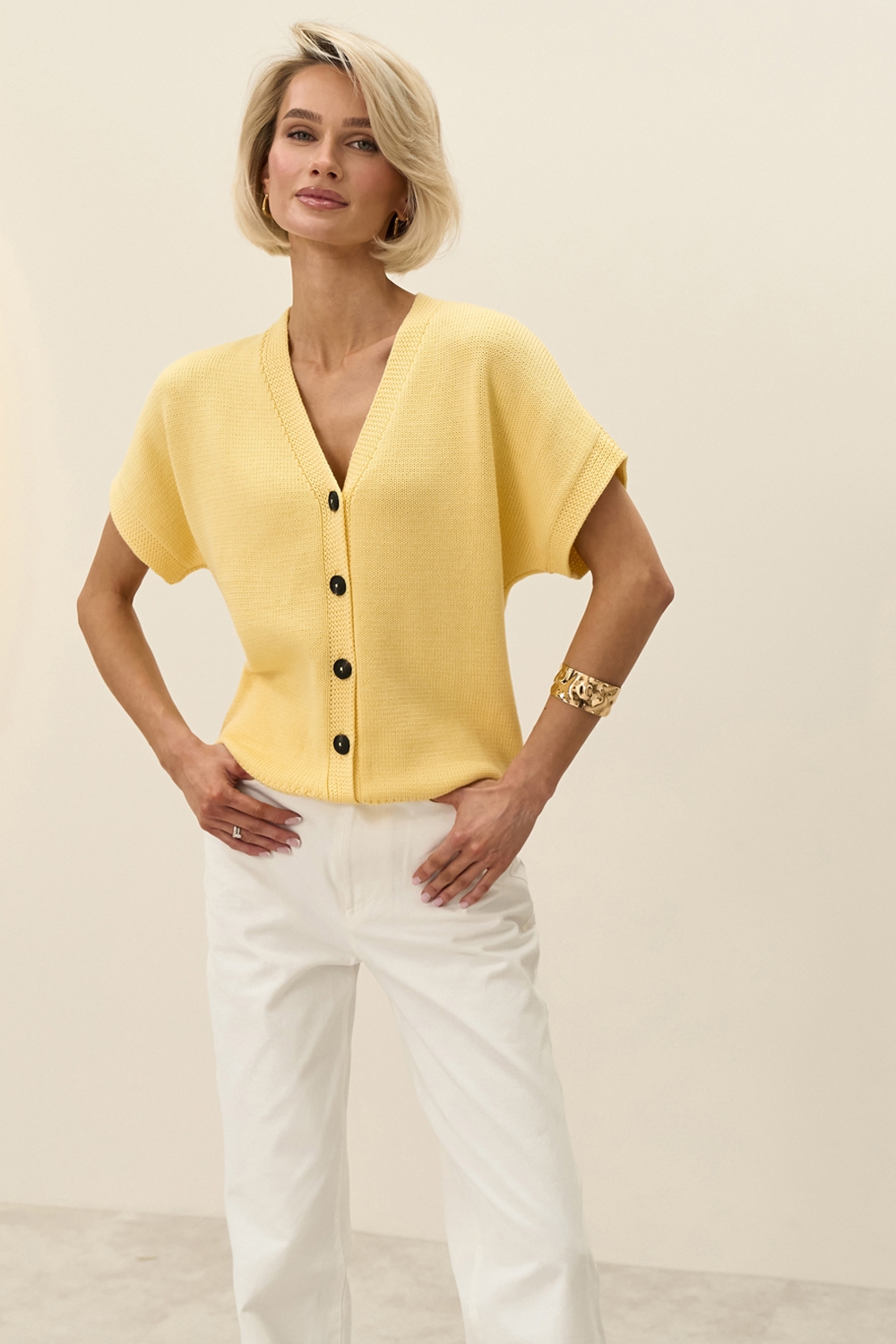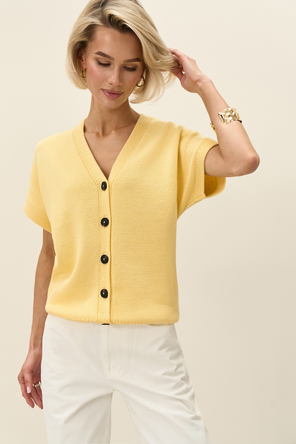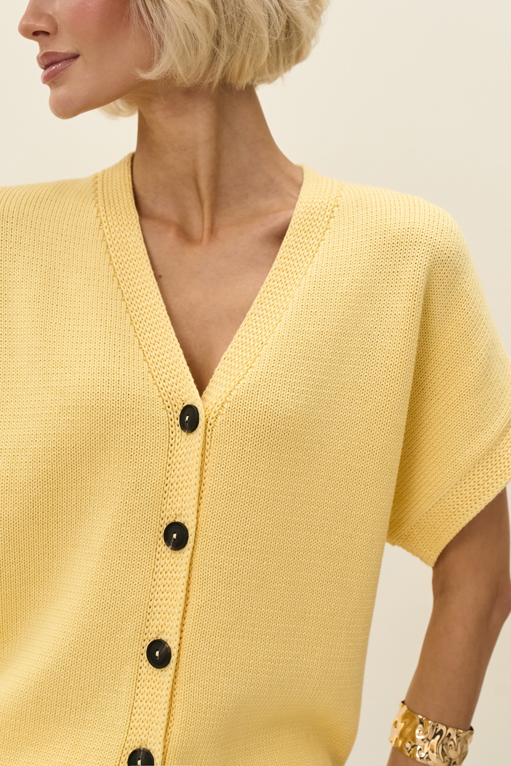 Вишуканий кардиган з коротким рукавом. Модель виконана з бавовняної пряжі з включенням віскози. М'який, приємний до тіла, гарно тримає форму.