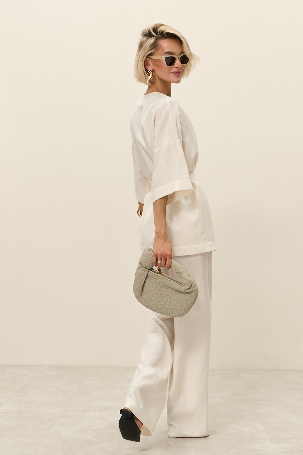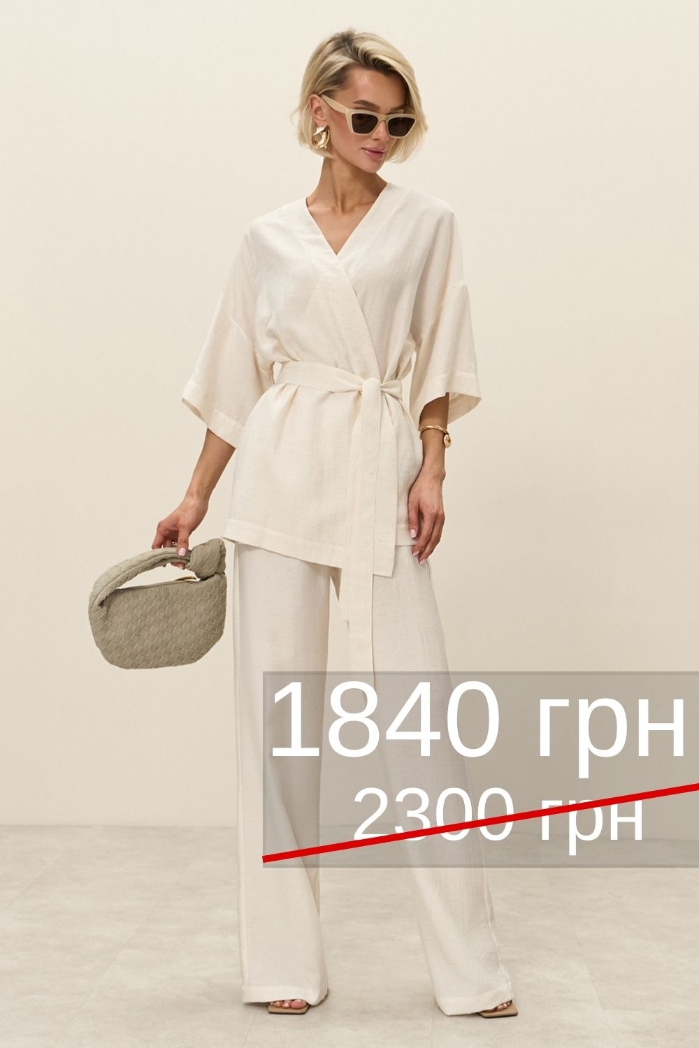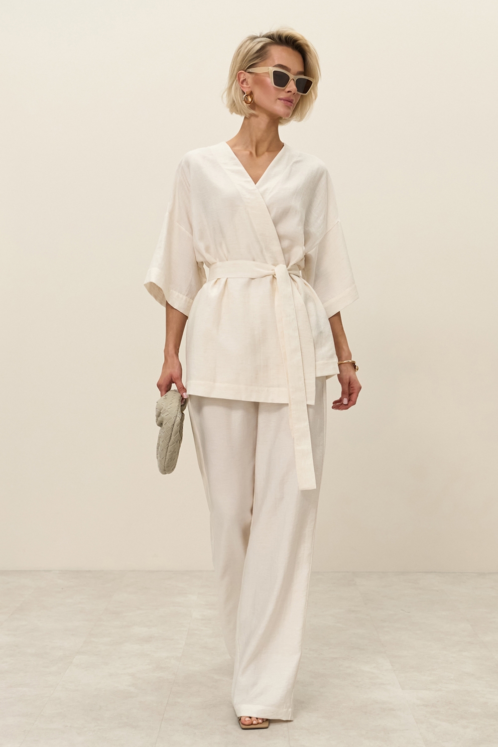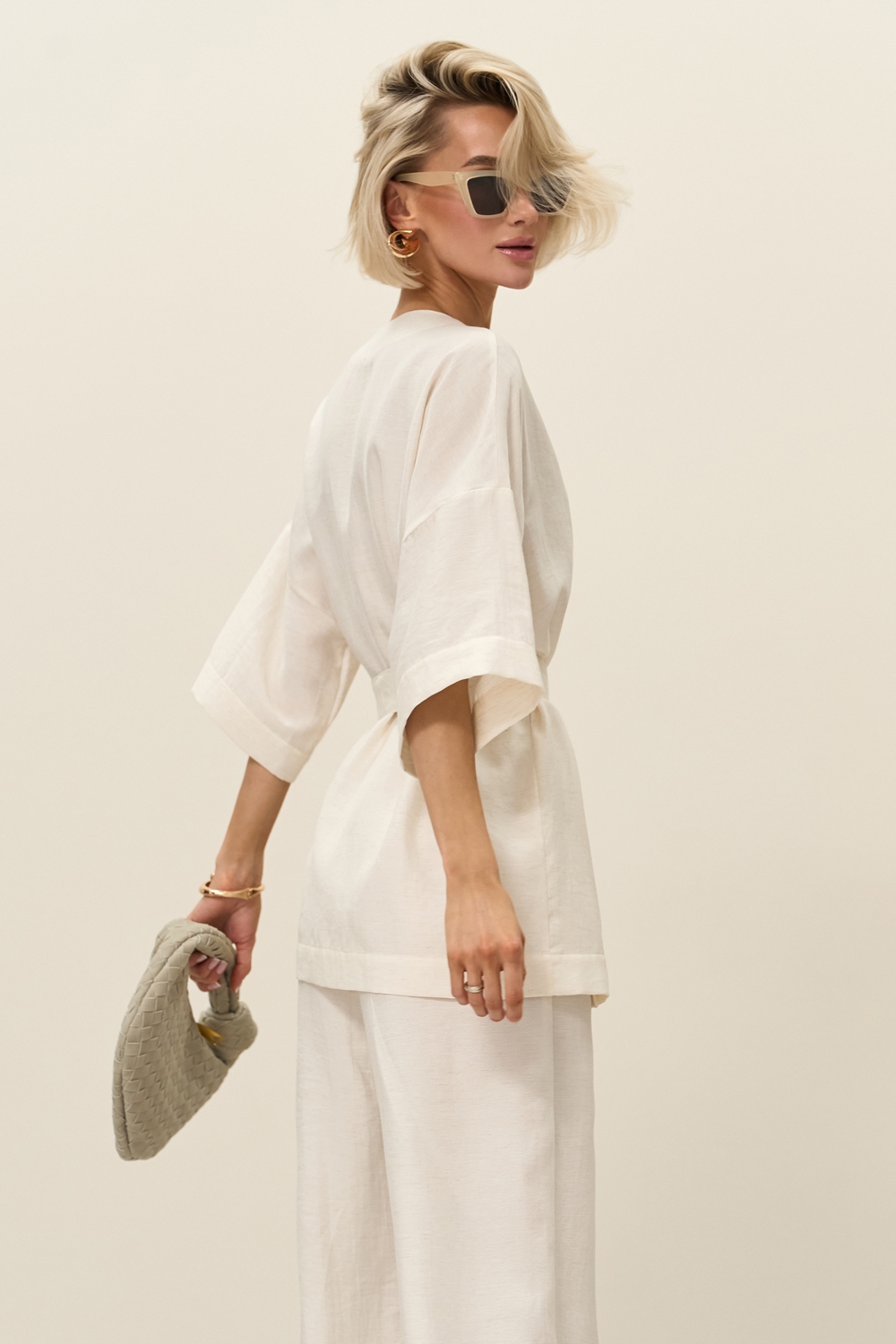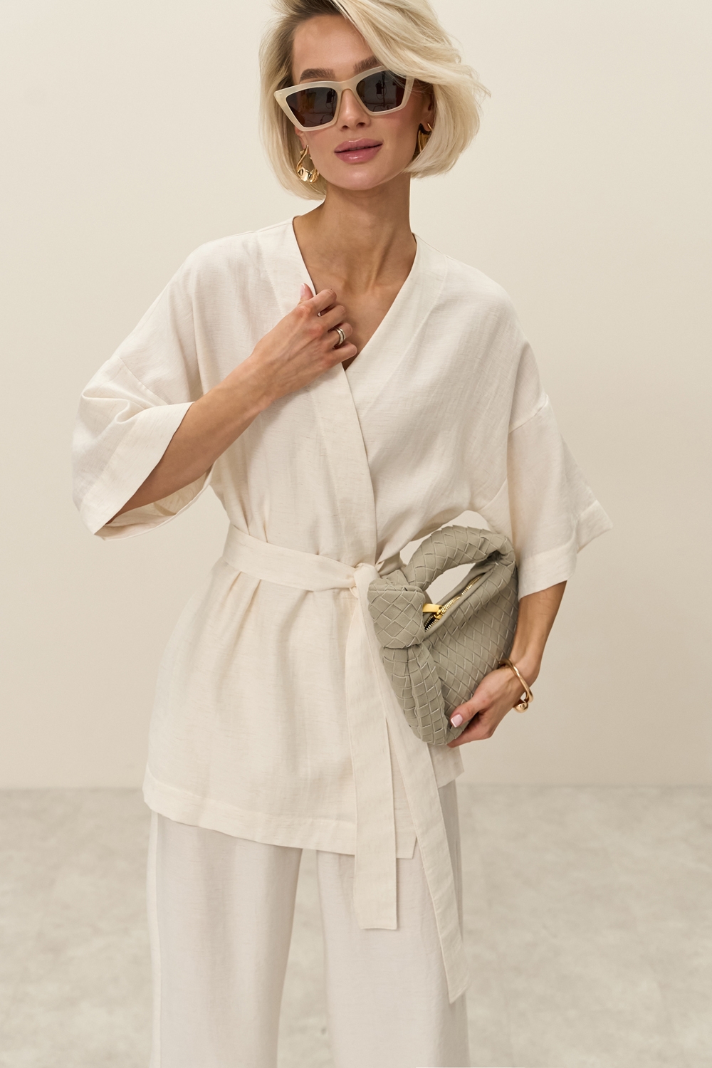 Стильне кімоно виконане з натуральної тканини з включенням віскози та льону. Приємне до тіла, середньої щільності.