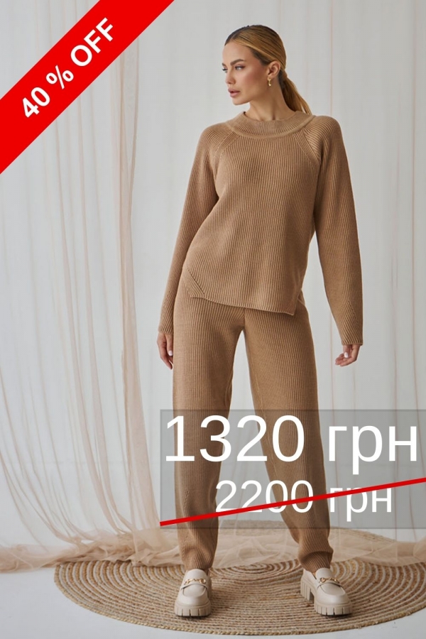 В'язаний затишний комплект, що складається з джемпера та штанів, виконаний з м'якої напіввовняної пряжі.