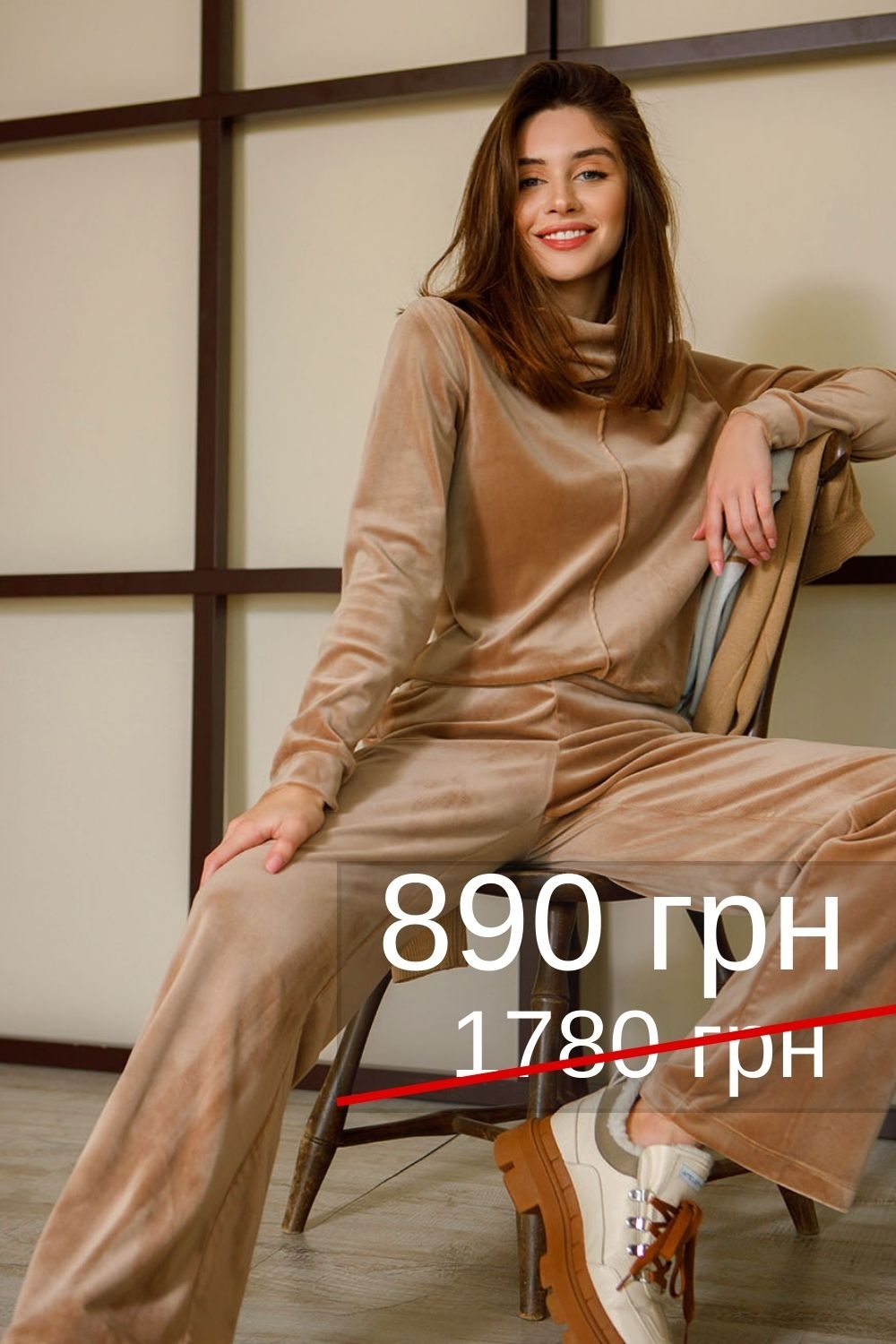 Жіночий затишний комплект, що складається з джемпера та штанів, виконаний з м'якого та теплого велюру. Джемпер напівприлеглого силуету має притачні манжети і планку по низу виробу. Комфортні штани з бічними класичними кишенями створюють подовжений силует. Декор костюма складає вертикальний рельєфний шов. Вироби можуть одягатися як у костюмі, так і окремо в інших поєднаннях.