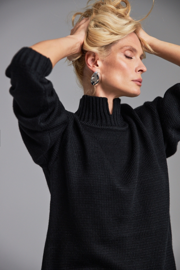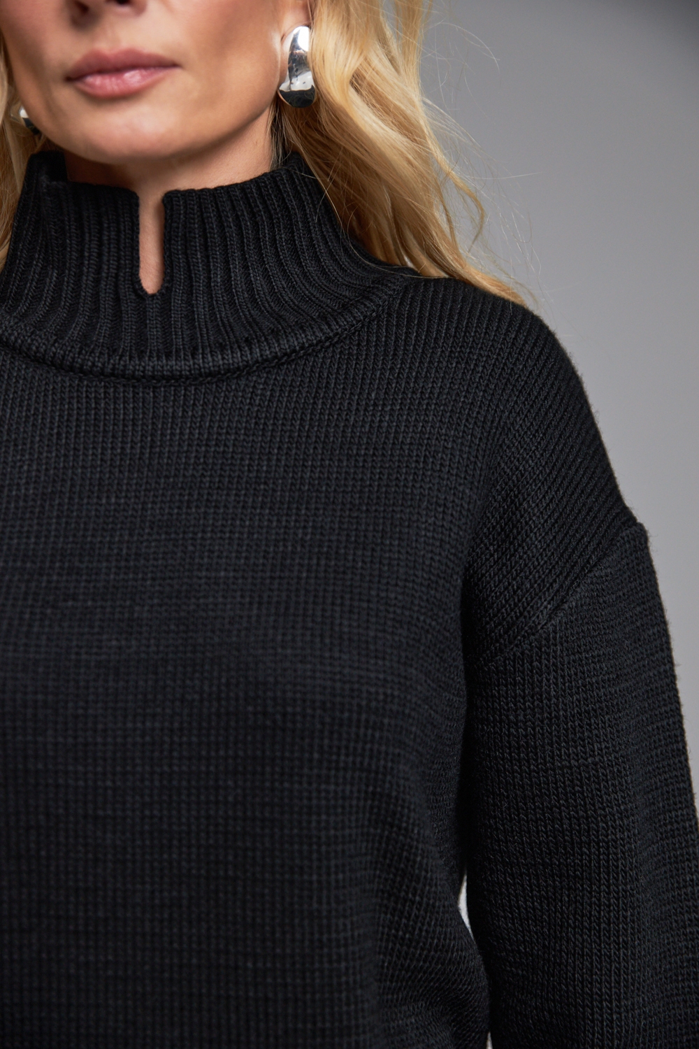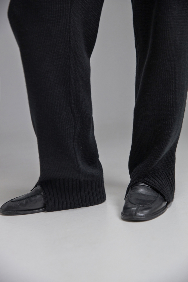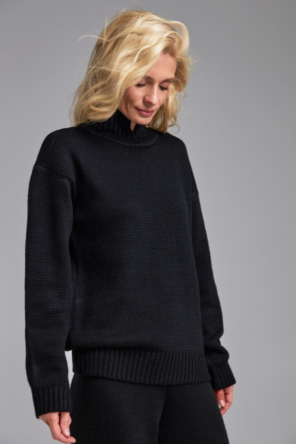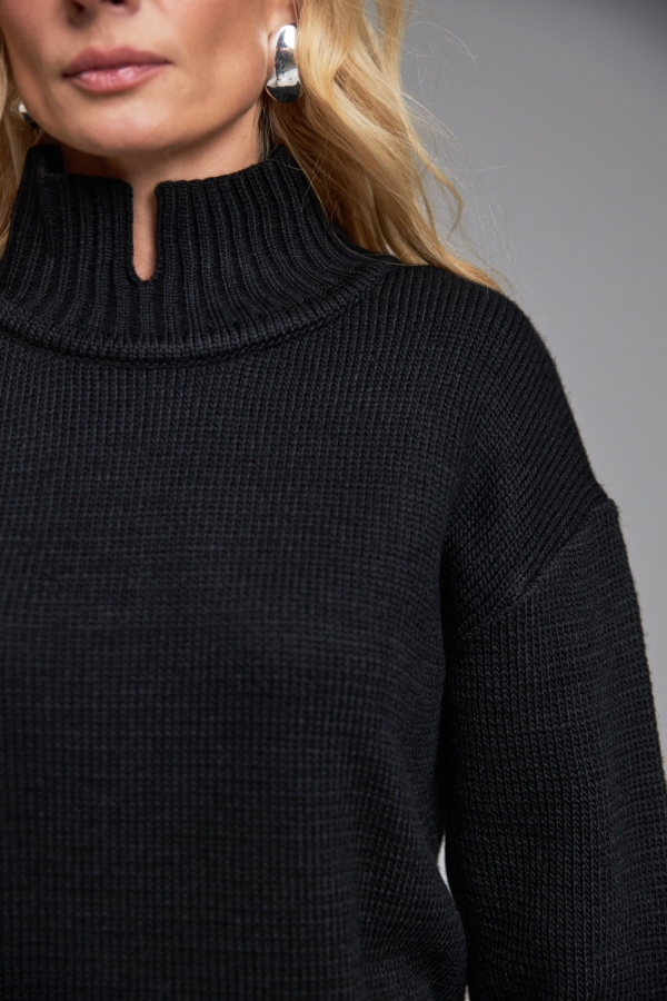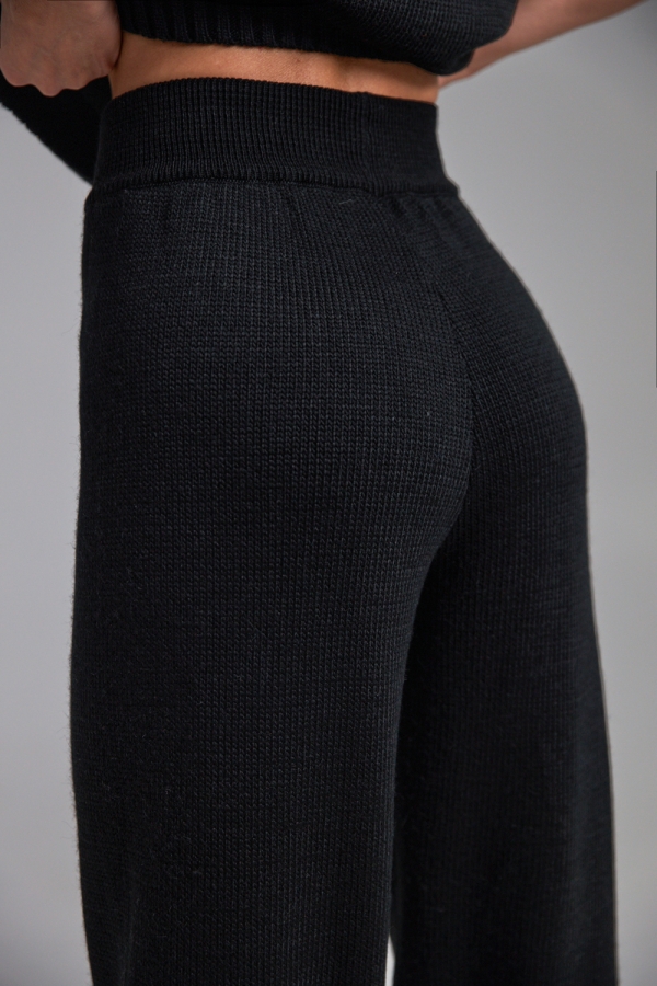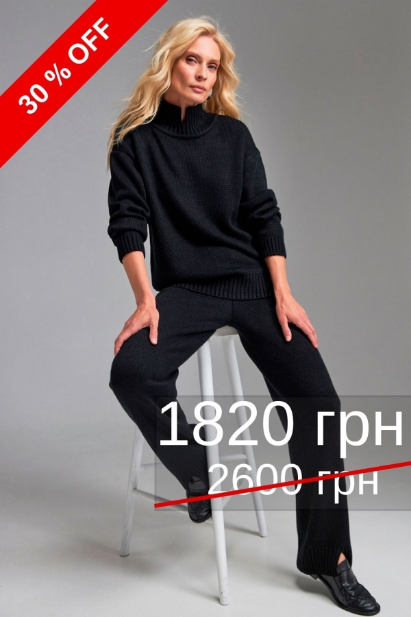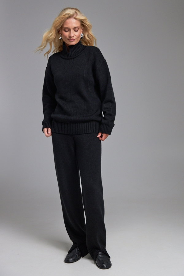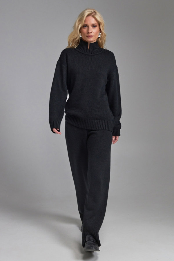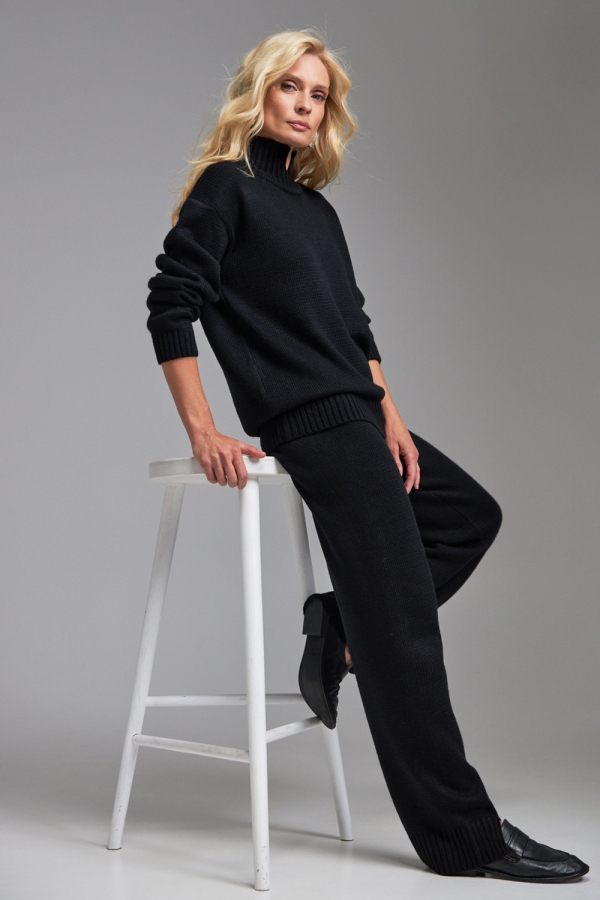 В'язаний затишний комплект, що складається з джемпера та штанів, виконаний з м'якої напіввовняної пряжі. Джемпер прямого силуету з горловиною-стійкою, доповненою акуратним розрізом.