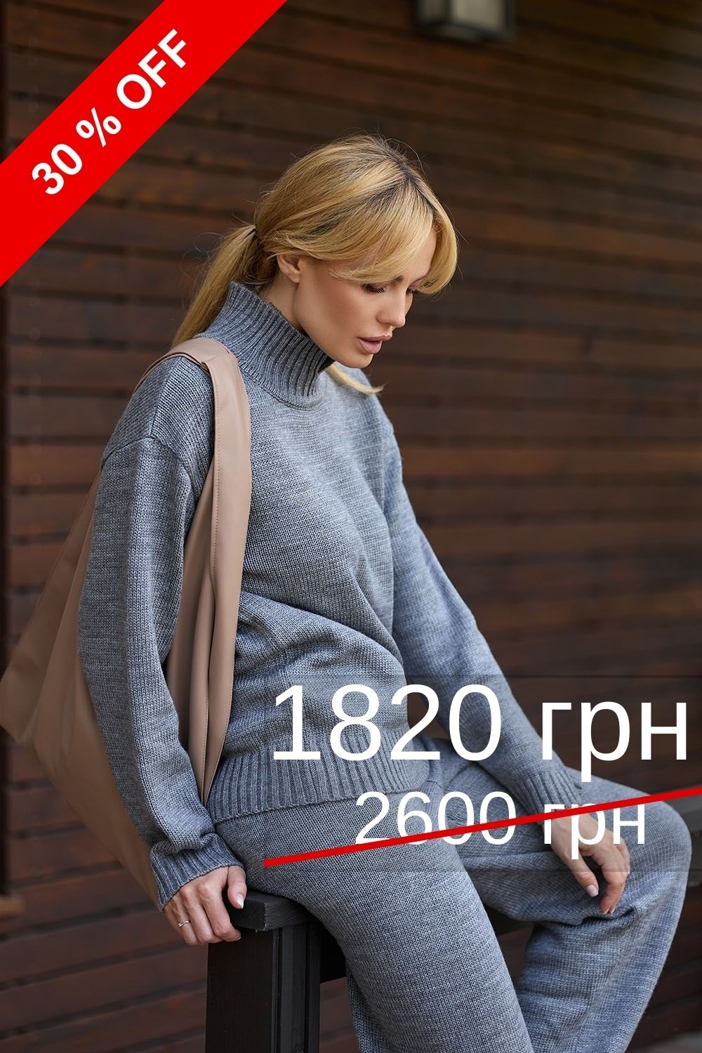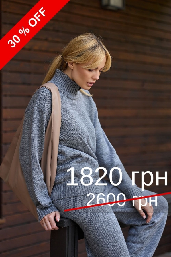 В'язаний затишний комплект, що складається з джемпера та штанів, виконаний з м'якої напіввовняної пряжі. Джемпер прямого силуету з горловиною-стійкою, доповненою акуратним розрізом.