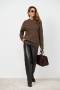 В'язаний затишний комплект, що складається з джемпера та штанів, виконаний з м'якої напіввовняної пряжі. Джемпер прямого силуету з горловиною-стійкою, доповненою акуратним розрізом.