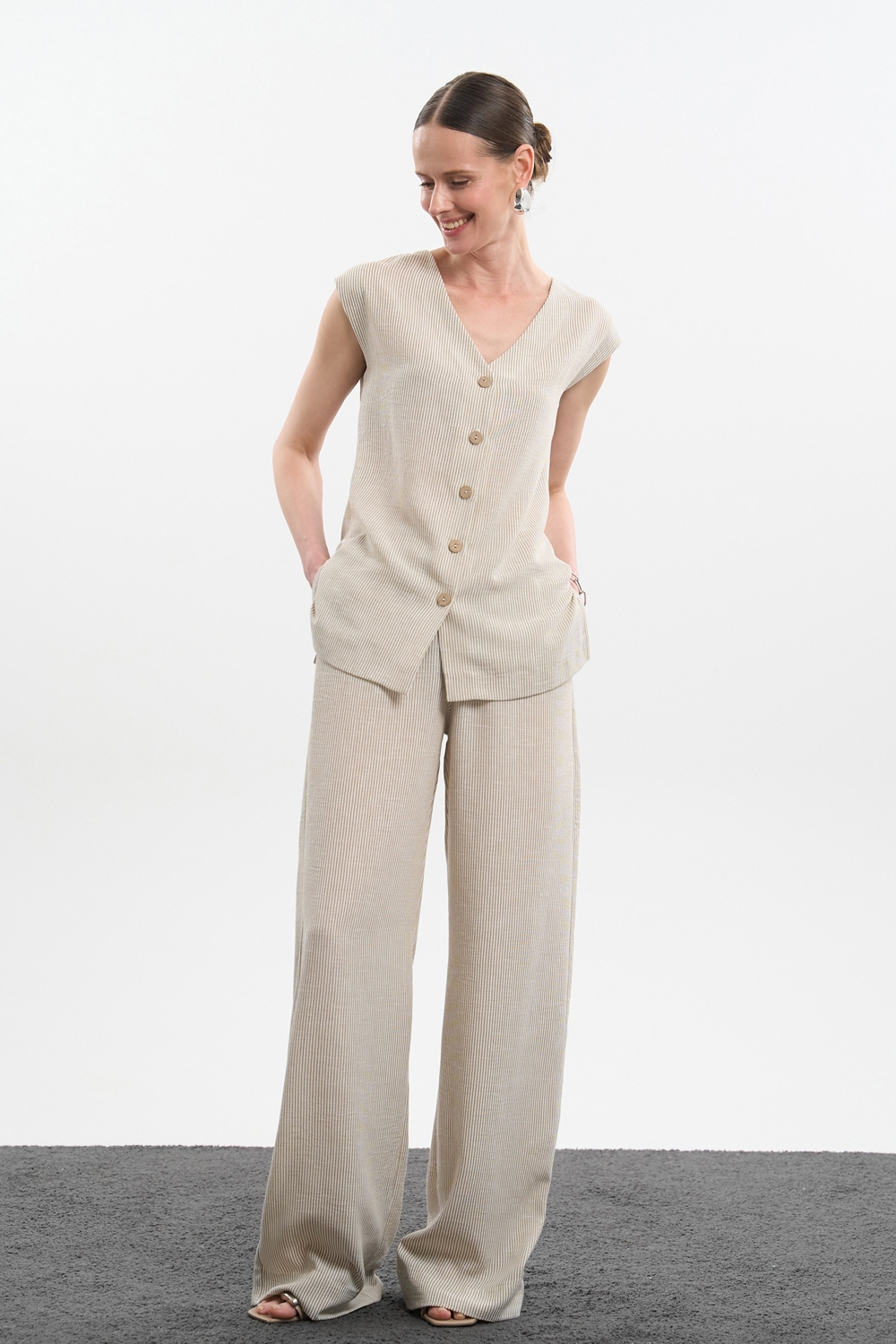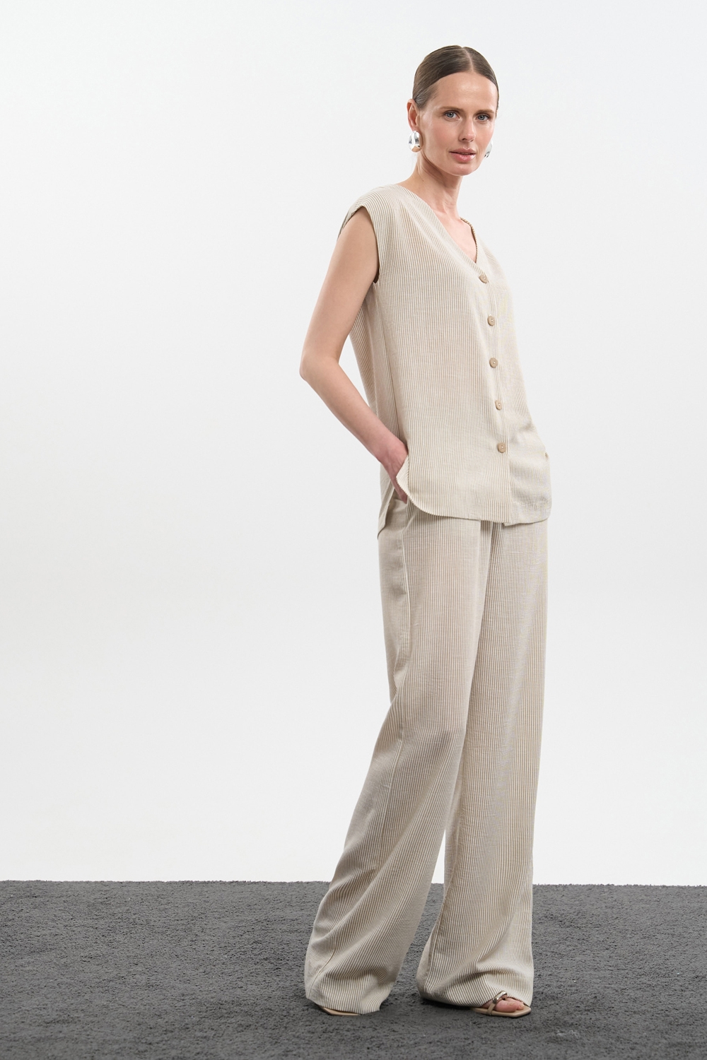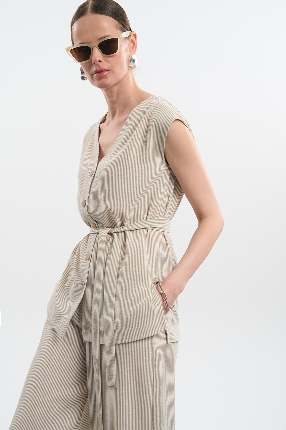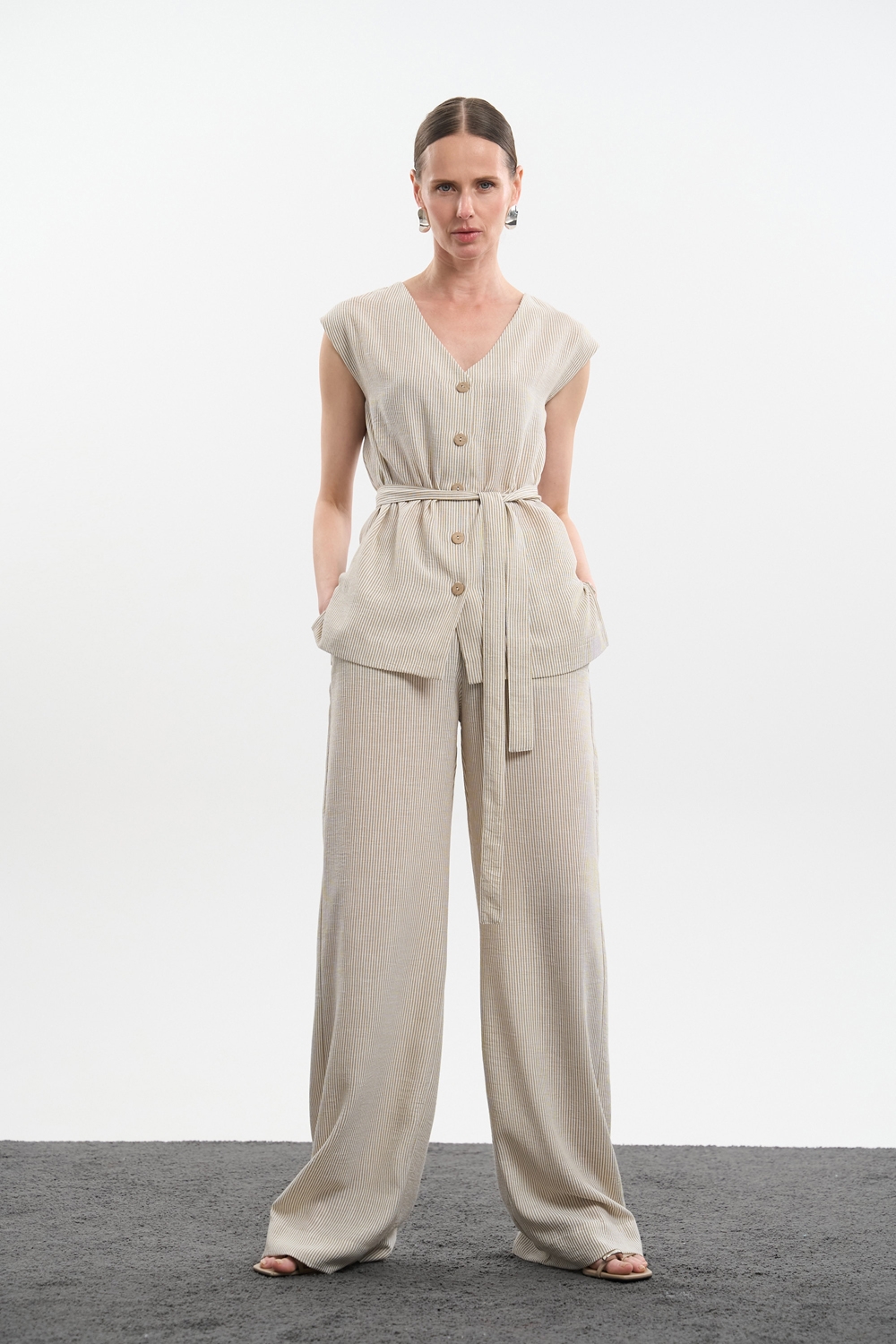 Стильний і зручний комплект із натуральної віскозно-льняної тканини, приємної до тіла. Жилет вільного крою з поясом у комплекті. Прямі штани з глибокими кишенями та комфортною резинкою на талії.