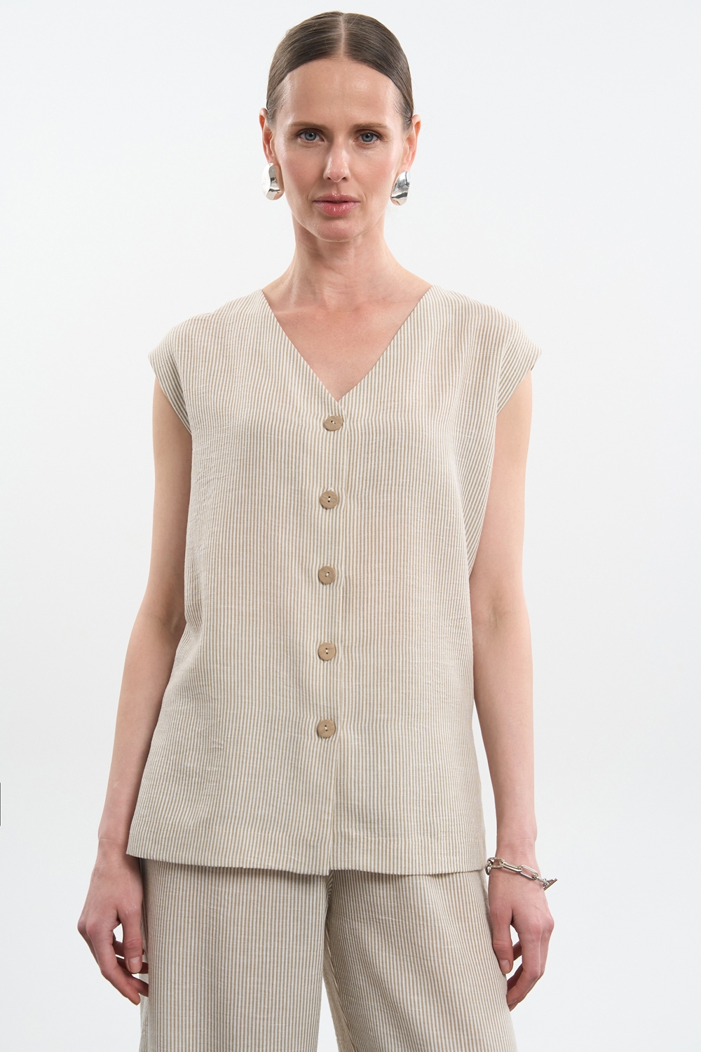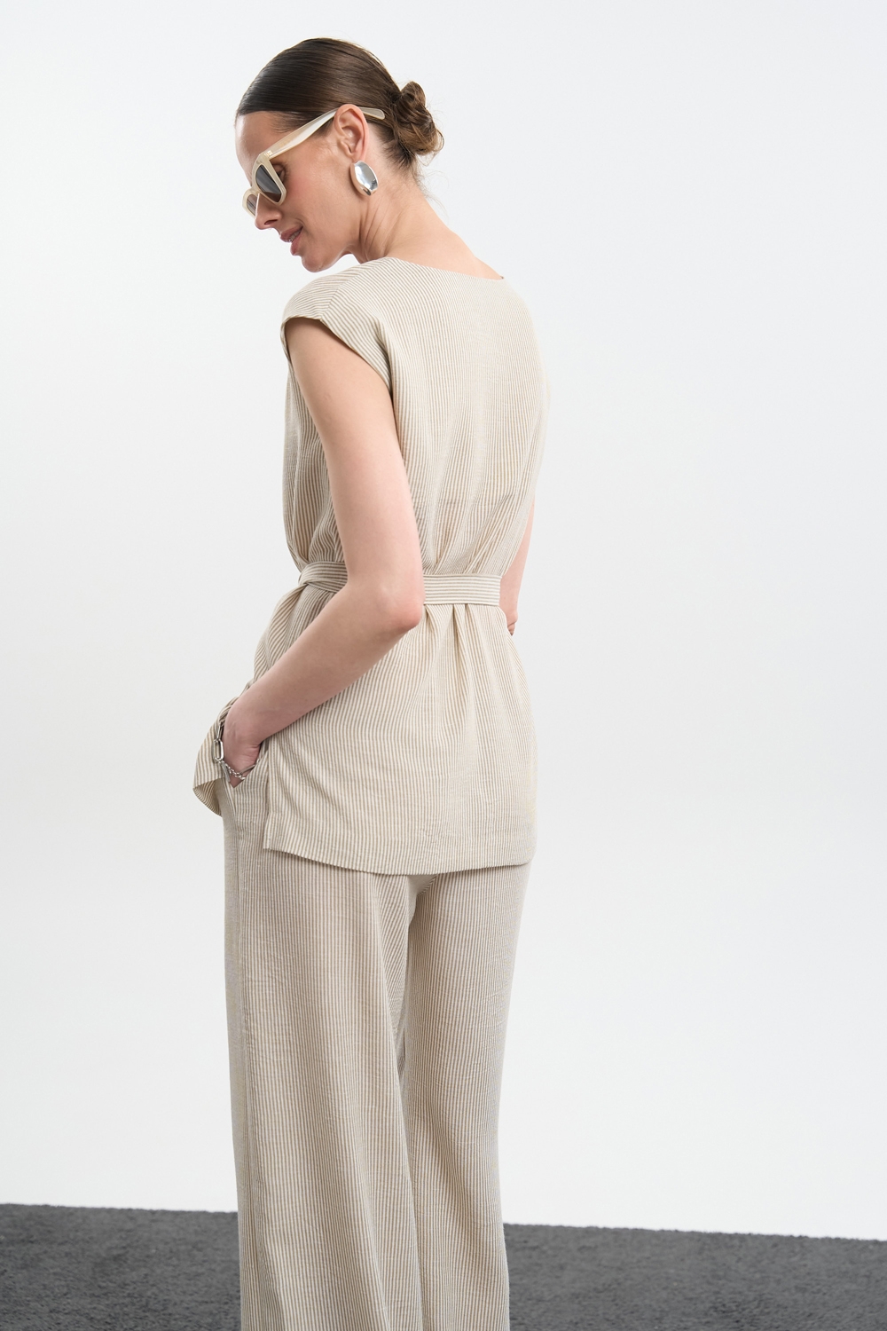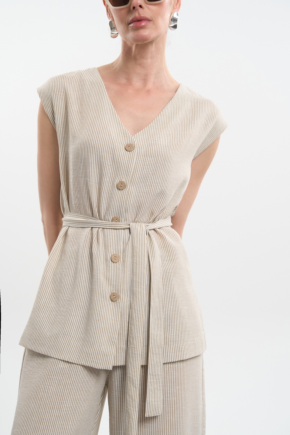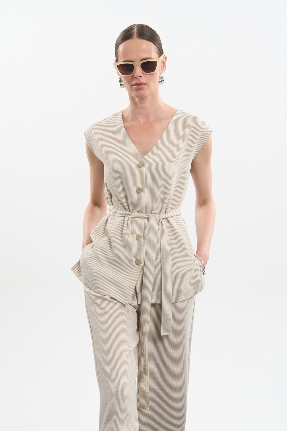 Стильний і зручний комплект із натуральної віскозно-льняної тканини, приємної до тіла. Жилет вільного крою з поясом у комплекті. Прямі штани з глибокими кишенями та комфортною резинкою на талії.