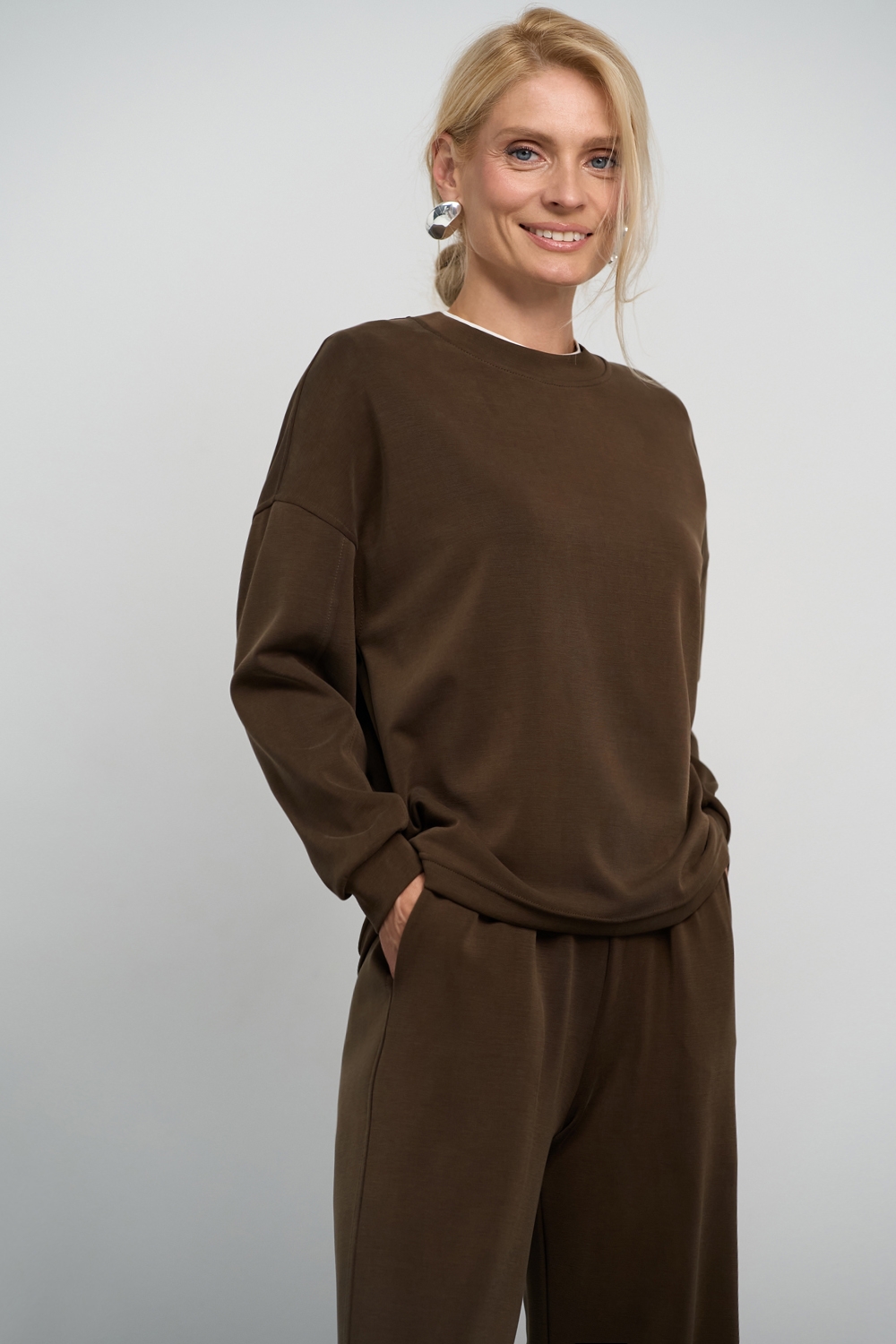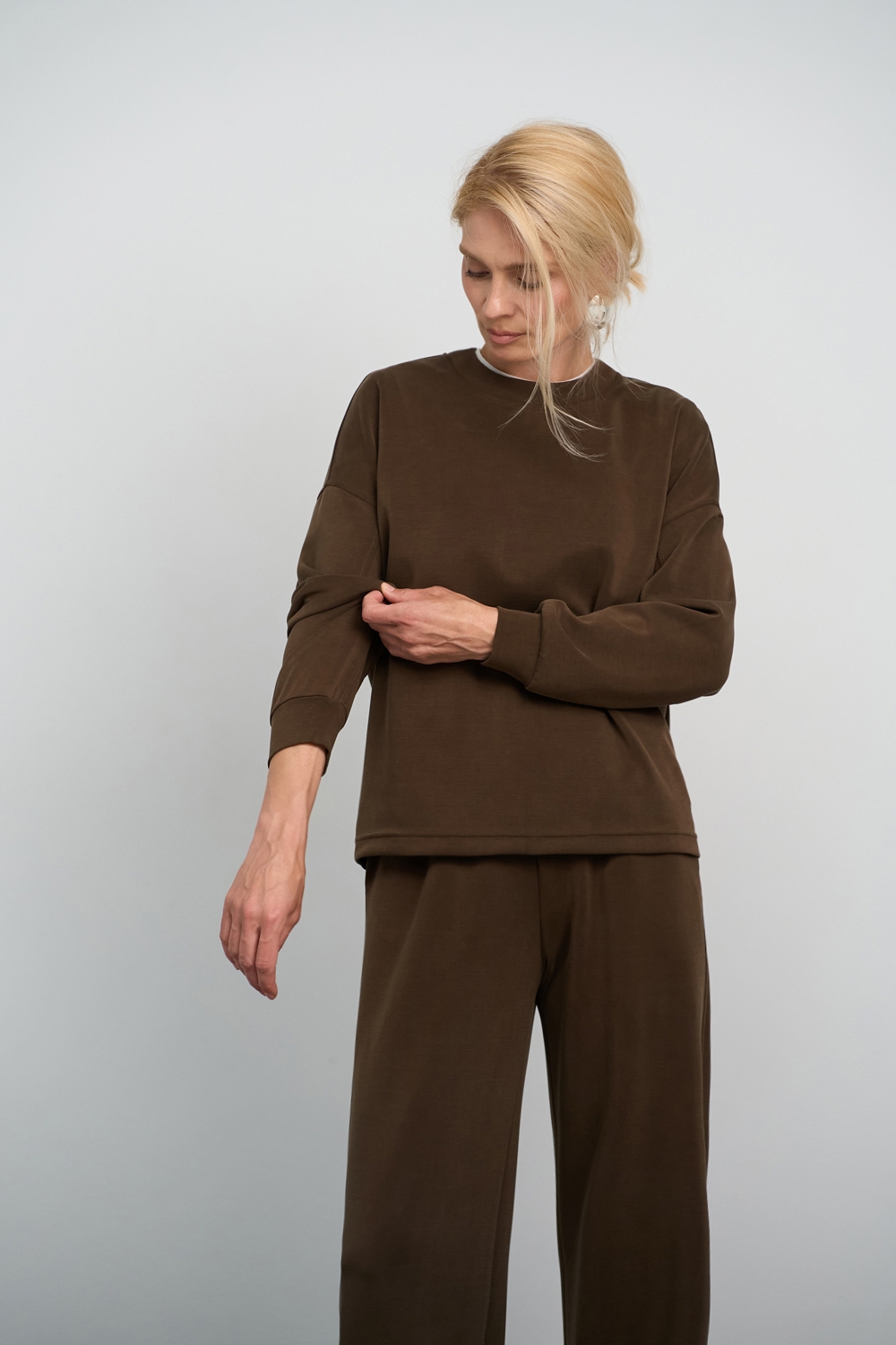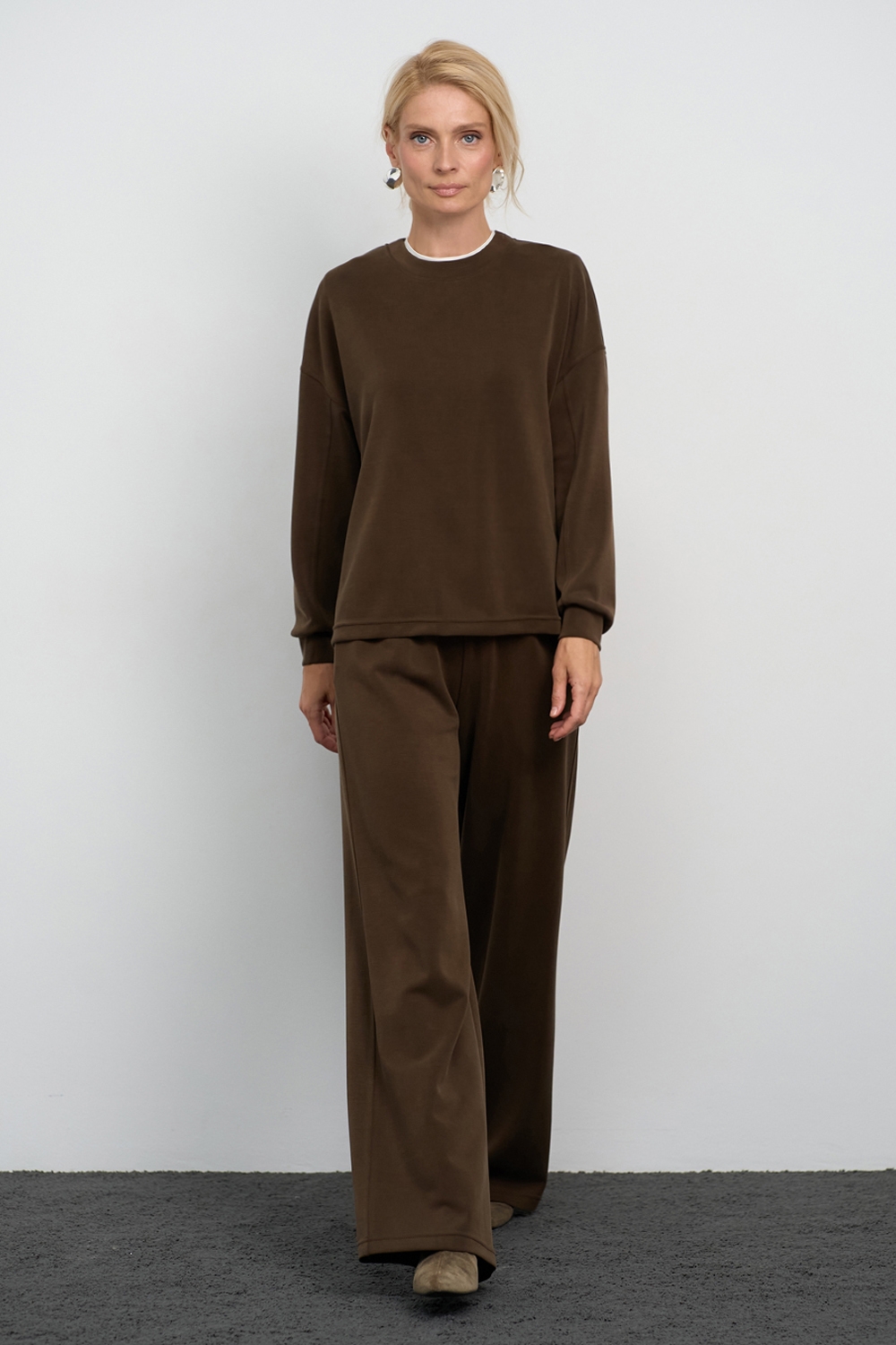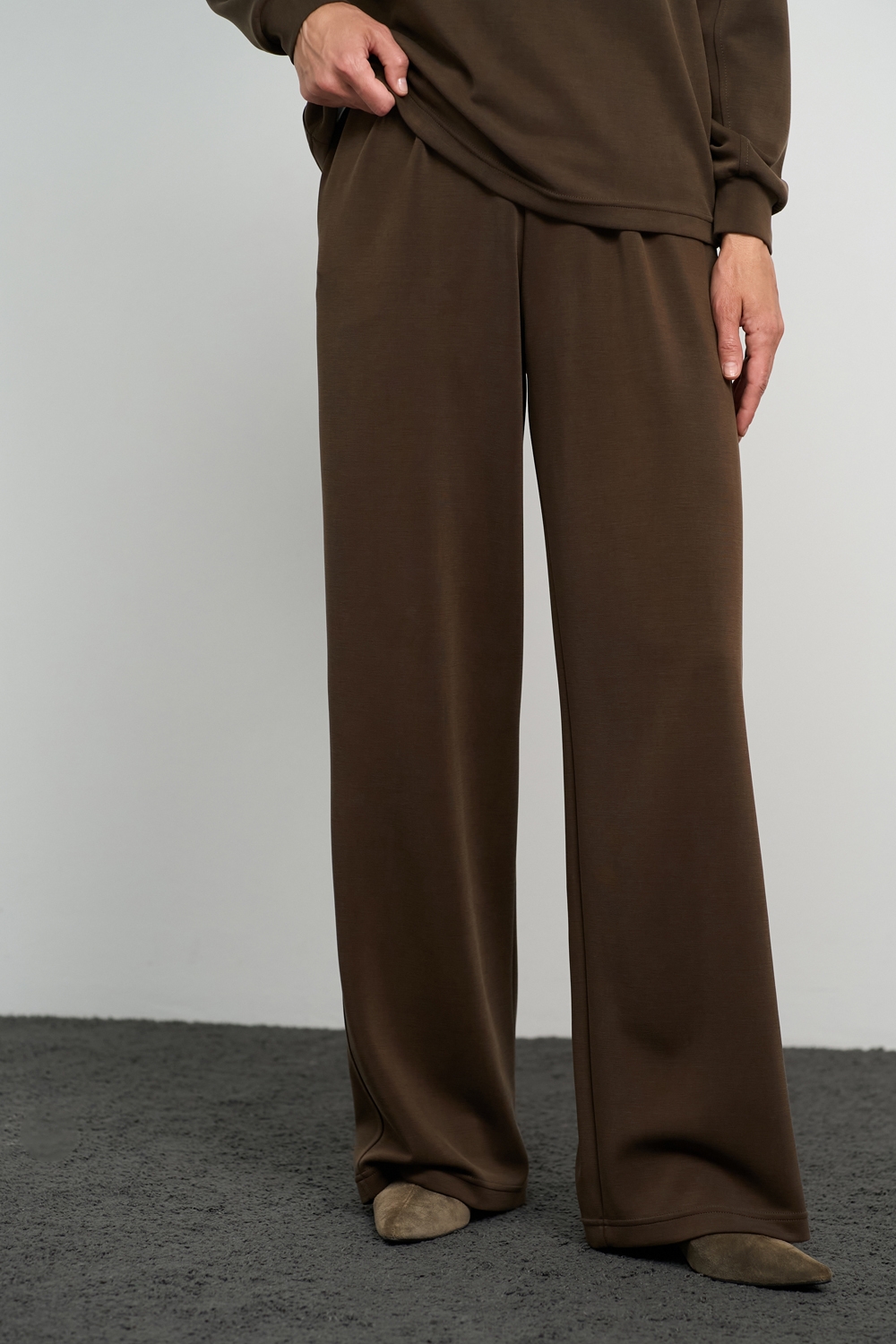 Трендовий костюм виконаний із м’якої, приємної до тіла тканини, що гарно драпірується. Кофта вільного крою зі спущеною лінією плеча. Штани прямого силуету із еластичною резинкою на поясі.
