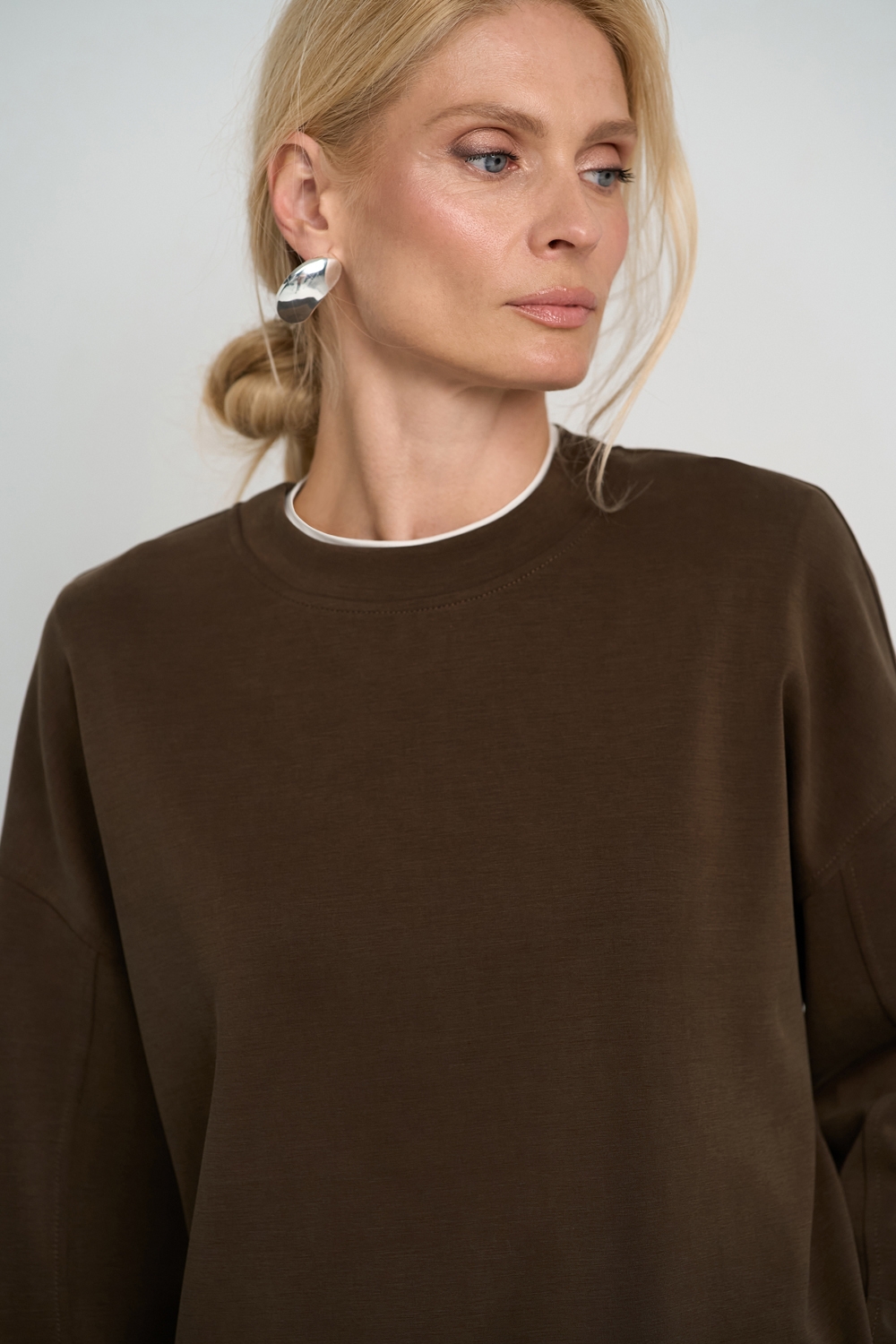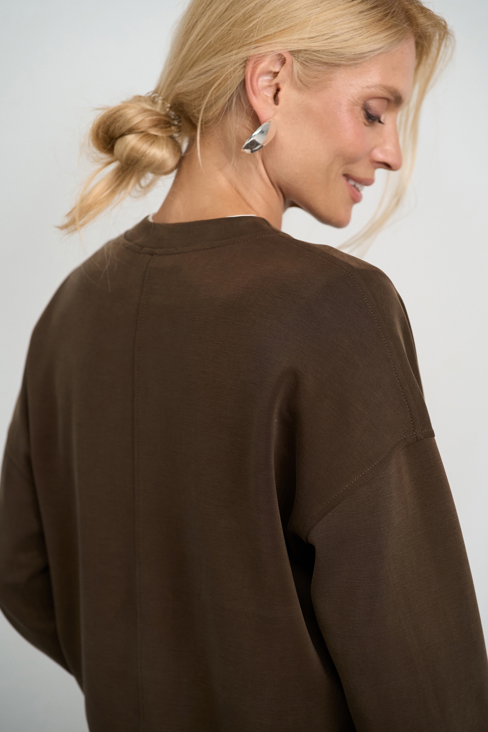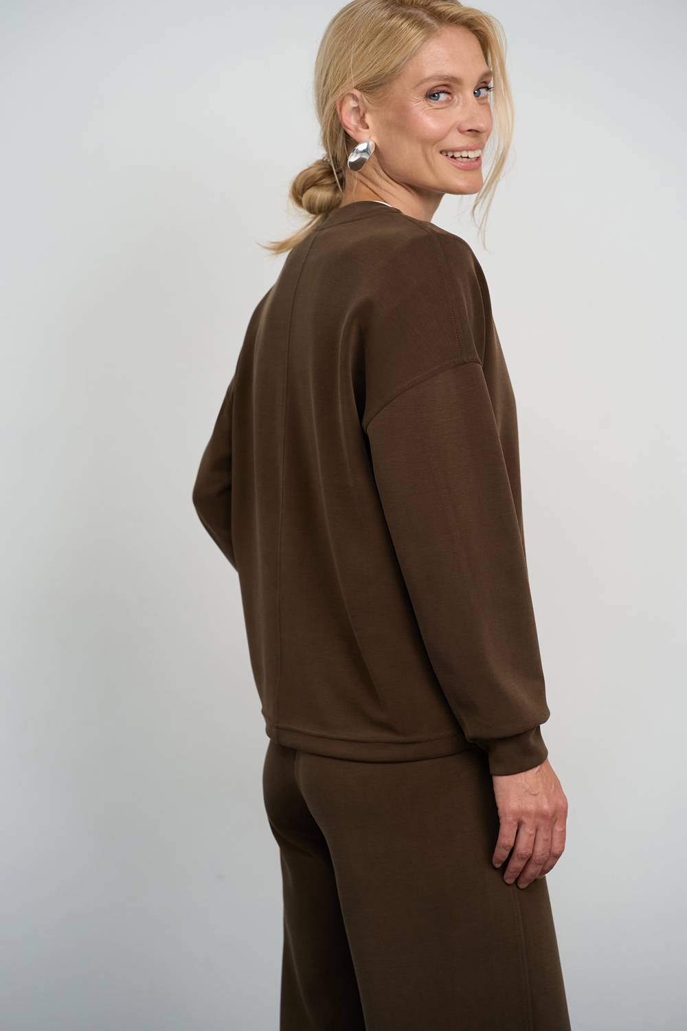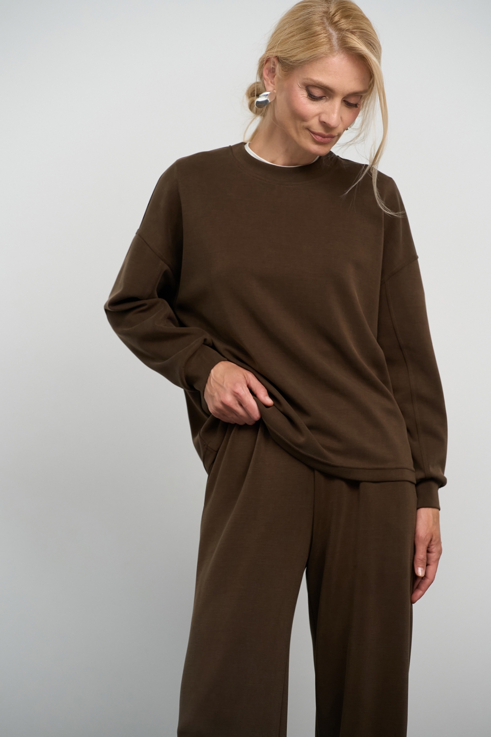 Трендовий костюм виконаний із м’якої, приємної до тіла тканини, що гарно драпірується. Кофта вільного крою зі спущеною лінією плеча. Штани прямого силуету із еластичною резинкою на поясі.
