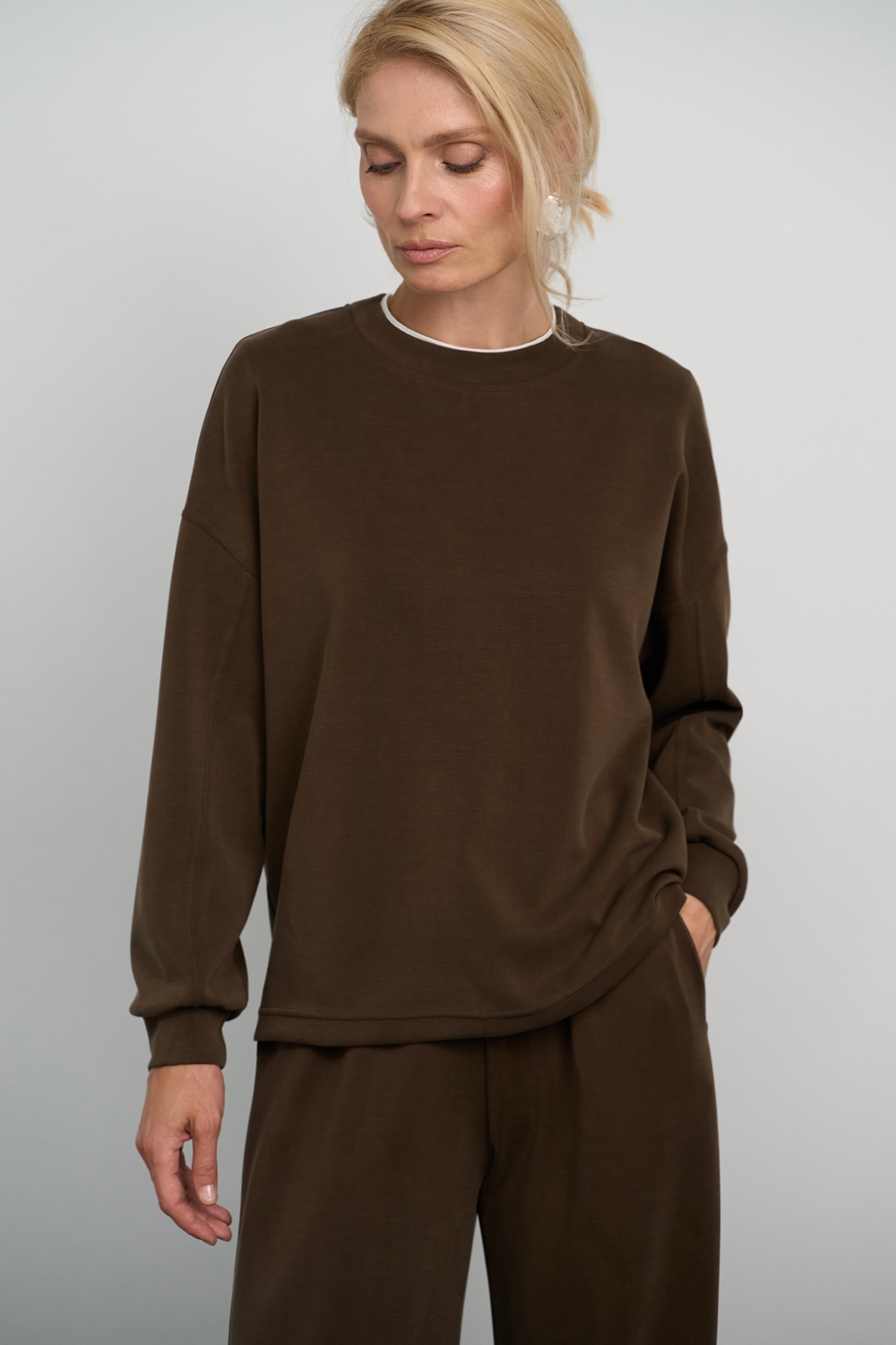 Трендовий костюм виконаний із м’якої, приємної до тіла тканини, що гарно драпірується. Кофта вільного крою зі спущеною лінією плеча. Штани прямого силуету із еластичною резинкою на поясі.
