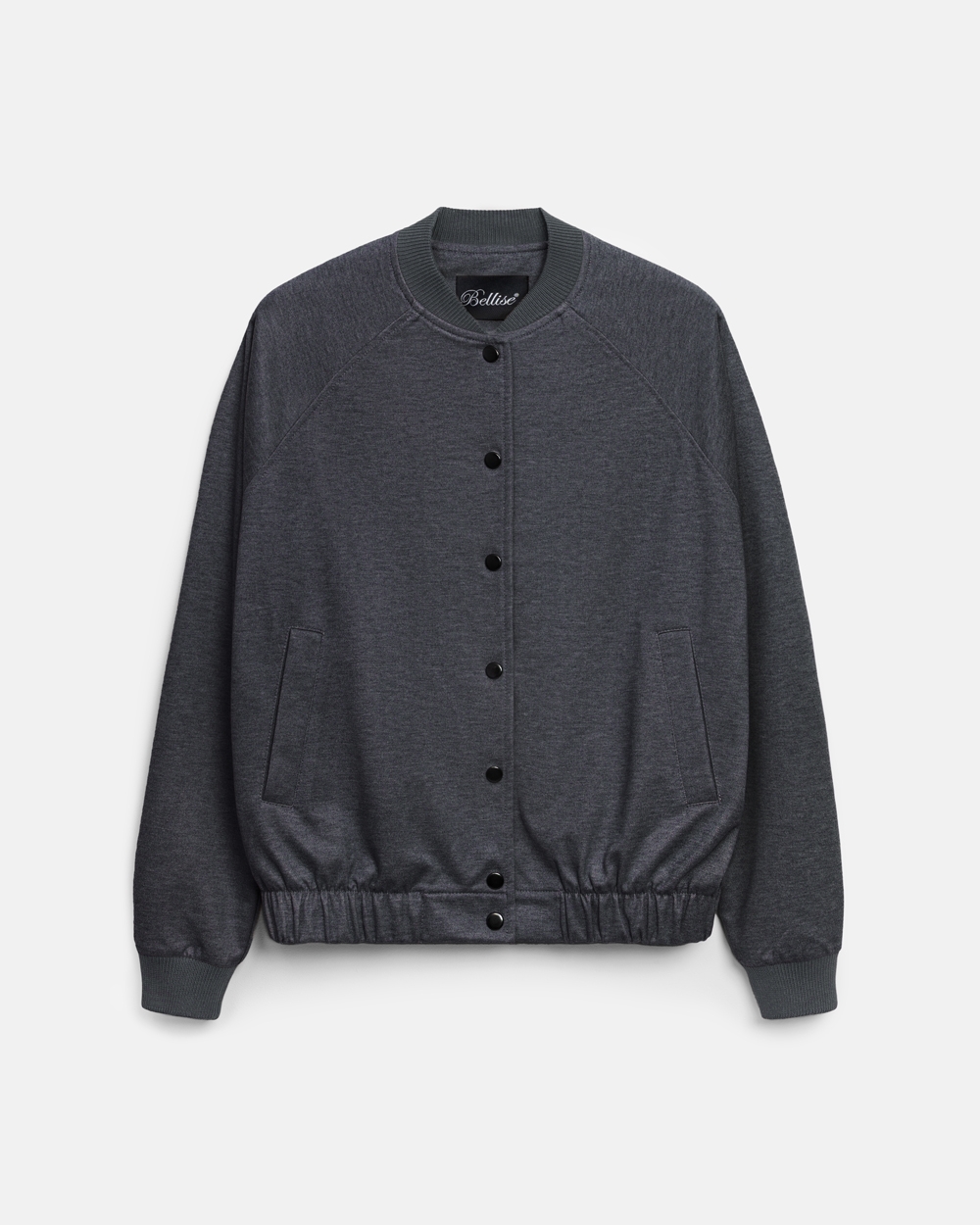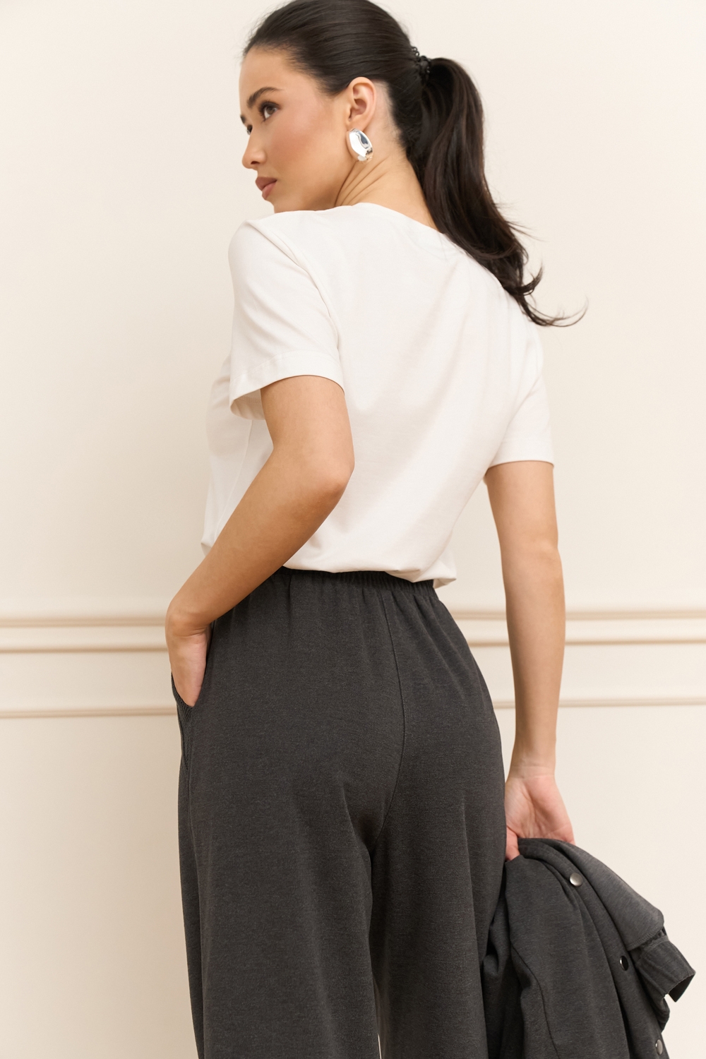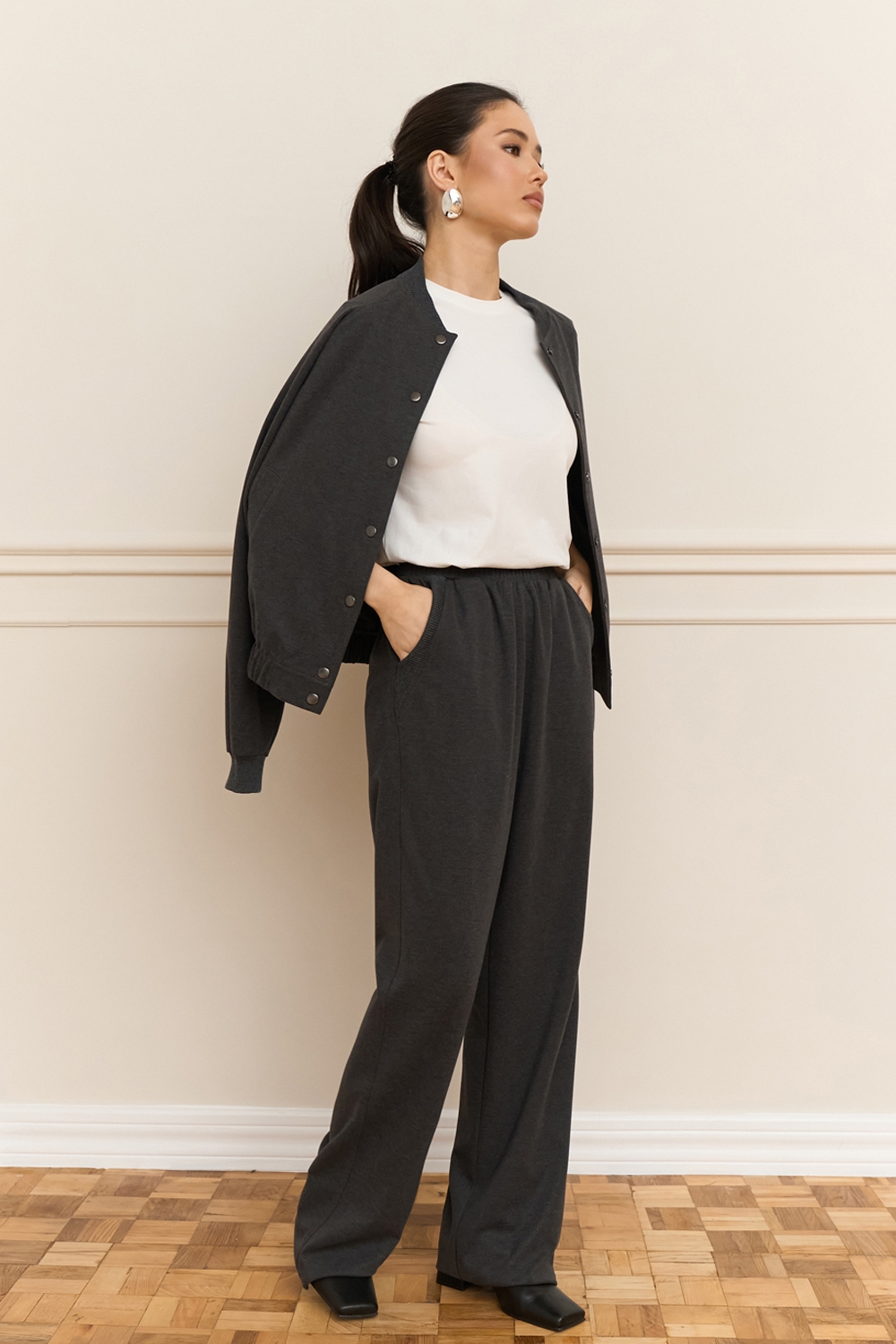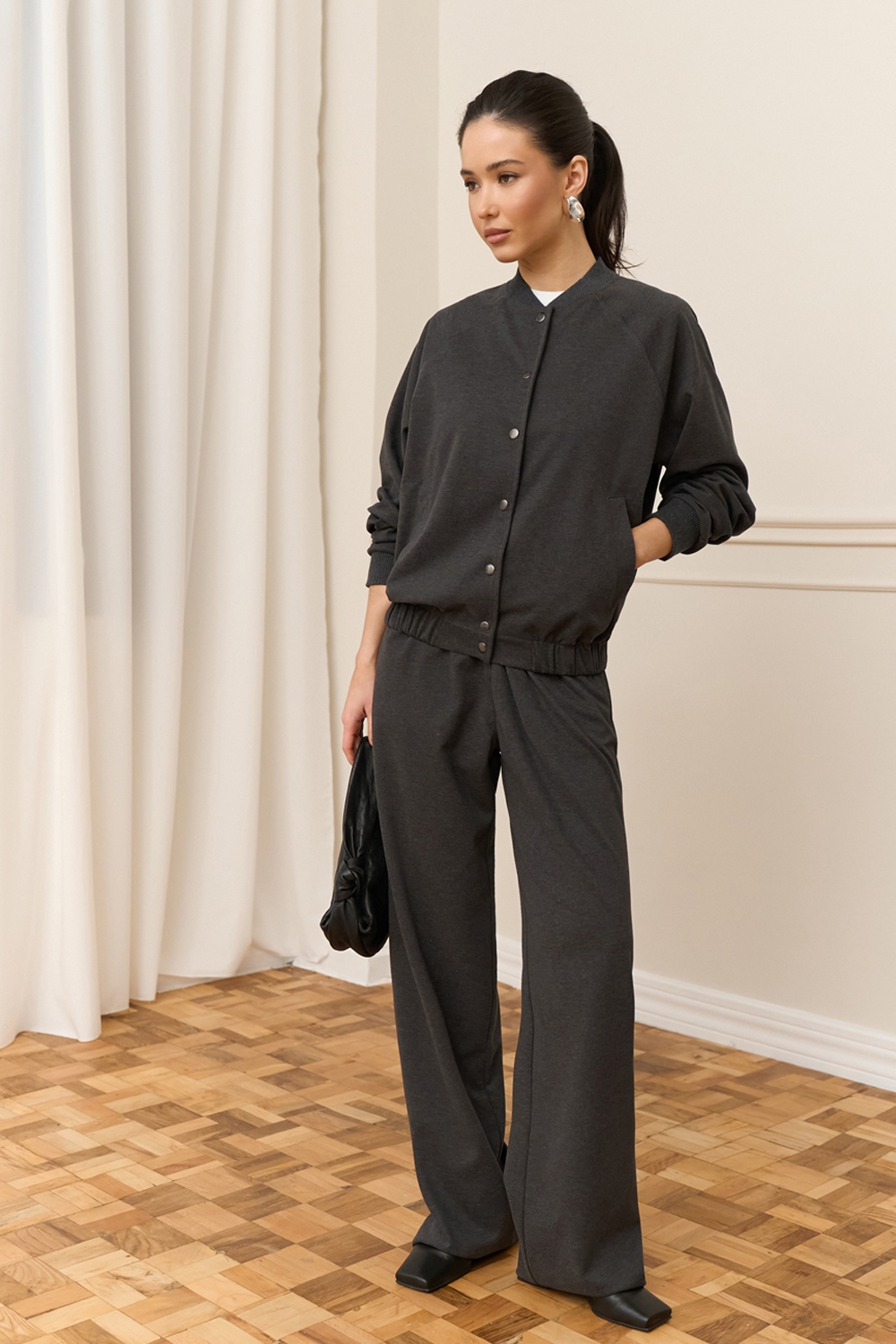 Костюм з віскозної тканини з додаванням бавовни. Бомбер у розслабленому стилі, оздоблений трикотажними манжетами на горловині та рукавах. Штани з високою посадкою та комфортним еластичним поясом.
