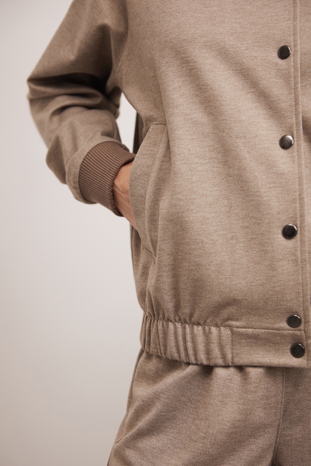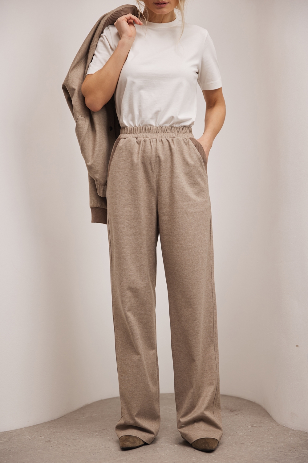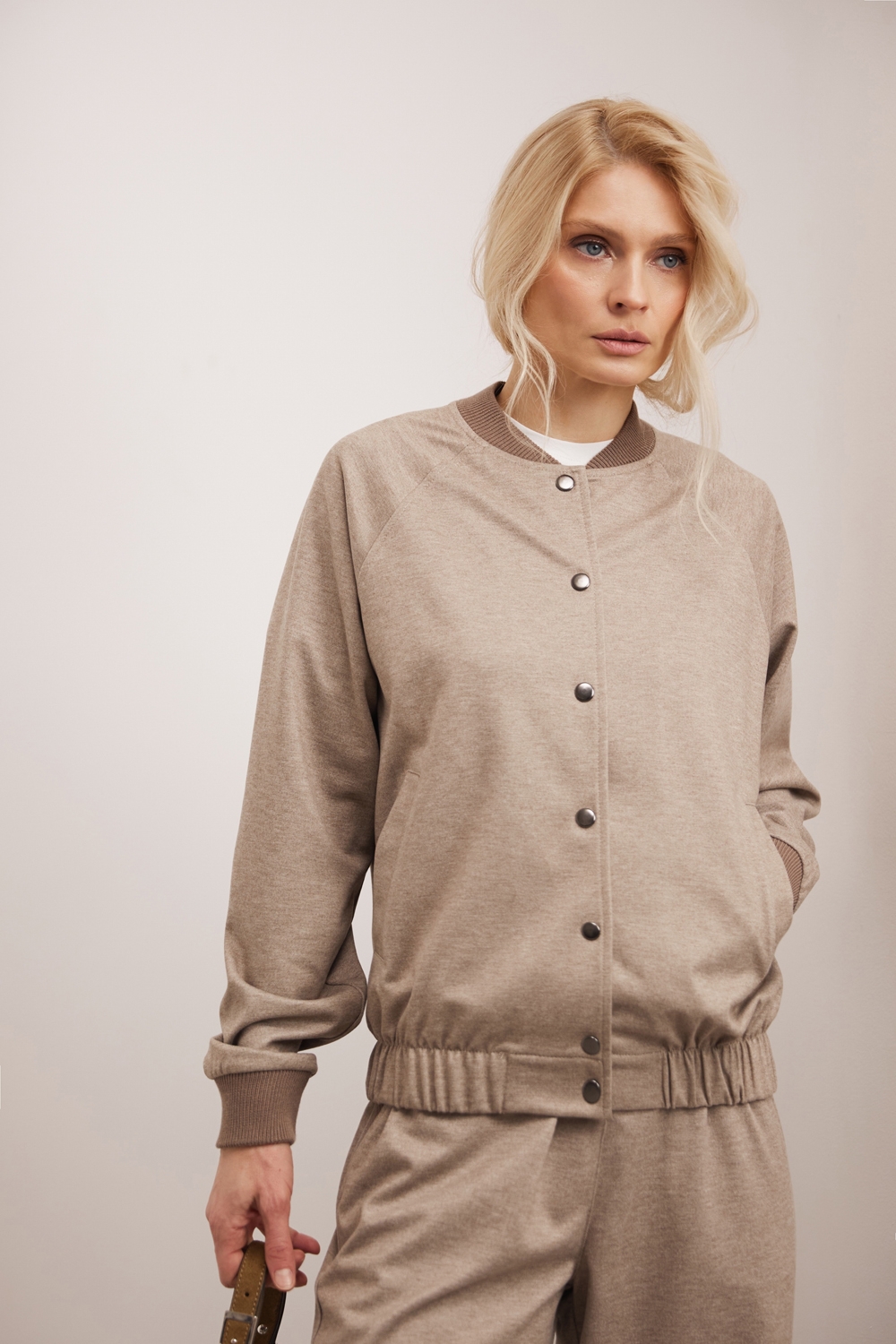 Костюм з віскозної тканини з додаванням бавовни. Бомбер у розслабленому стилі, оздоблений трикотажними манжетами на горловині та рукавах. Штани з високою посадкою та комфортним еластичним поясом.