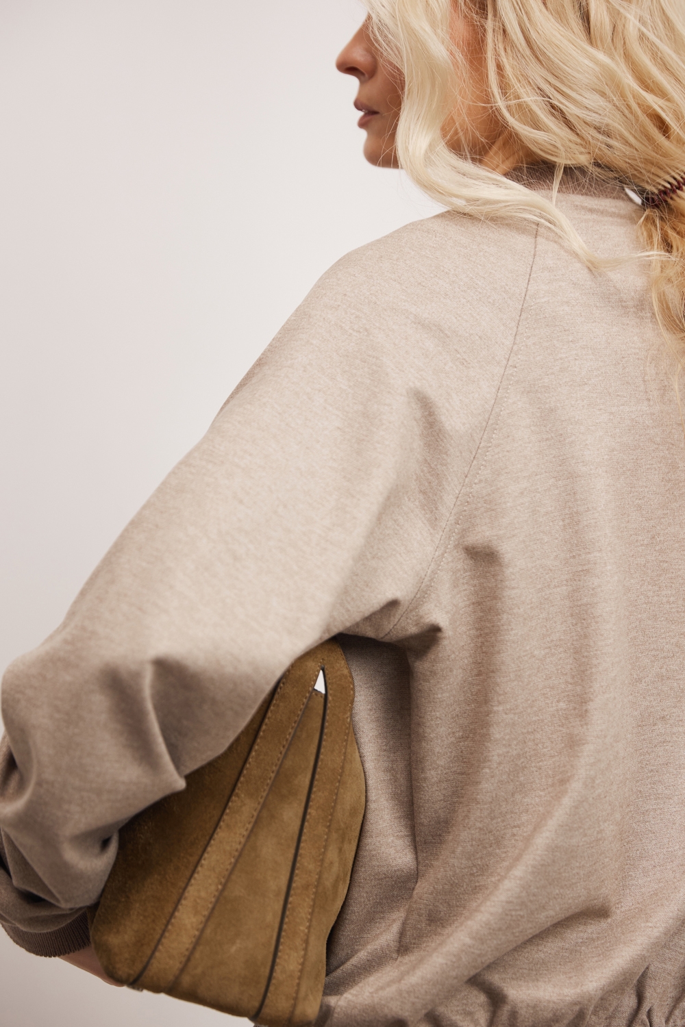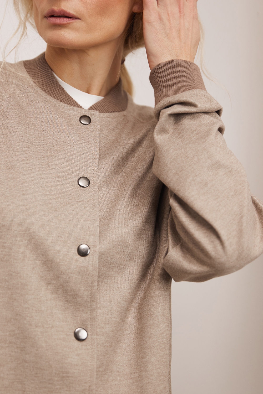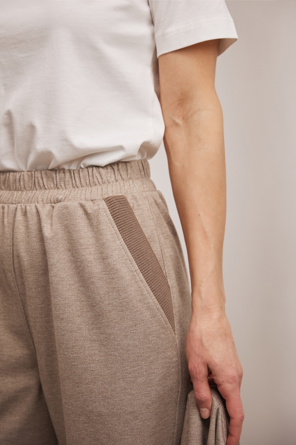Костюм з віскозної тканини з додаванням бавовни. Бомбер у розслабленому стилі, оздоблений трикотажними манжетами на горловині та рукавах. Штани з високою посадкою та комфортним еластичним поясом.