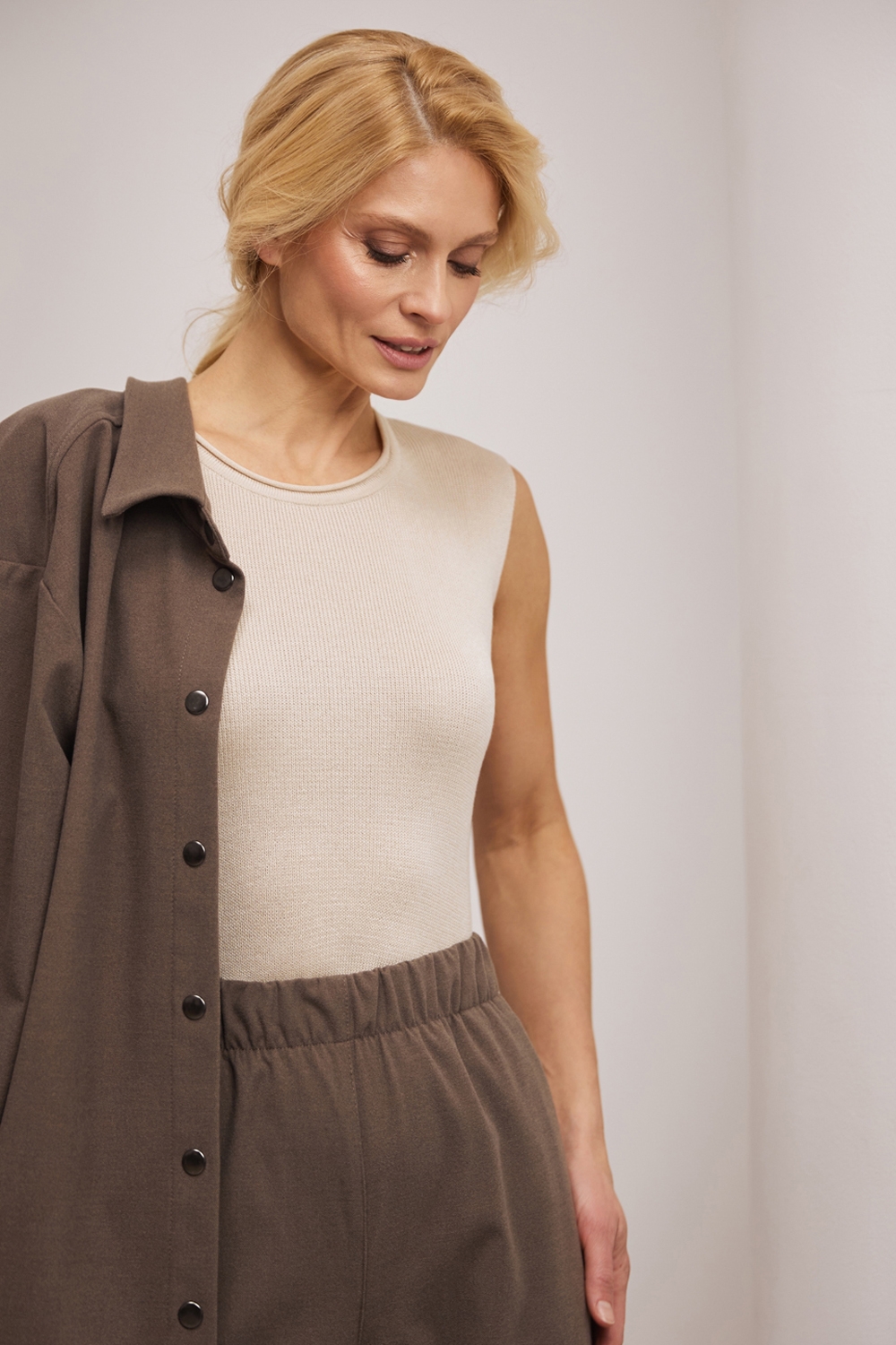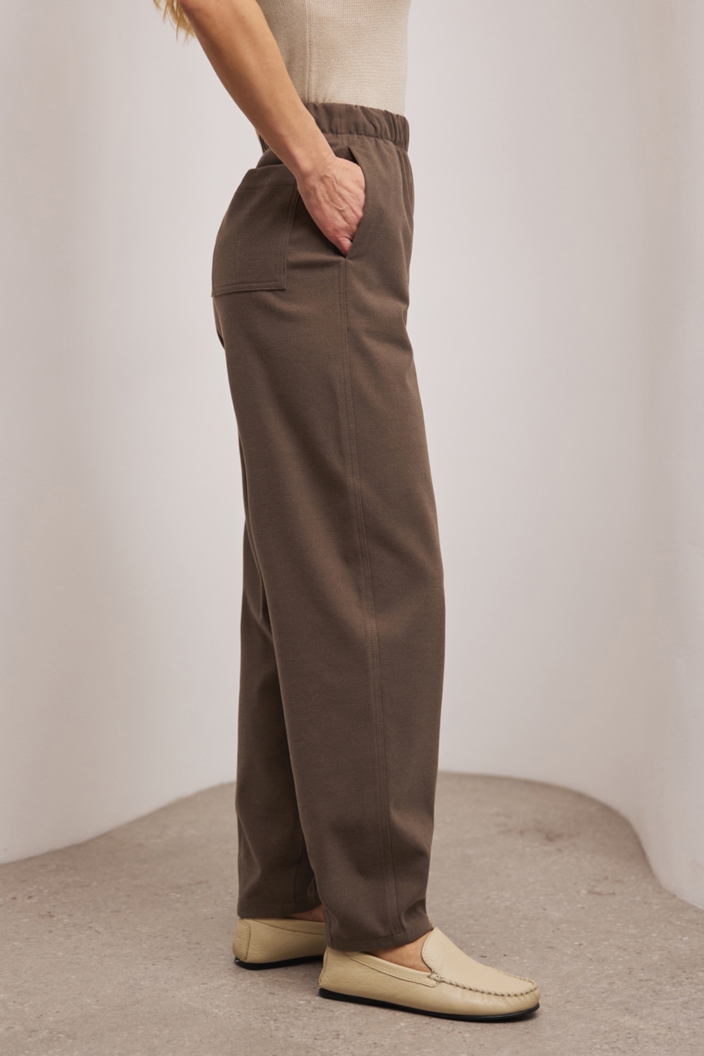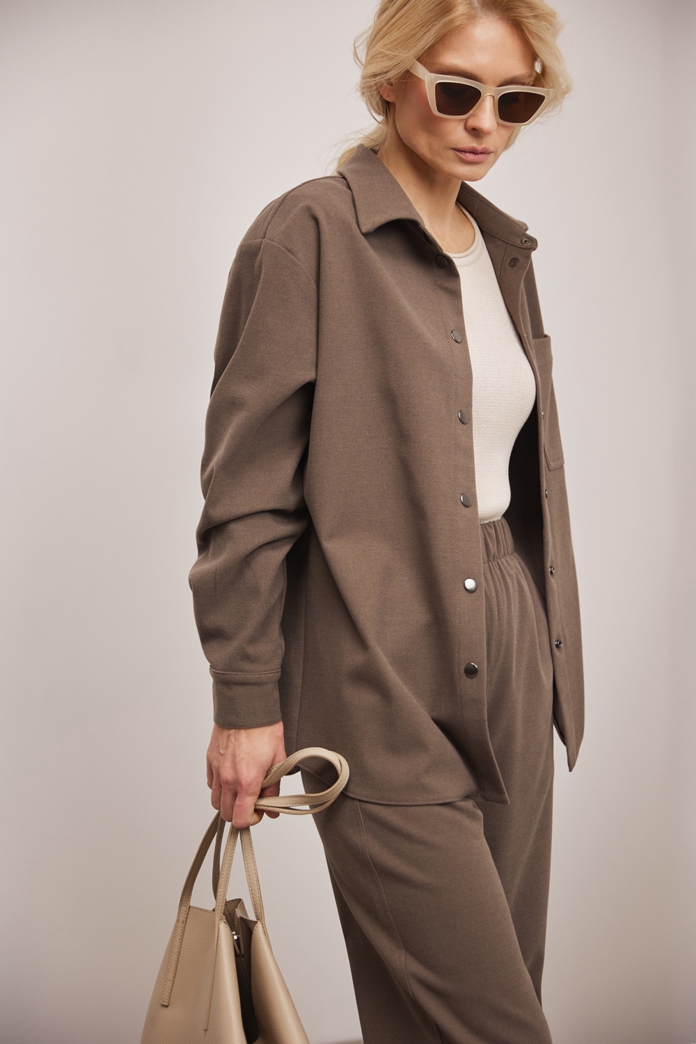 Костюм з щільної віскозної тканини з додаванням вовни. Матеріал м’який і приємний на дотик. Модель вільного фасону, гарно тримає форму.
