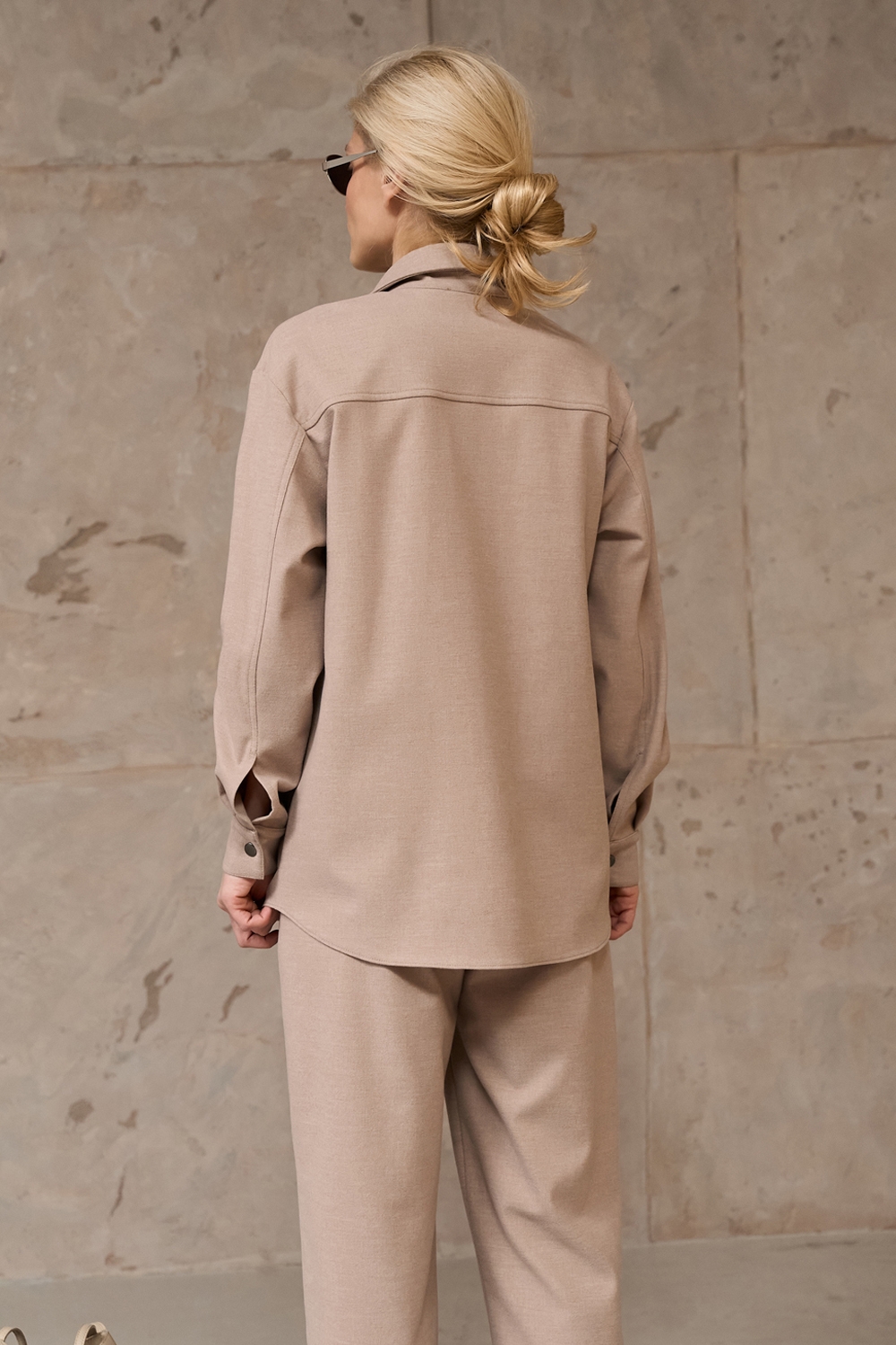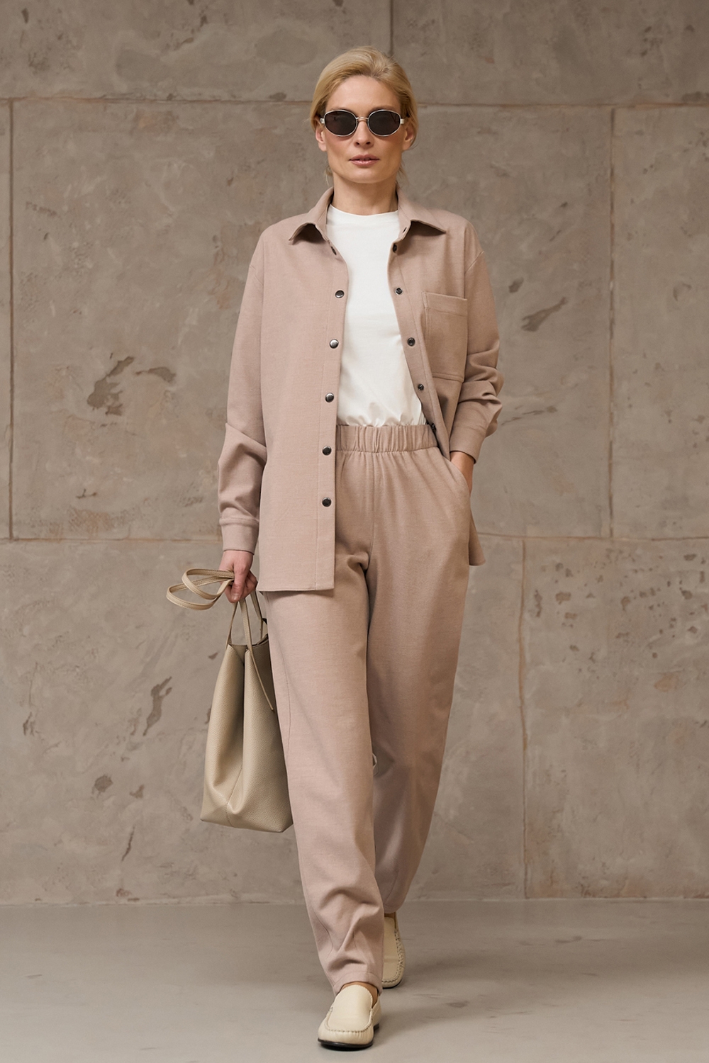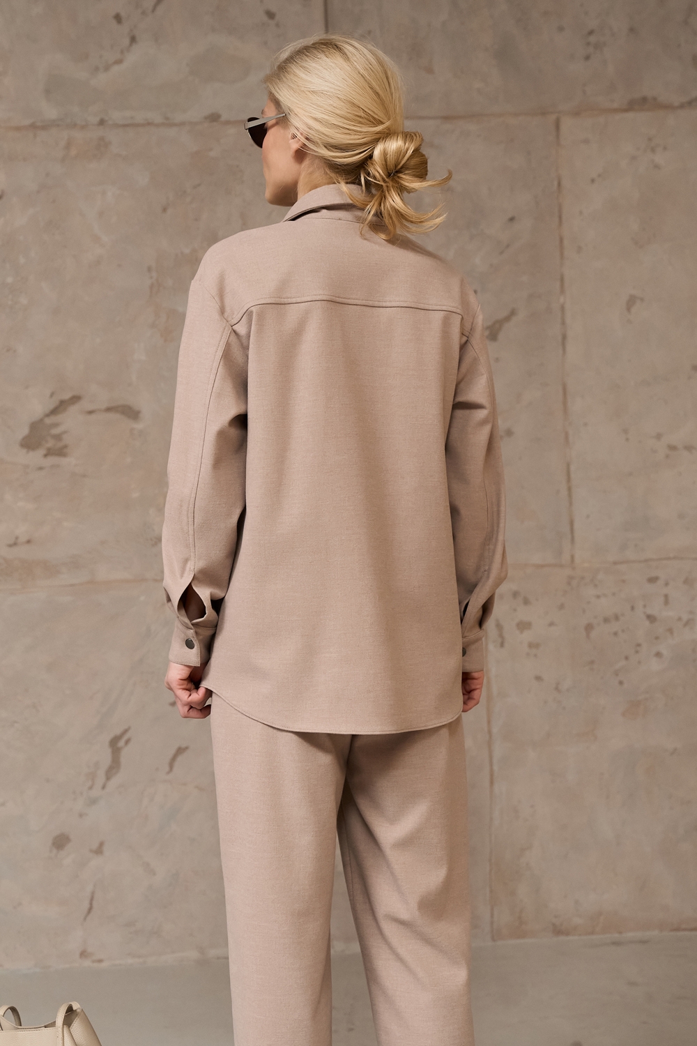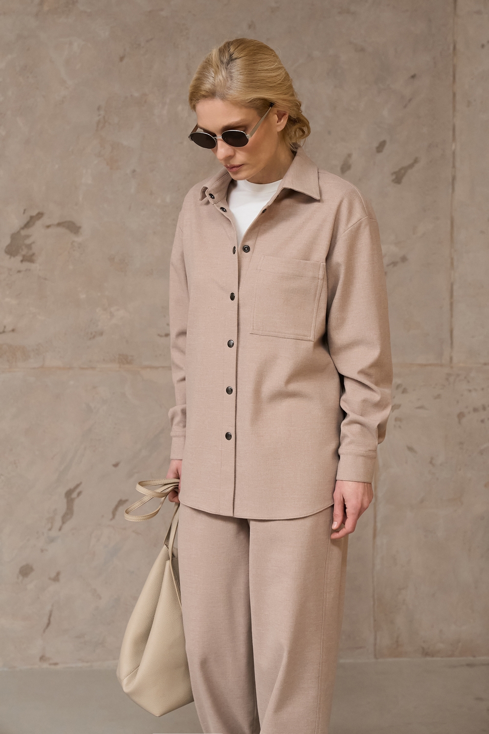 Костюм з щільної віскозної тканини з додаванням вовни. Матеріал м’який і приємний на дотик. Модель вільного фасону, гарно тримає форму.