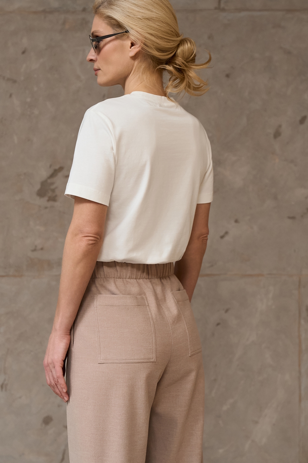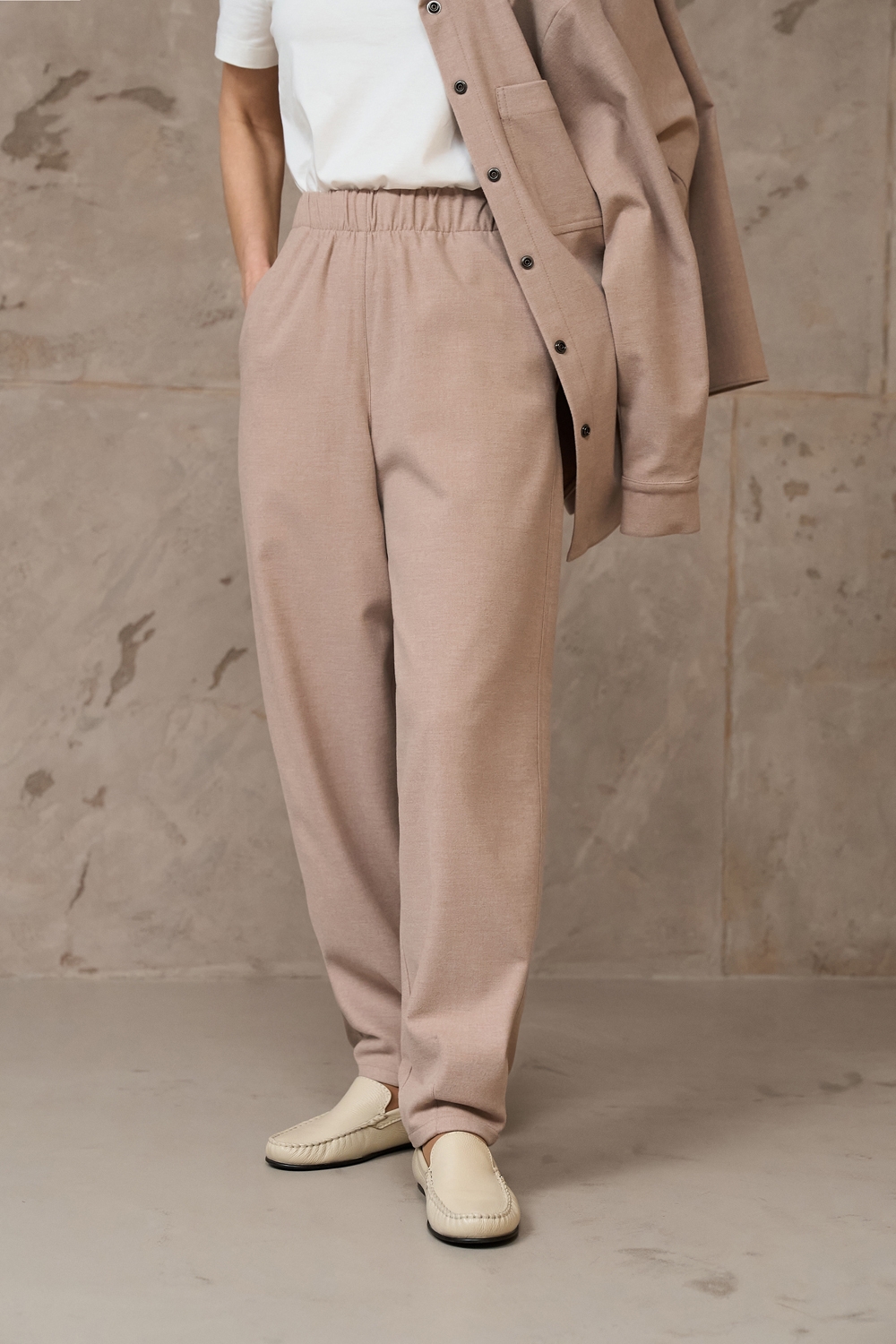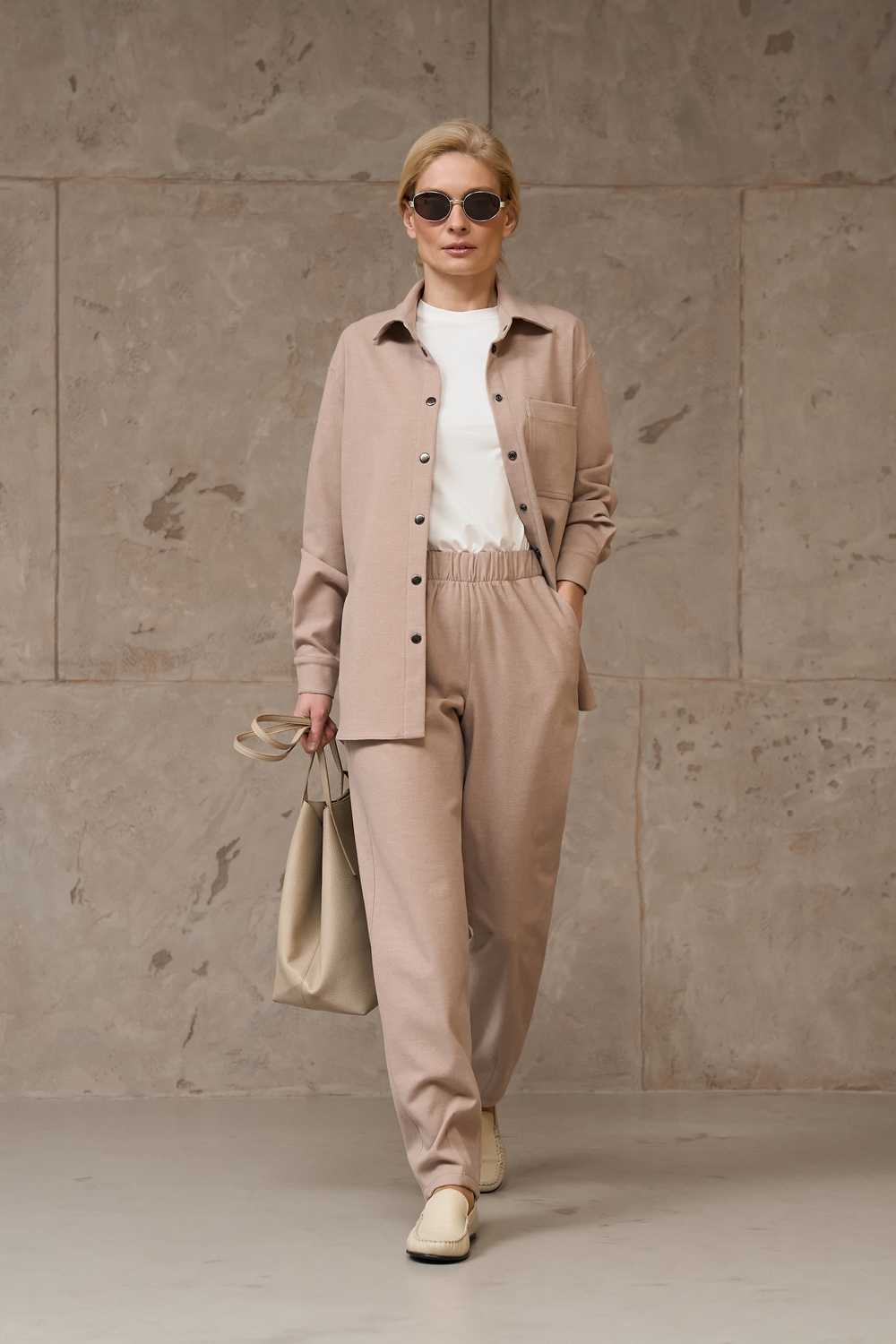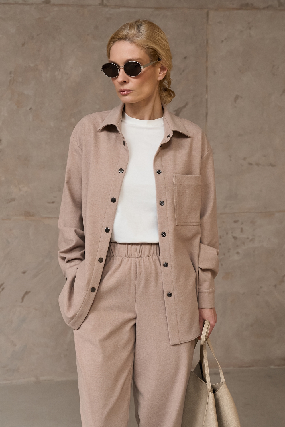 Костюм з щільної віскозної тканини з додаванням вовни. Матеріал м’який і приємний на дотик. Модель вільного фасону, гарно тримає форму.