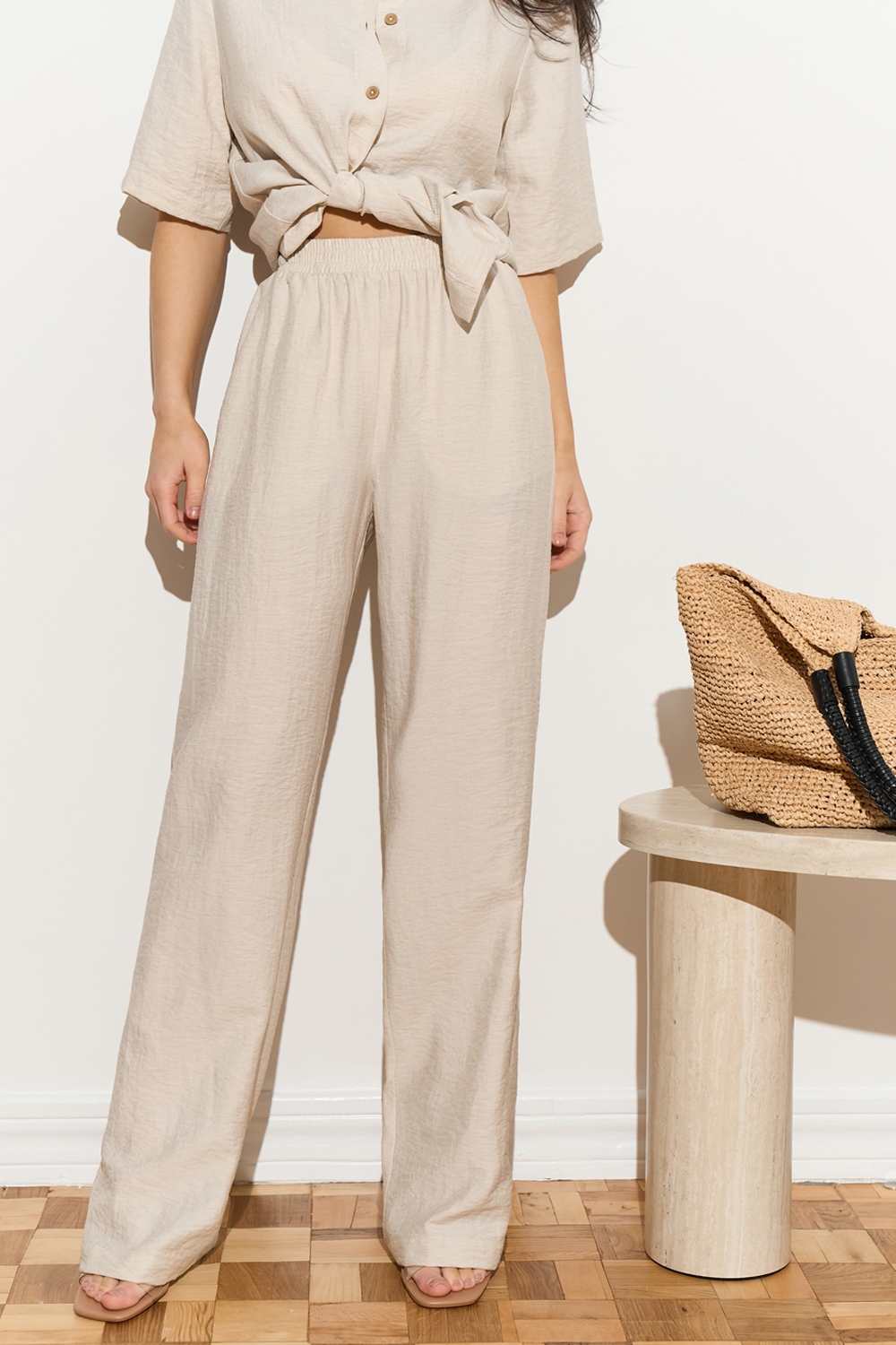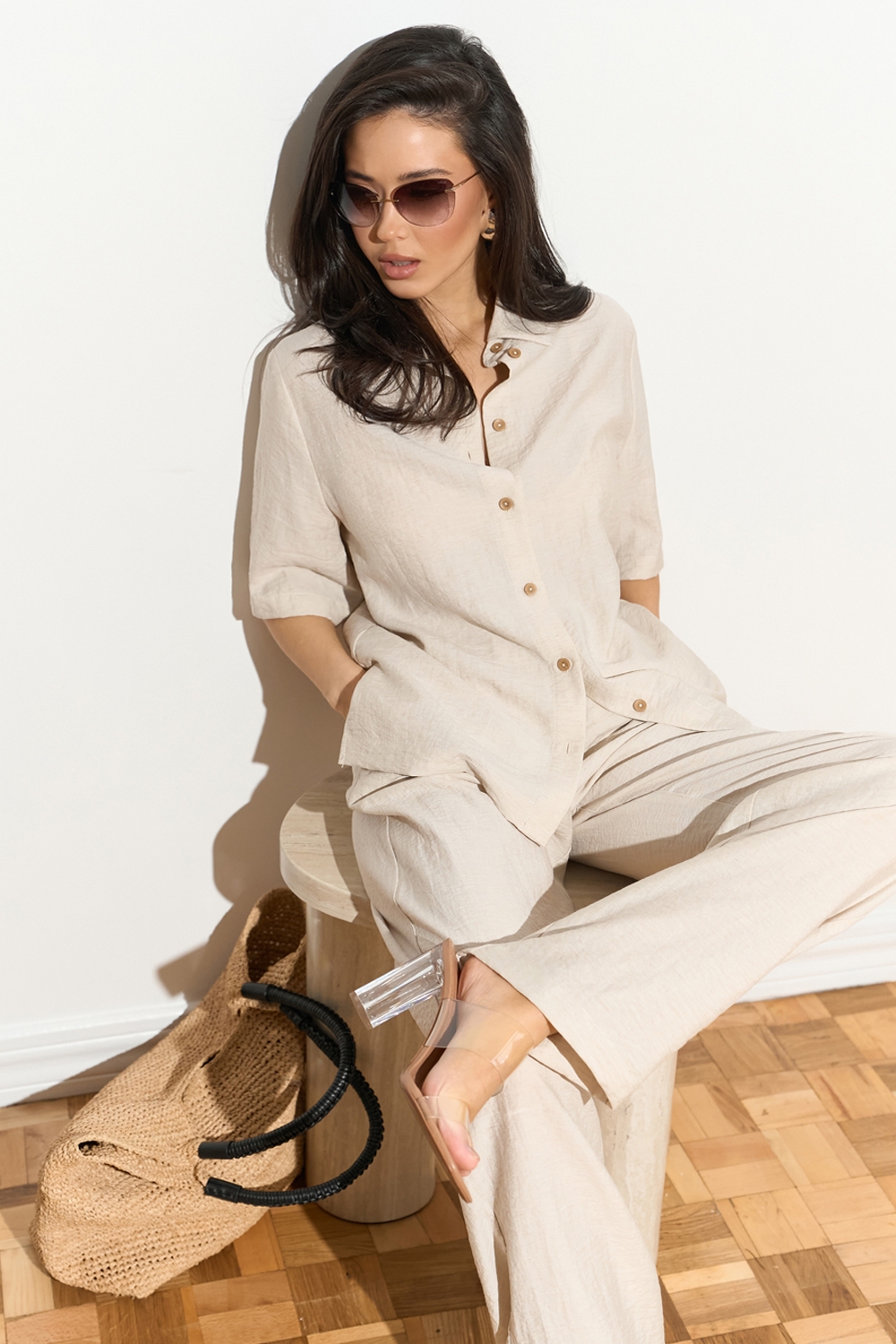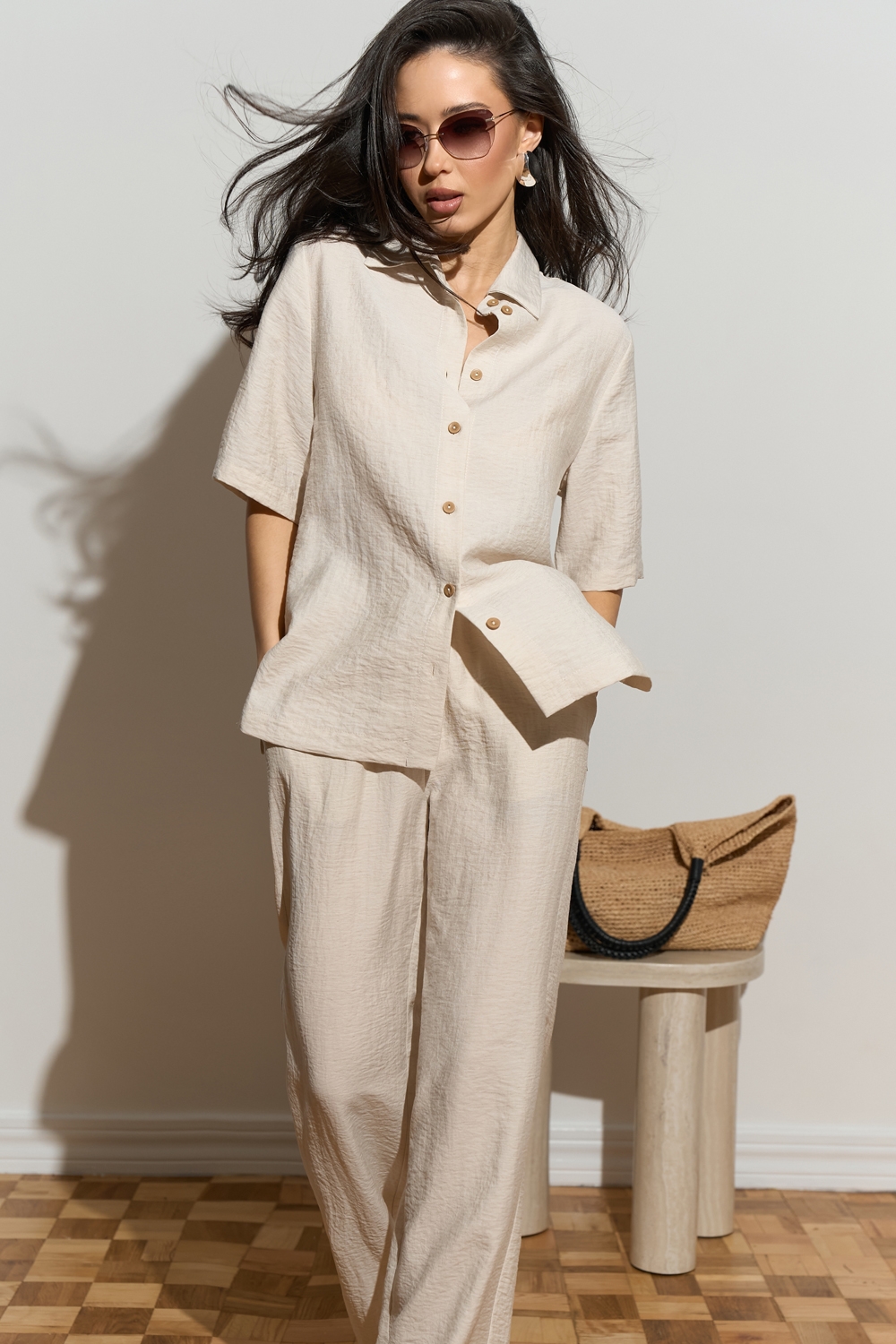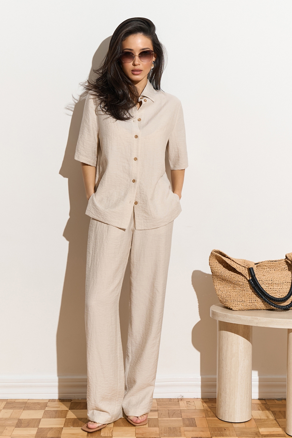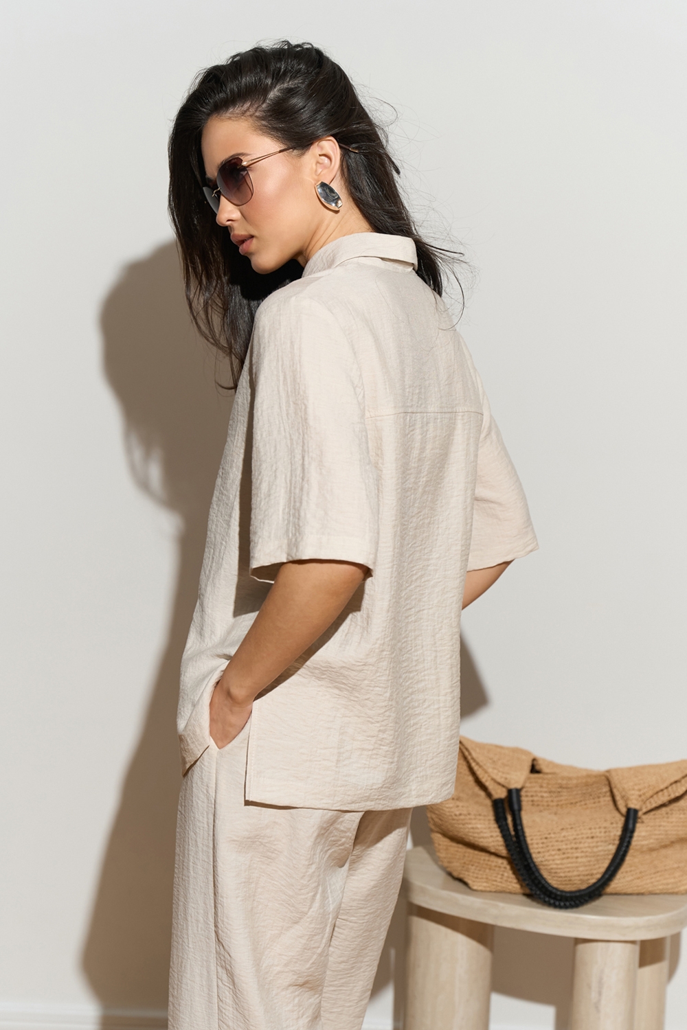 Зручний комплект із сорочки вільного крою та штанів прямого фасону із високою посадкою. Виготовлений із легкої, дихаючої льняної тканини. Штани з м’якою резинкою на талії та кишенями в бокових швах.