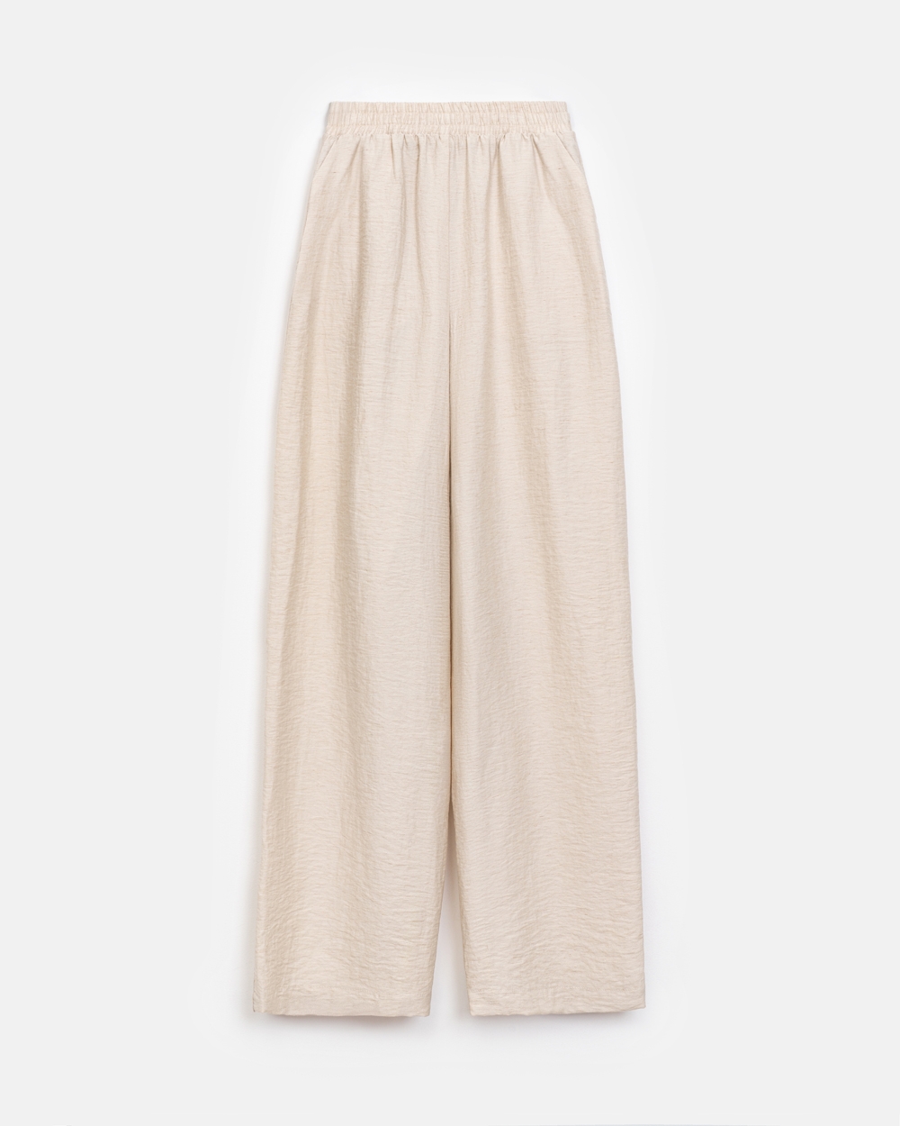 Зручний комплект із сорочки вільного крою та штанів прямого фасону із високою посадкою. Виготовлений із легкої, дихаючої льняної тканини. Штани з м’якою резинкою на талії та кишенями в бокових швах.