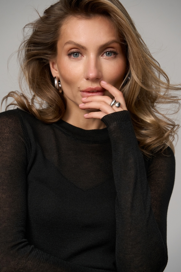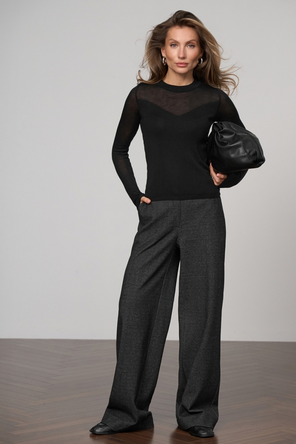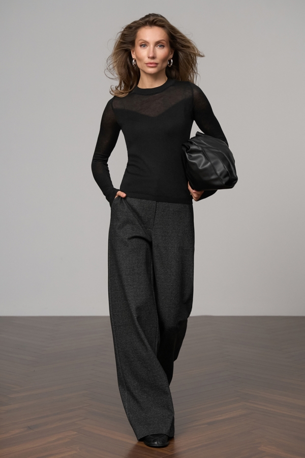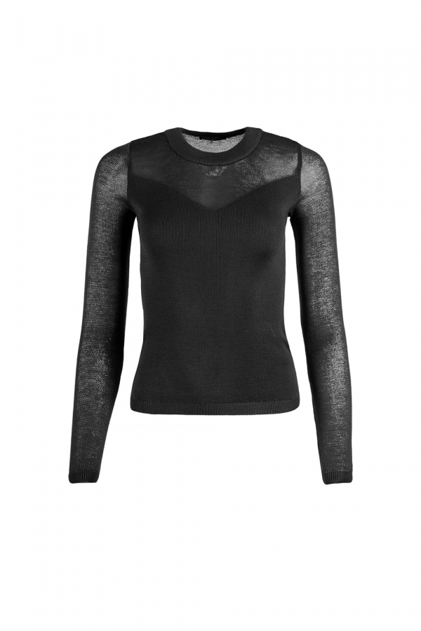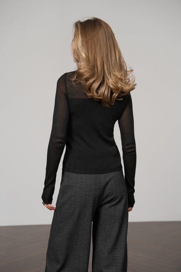 Ніжний лонгслів з супертонкої пряжі люксової якості з включенням віскози та бавовни. Напівпрозорий лонгслів прямого силуету в гладкому переплетенні. Акцент виробу - завуальоване декольте у формі трикутника.