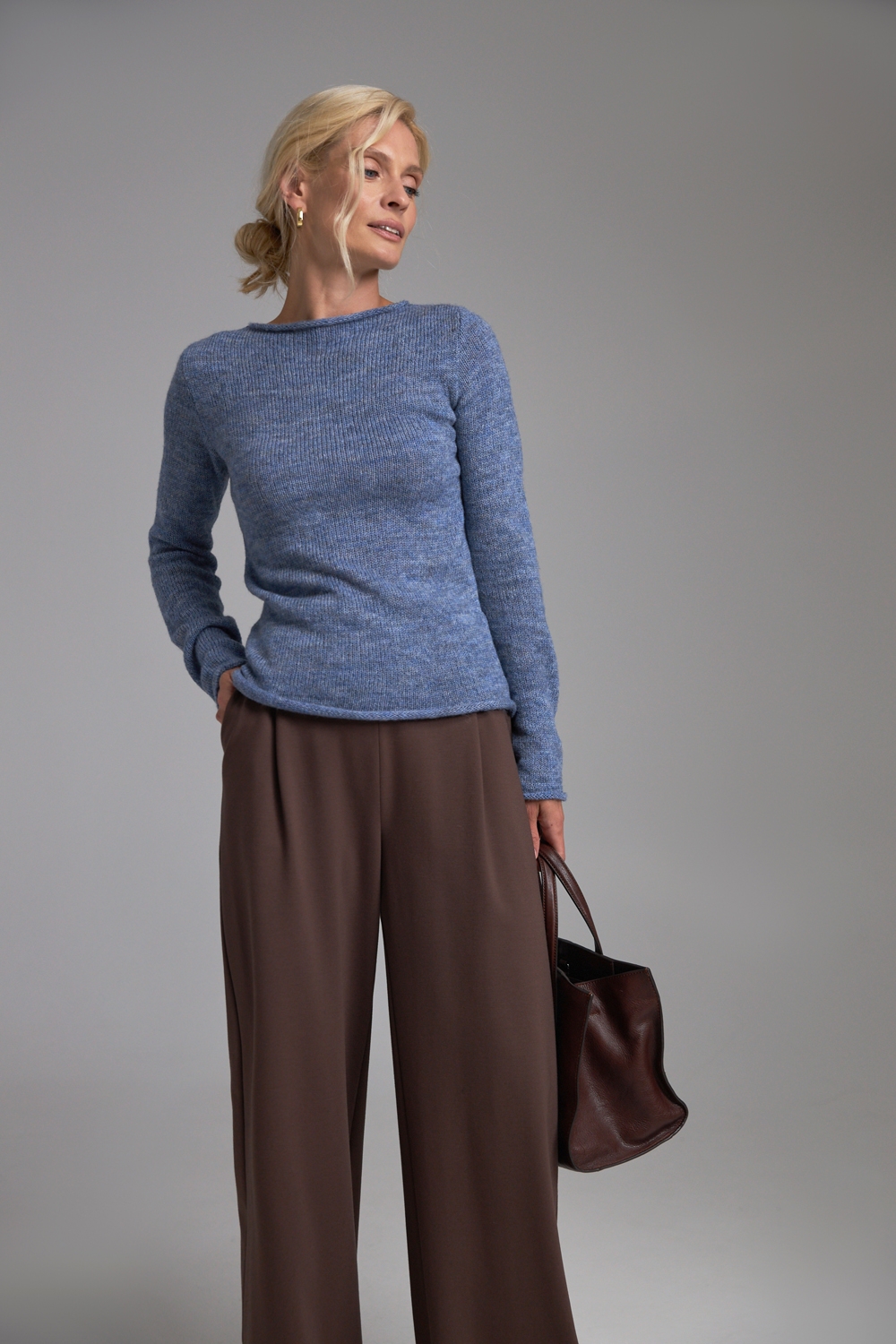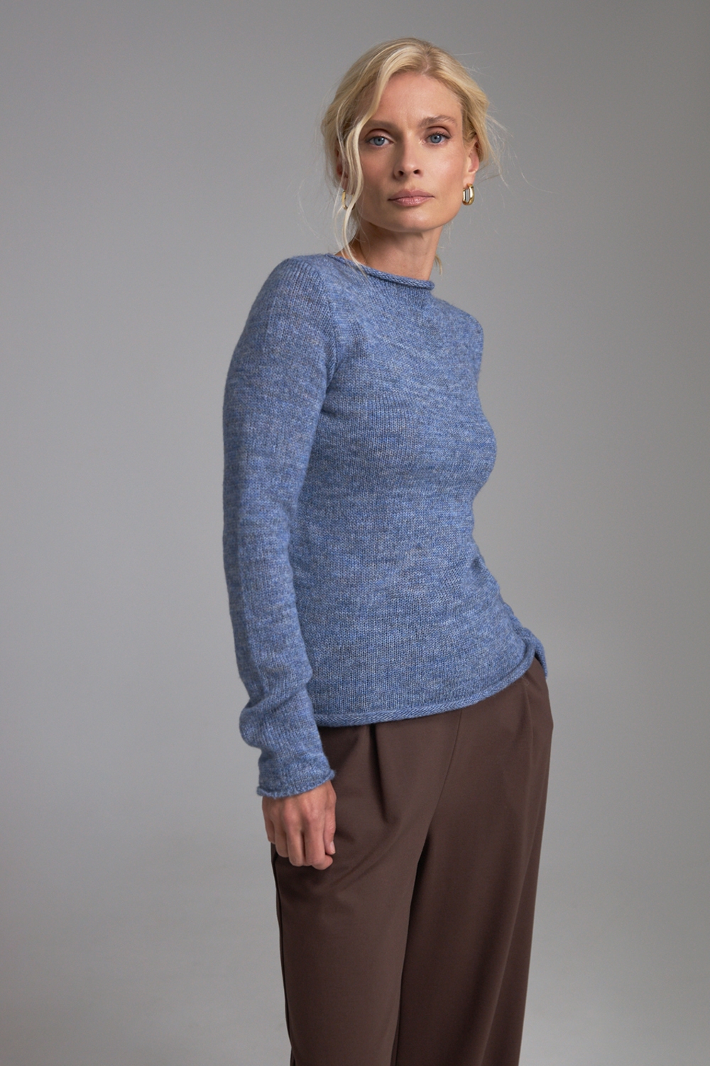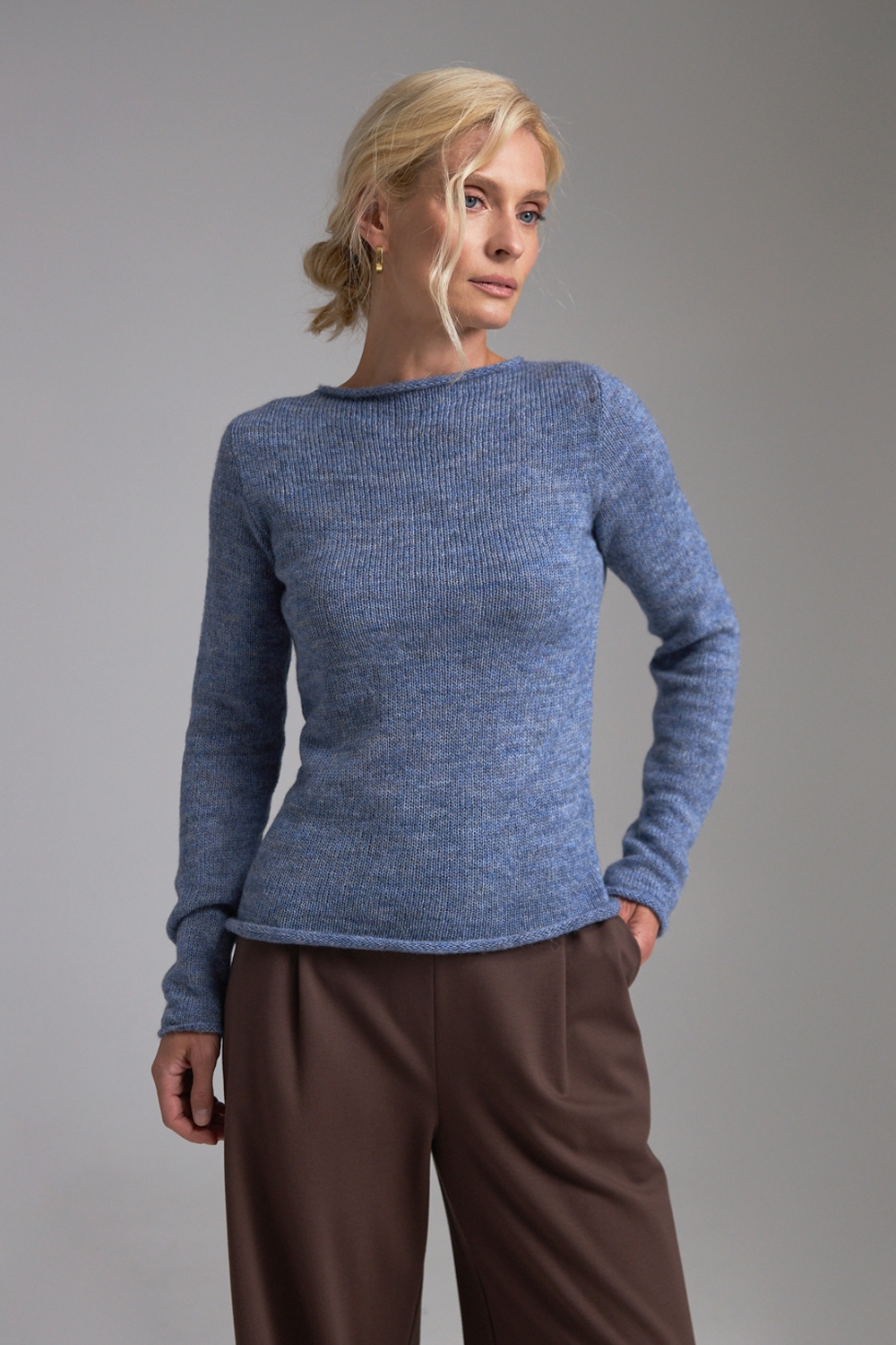Теплий напівпрозорий лонгслів із преміальної пряжі з високим вмістом вовни та мохеру. М’який на дотик, з акуратним руликом по краях горловини, рукавів та низу виробу.