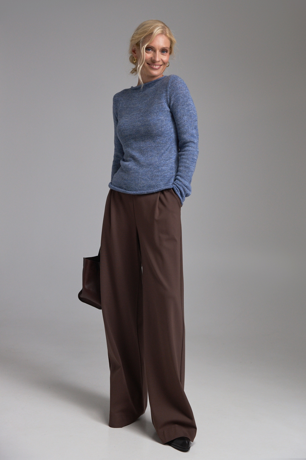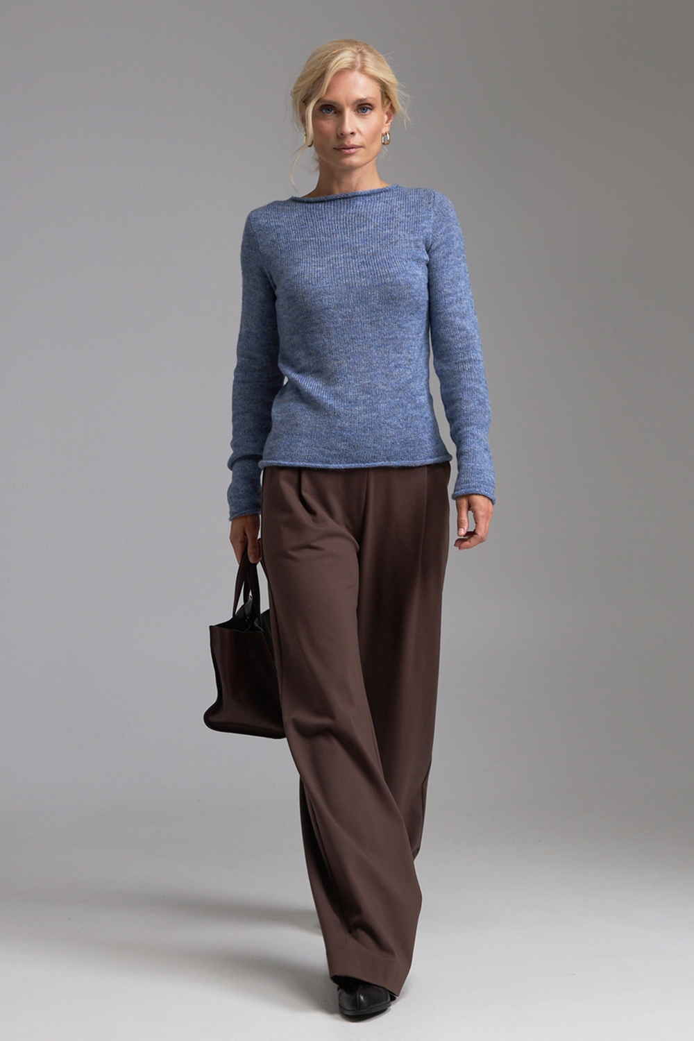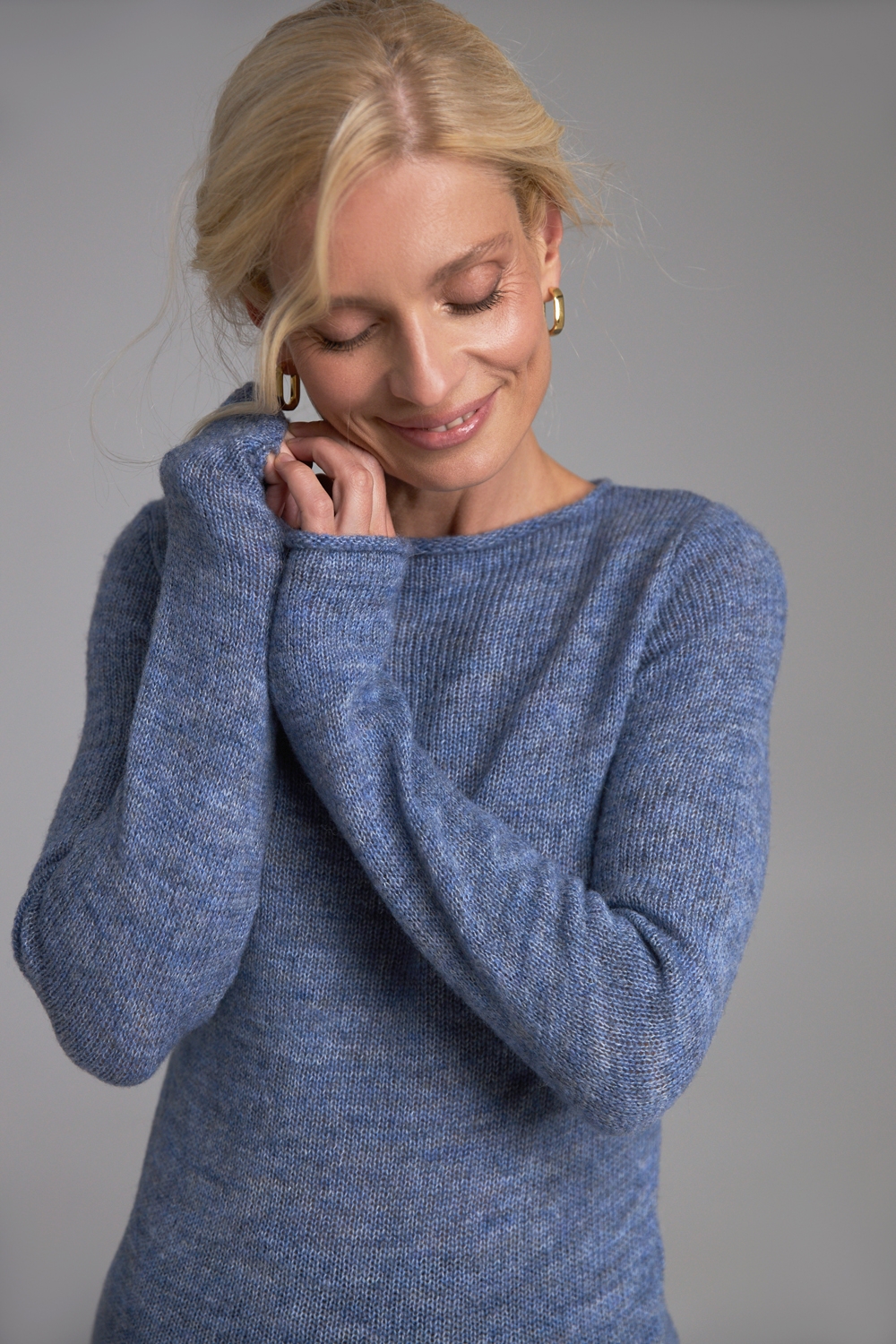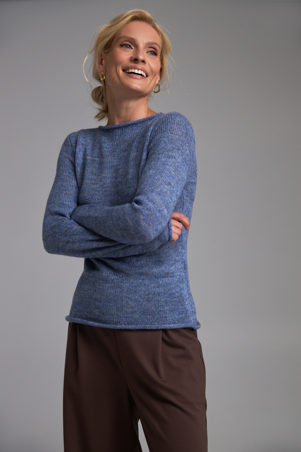 Теплий напівпрозорий лонгслів із преміальної пряжі з високим вмістом вовни та мохеру. М’який на дотик, з акуратним руликом по краях горловини, рукавів та низу виробу.