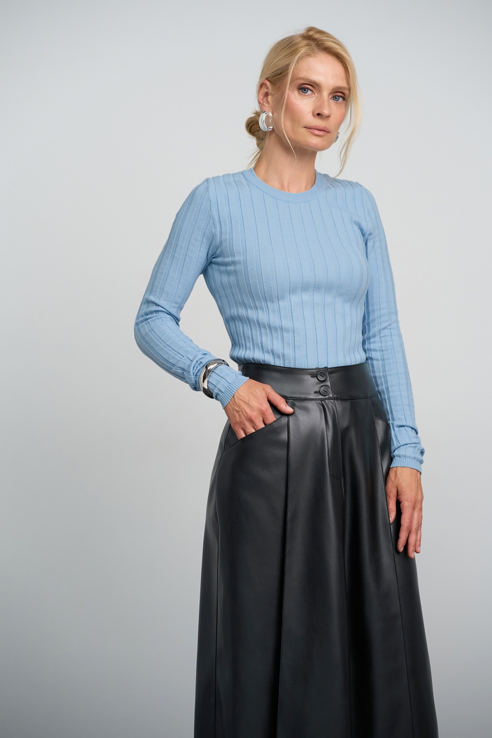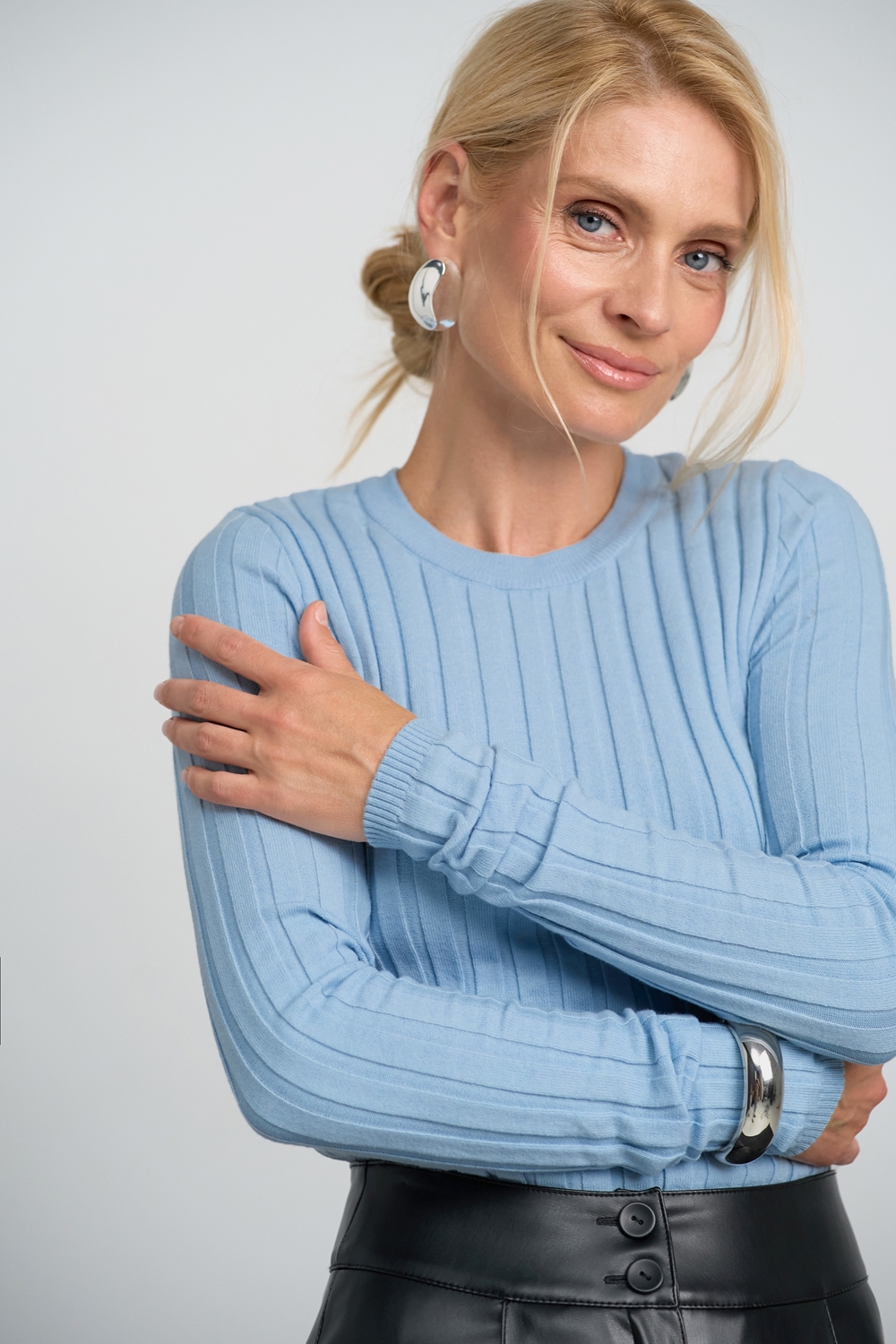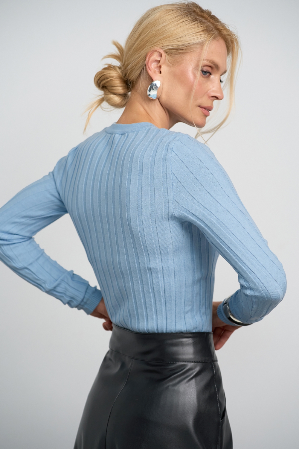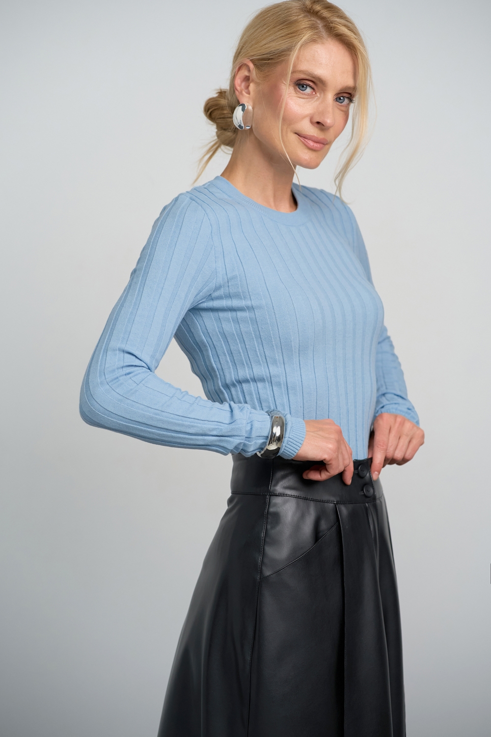 Витончений лонгслів зі стабільної в’язки зі шовковистої бавовняно-бамбукової пряжі. Модель еластична, м’яко прилягає до фігури. Фактурні вертикальні смужки візуально подовжують силует.