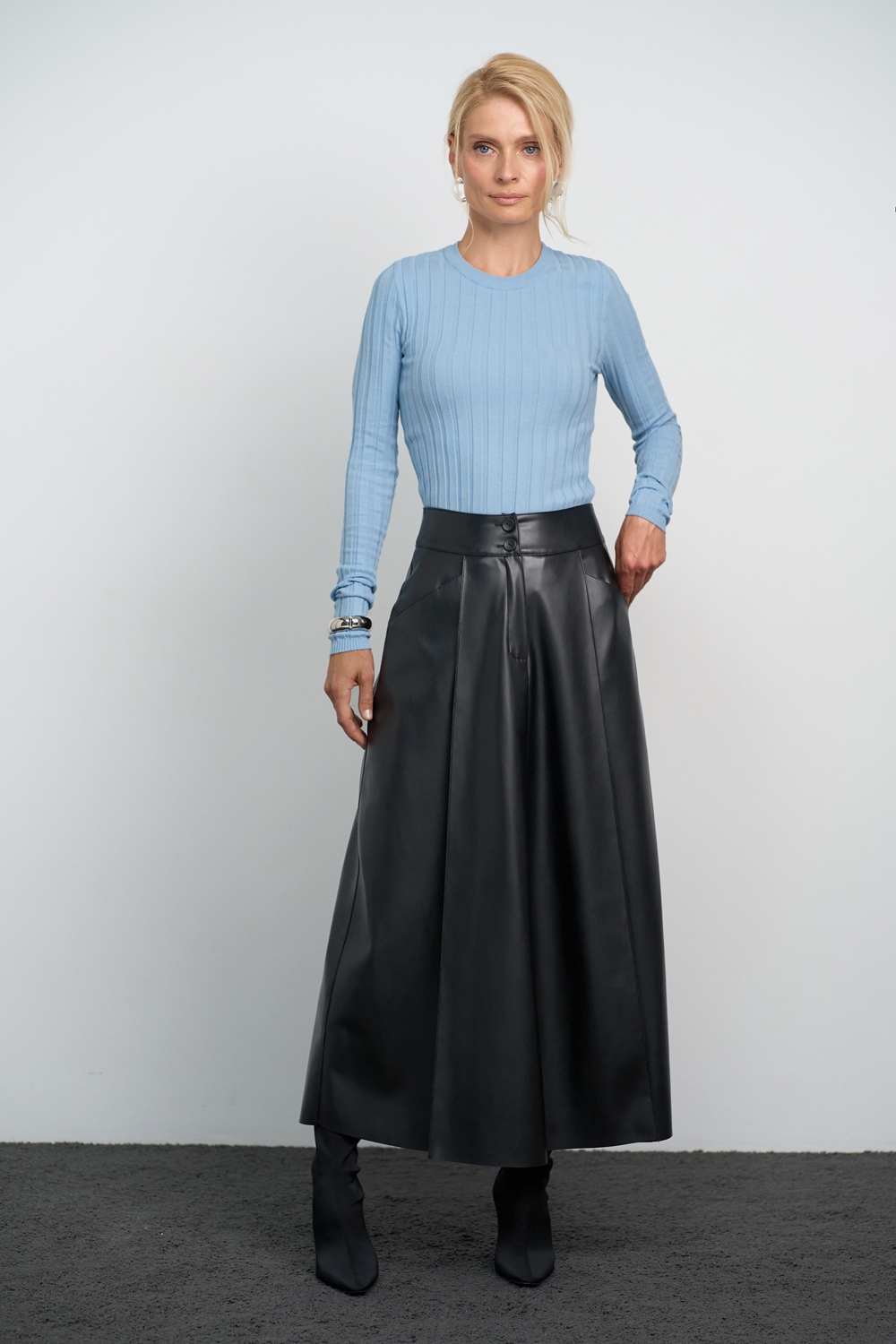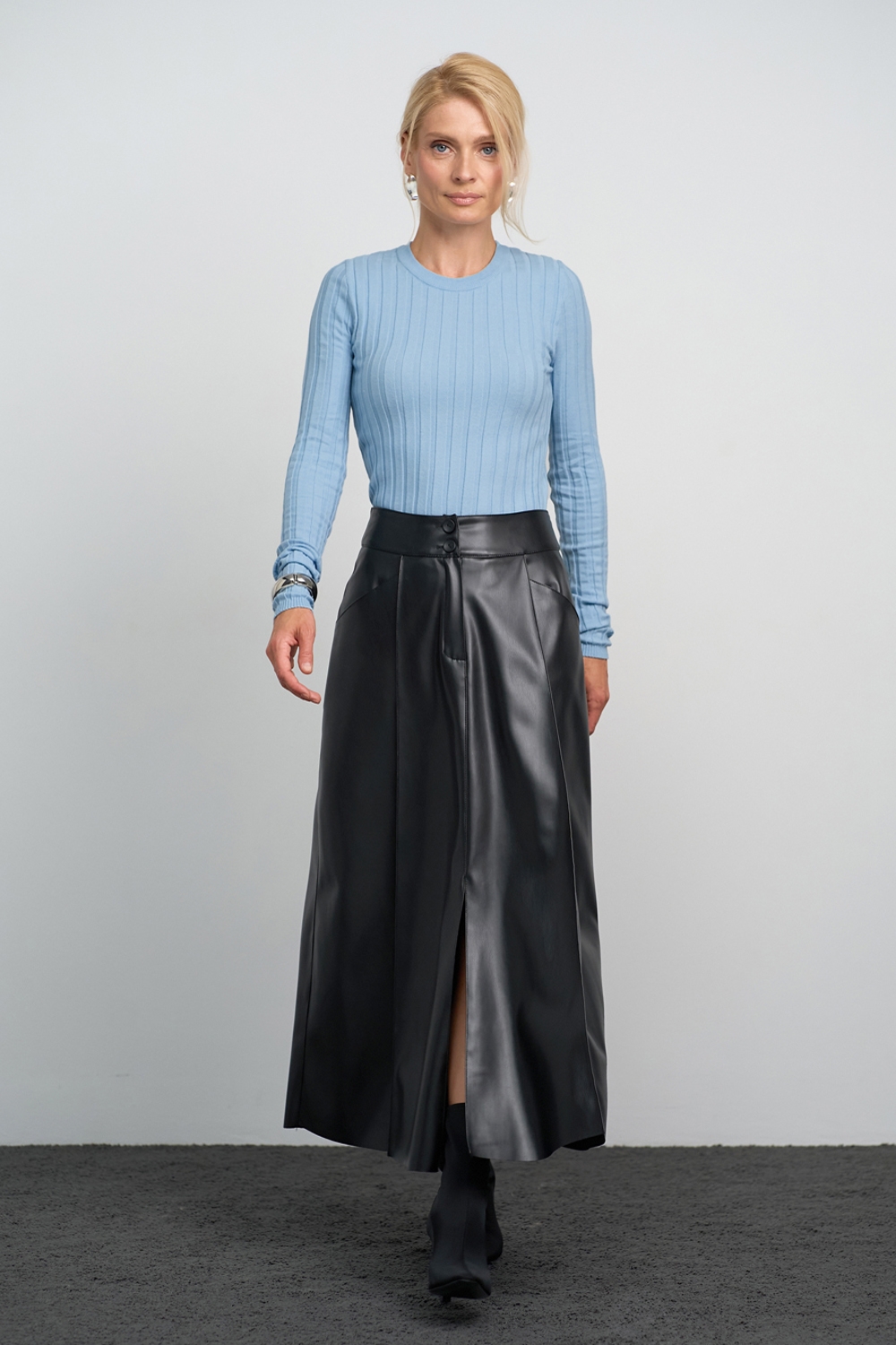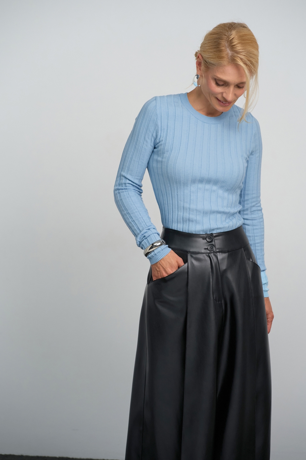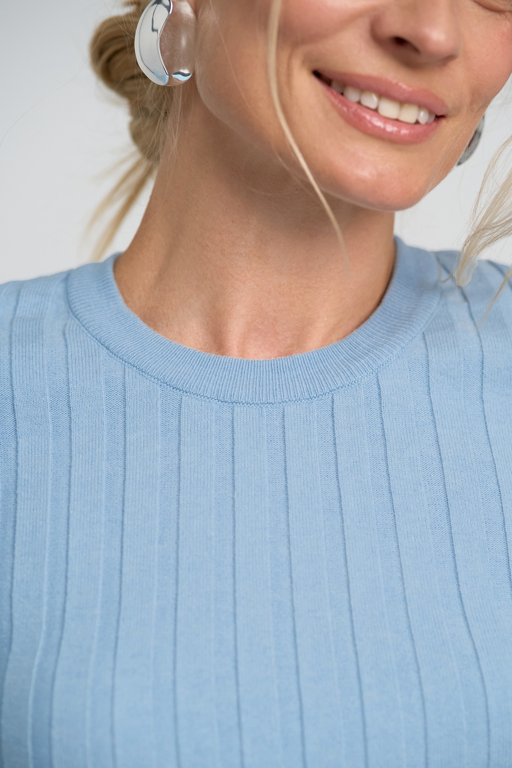 Витончений лонгслів зі стабільної в’язки зі шовковистої бавовняно-бамбукової пряжі. Модель еластична, м’яко прилягає до фігури. Фактурні вертикальні смужки візуально подовжують силует.