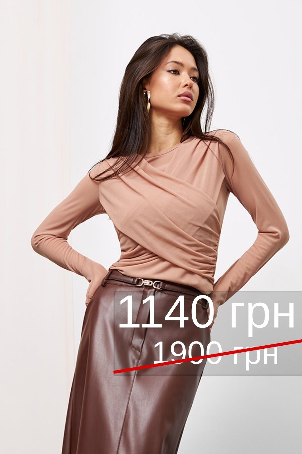 Лонгслів з ніжної приємної на дотик тканини-сітки. Симетричне драпірування по ліфу. Тонкий еластичний виріб напівприлеглого силуету.