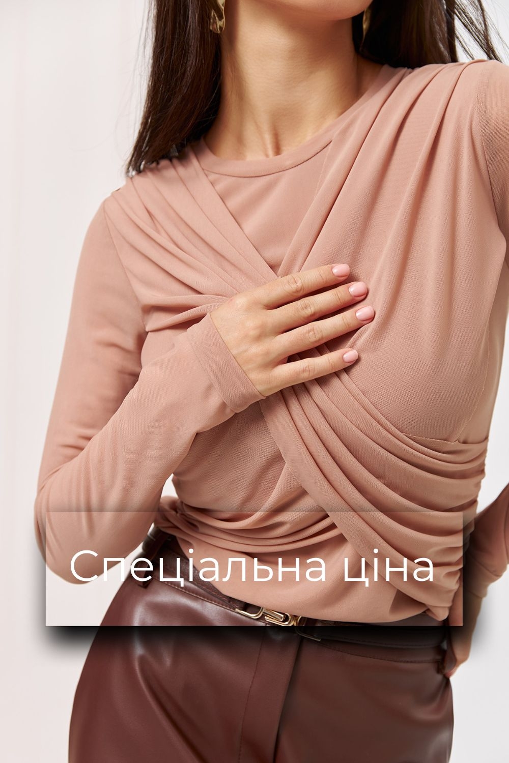 Лонгслів з ніжної приємної на дотик тканини-сітки. Симетричне драпірування по ліфу. Тонкий еластичний виріб напівприлеглого силуету.